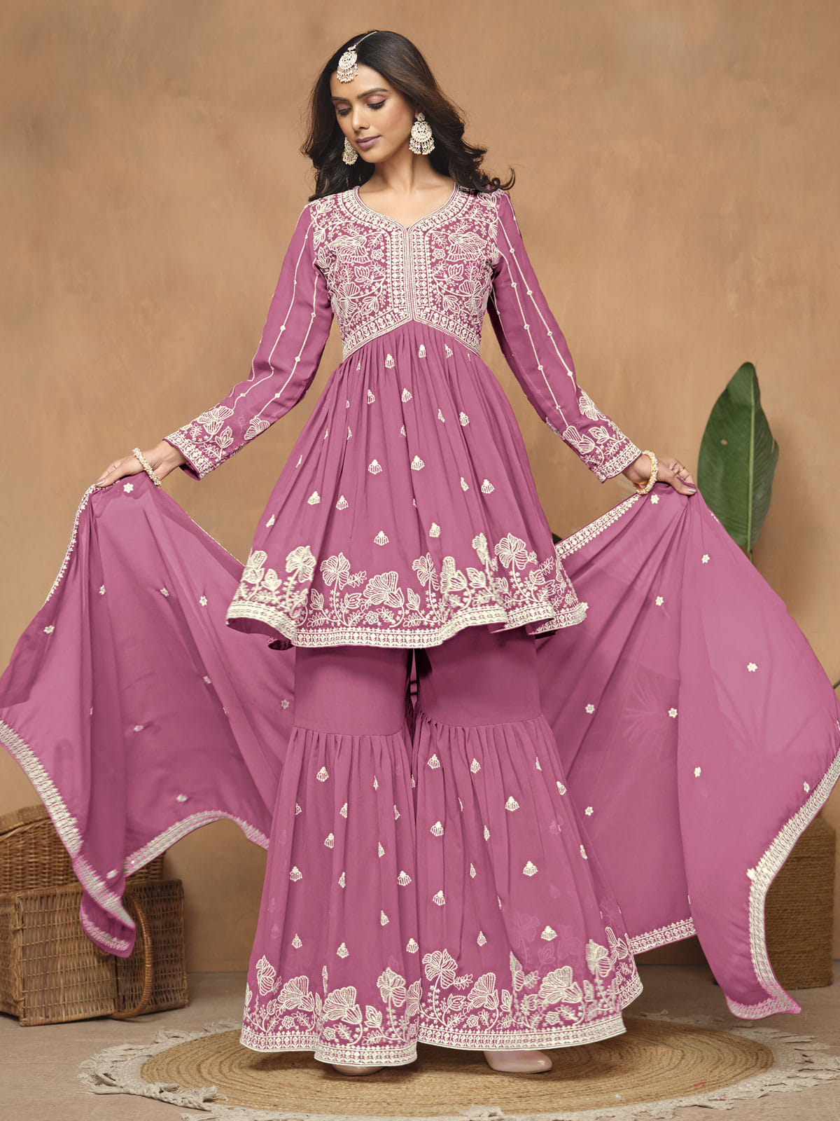 Elevate your style with our Festive Style Flamingo Pink Embroidered Gharara Suit! Made with luxurious faux georgette material, this suit features intricate thread and sequin embroidery, adding a touch of elegance to any occasion. Pair it with traditional jewelry and accessories for a complete look. From Inddus.