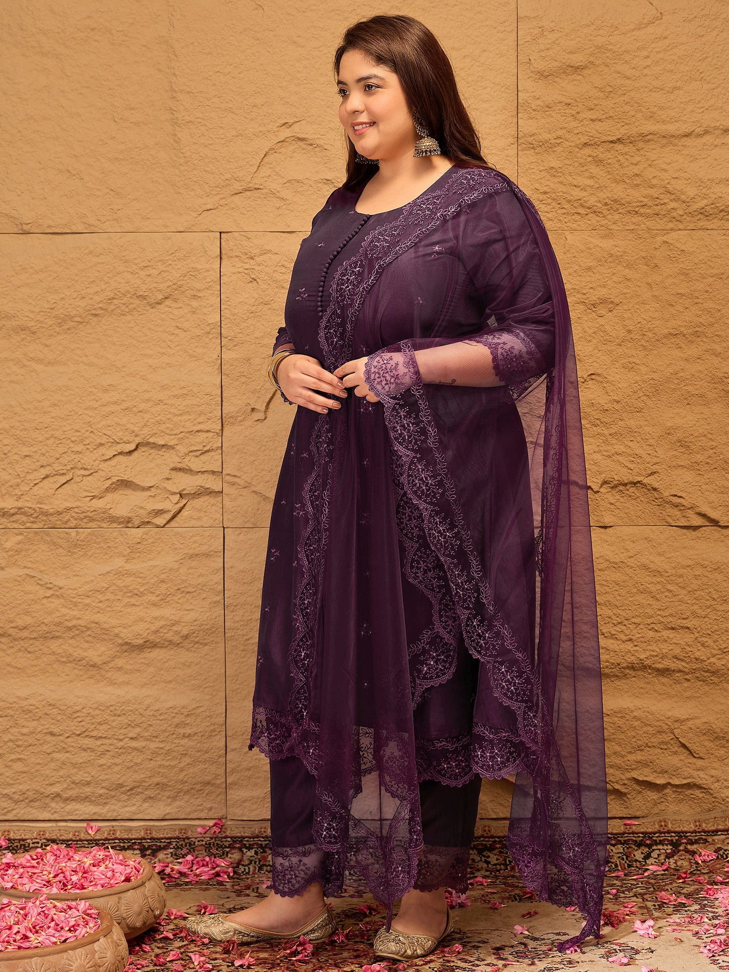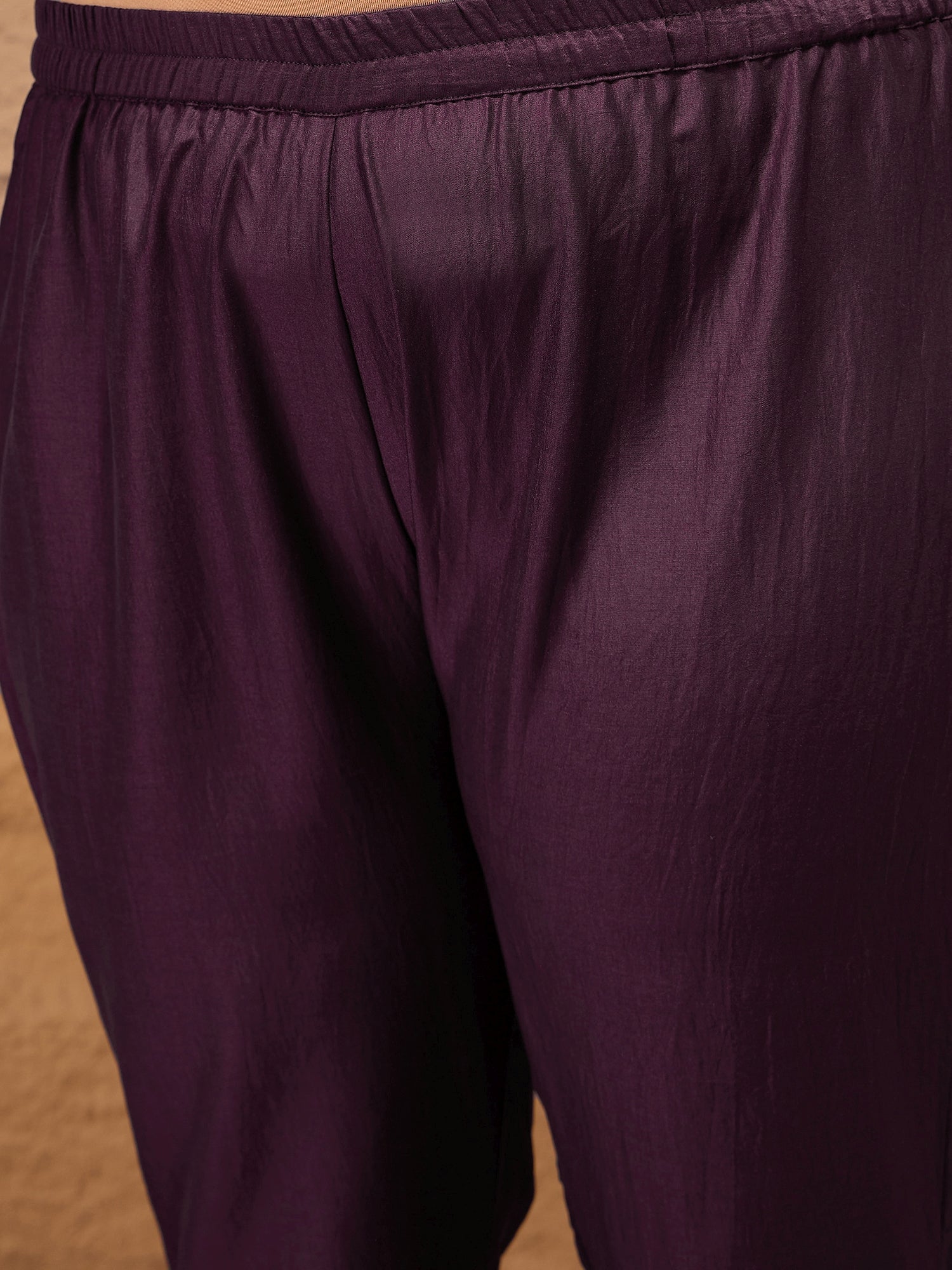 Elevate your style with our Floral Embroidered A-Line Kurta set. Made with a luxurious silk blend fabric, the purple Kurta features a round neck and three-quarter sleeves, adorned with intricate floral embroidery. The coordinating embroidered trousers have a partially elasticated waistband for comfort, while the dupatta with taping border adds the perfect finishing touch. Perfect for any occasion, this set is a must-have for your wardrobe.