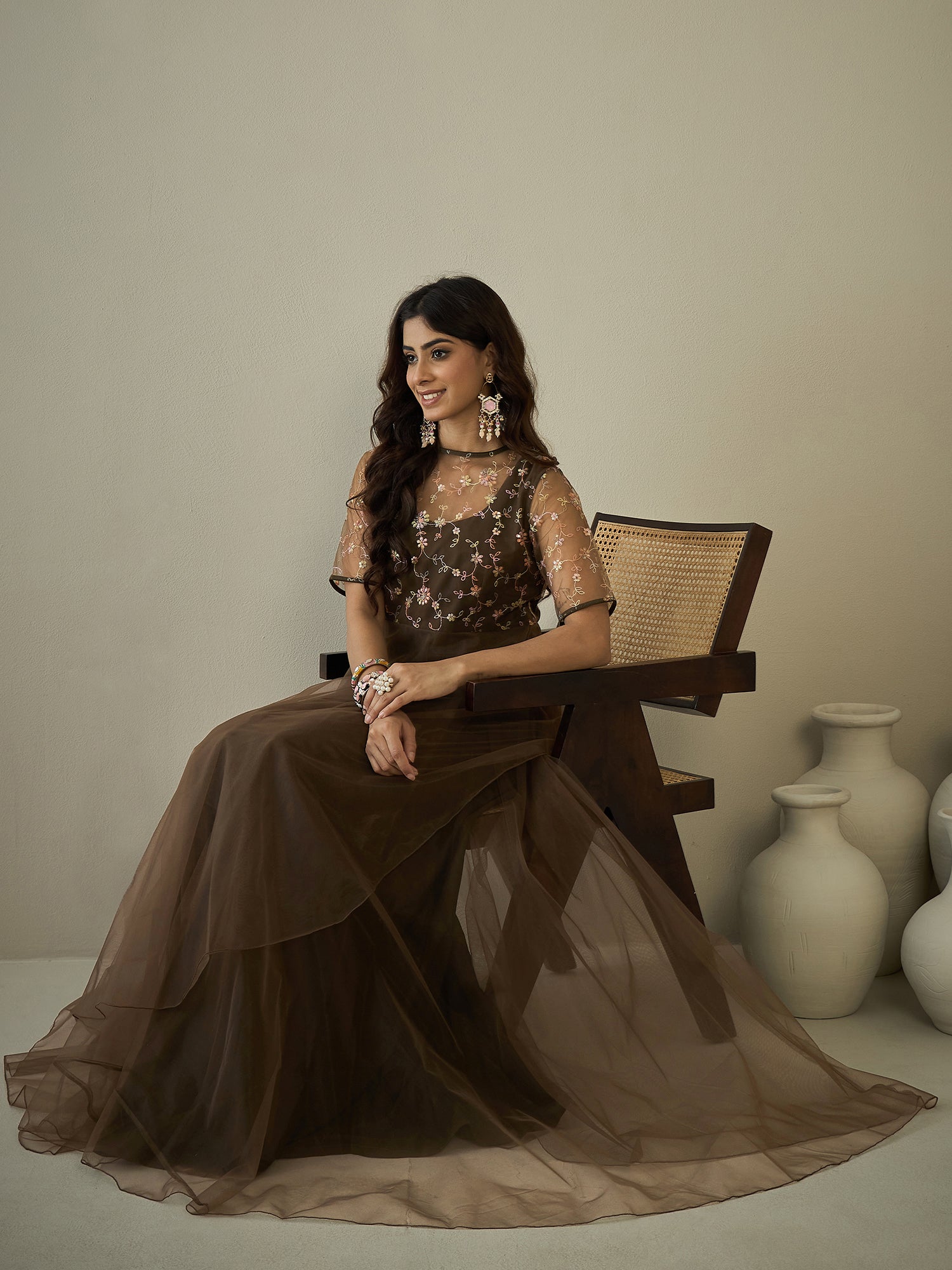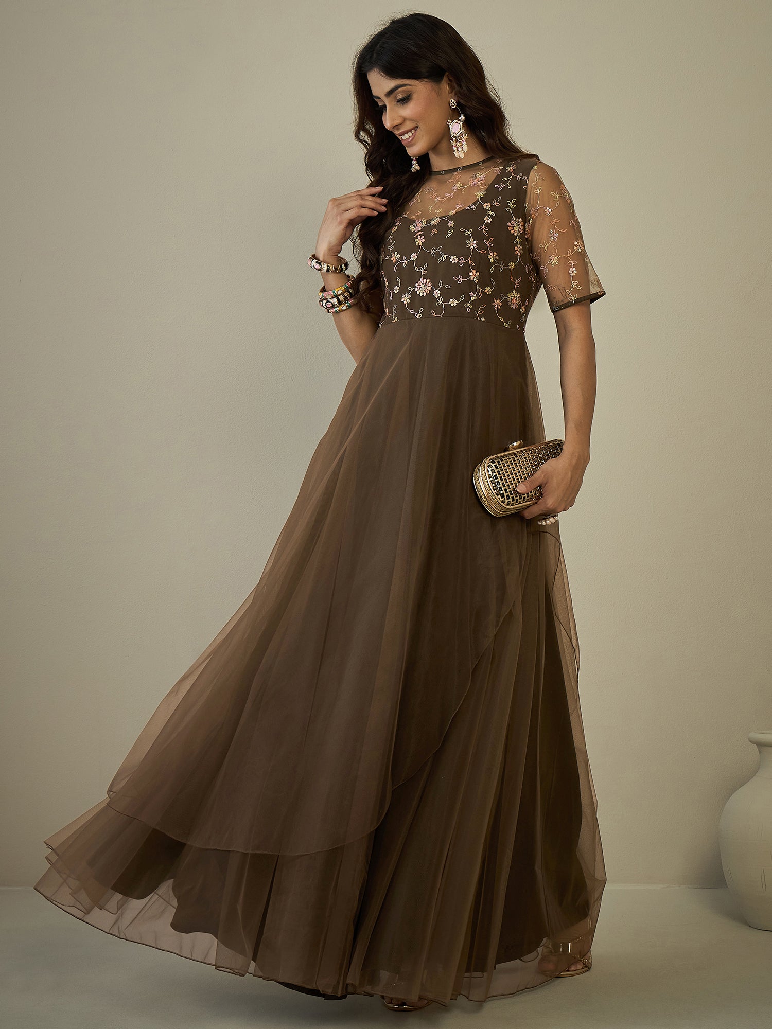Experience the beauty of traditional embroidery with our Floral Embroidered A-Line Maxi Ethnic Dresses. Featuring an olive-green color, this A-line dress offers a flattering silhouette with a round neck and short sleeves. Made with high-quality polyester and net fabric, it's perfect for special occasions. Simply slip it on and feel effortlessly stylish. Dry clean only.