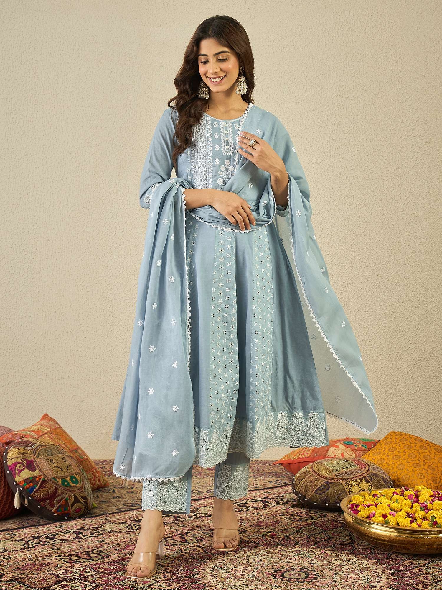 Elegant blue and white embroidered Anarkali kurta set featuring intricate Chikankari detailing. The kurta showcases floral embroidery with a graceful flared hem, paired with embroidered trousers featuring a partially elasticated waistband for comfort. Includes a beautifully embroidered dupatta with taping border. Crafted from soft cotton blend fabric, this three-piece ensemble offers timeless ethnic style perfect for celebrations and special occasions. Round neckline with three-quarter sleeves ensures ease of wear. Machine washable cotton blend construction. Model wears size S at 5'8" height.