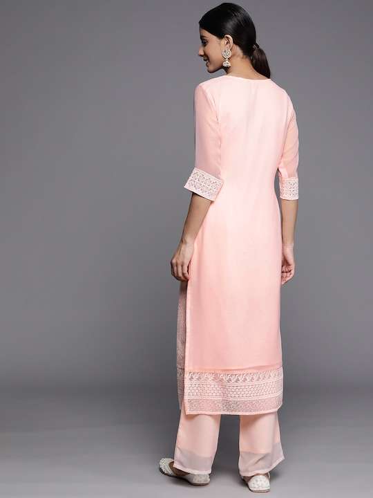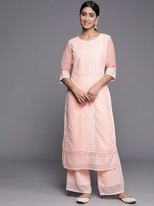 This ensemble features a peach-coloured Kurta with a floral embroidery design. The Kurta has a straight cut with a round neck and 3/4 length sleeves, boasting intricate Chikankari details. The calf-length hemline features a straight trim and the Poly georgette fabric is machine-woven. The Palazzos feature a solid design with a partially elasticated waistband and a hook-and-eye closure.