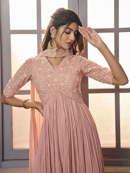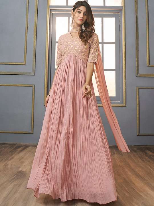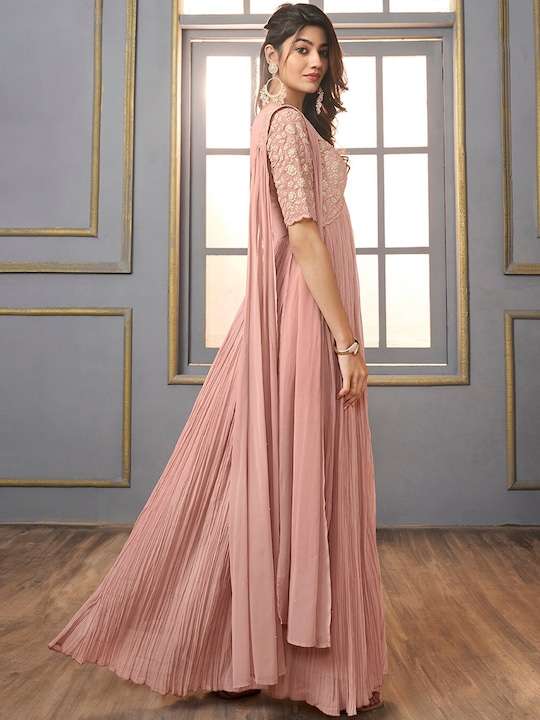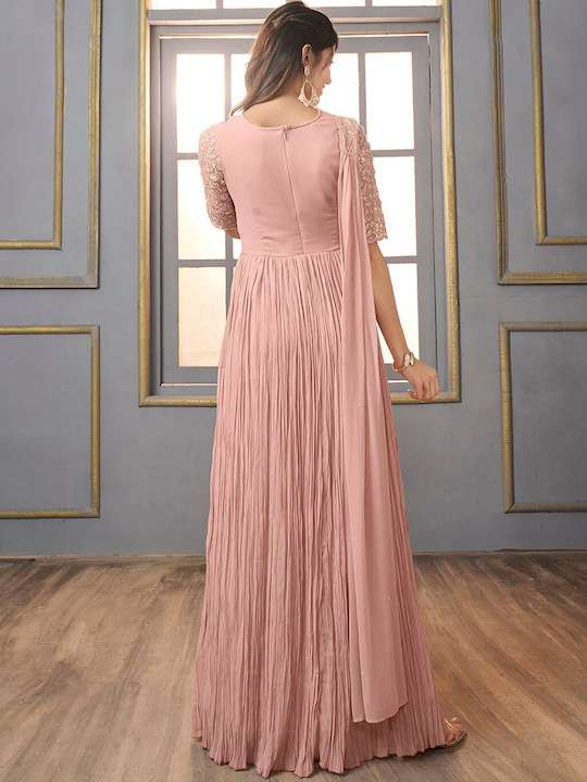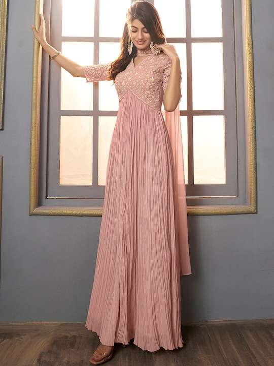 This pink georgette dress brings sophistication to your ethnic wardrobe. Its shirt collar, short regular sleeves, and maxi shape with empire style create a timelessly elegant look. Enhance this look with the intricate mirror work detail and a flared hem, perfect for any special occasion.