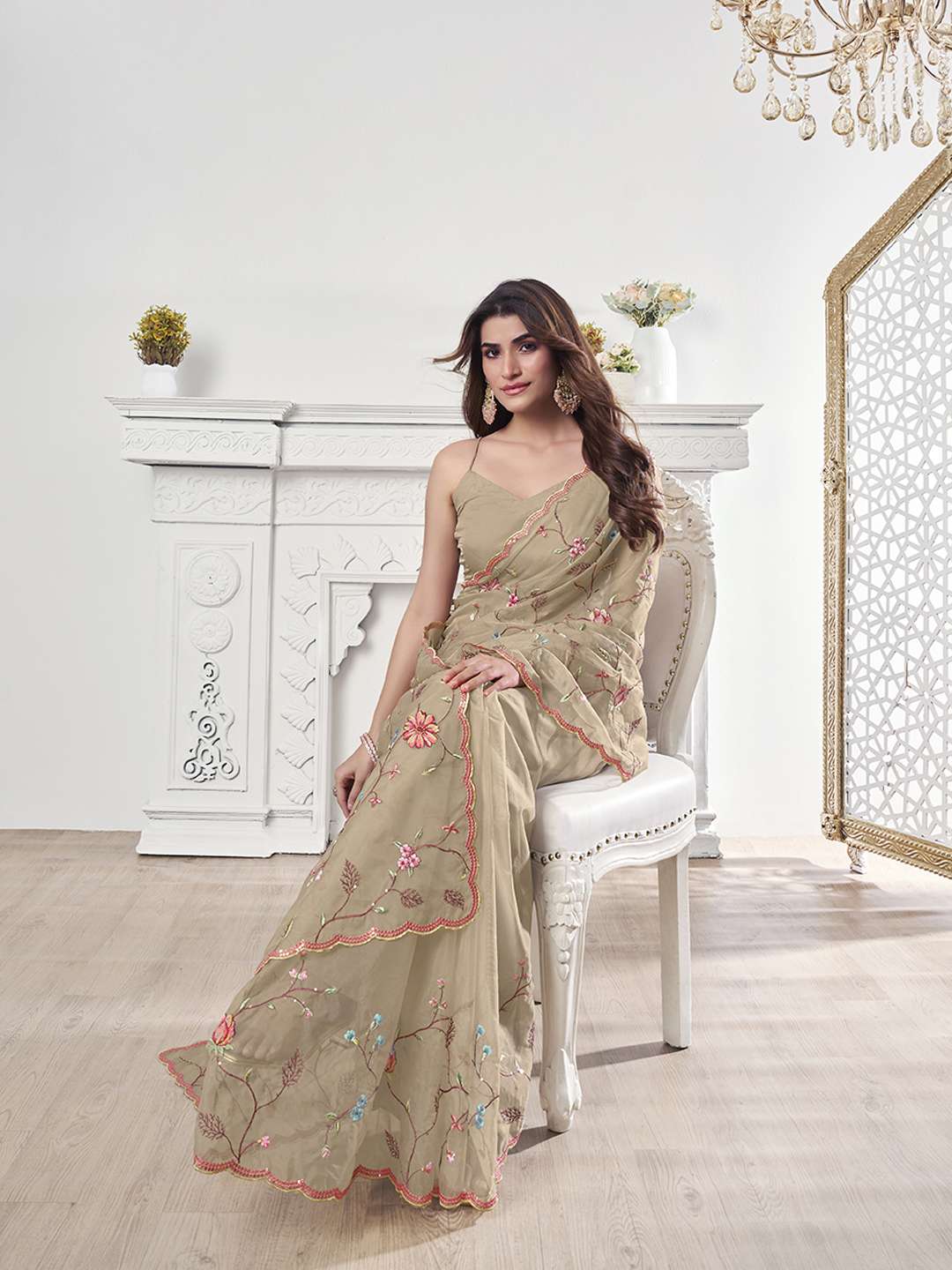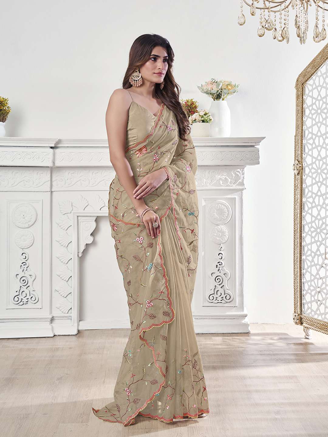 Elevate your ethnic style with our Floral Embroidered Organza Heavy Work Saree. Featuring a beautiful combination of beige and red, this saree boasts intricate floral embroidery on the body and border, creating a stunning and elegant look. Made from high-quality organza, this saree is perfect for special occasions and events.