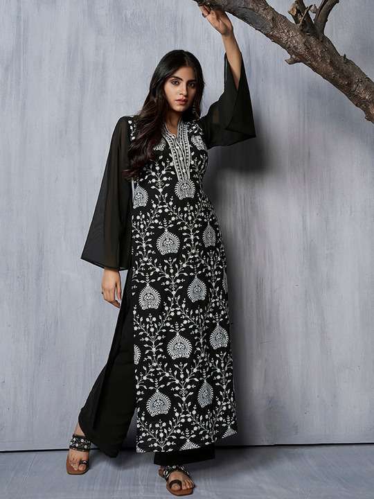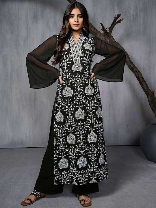 Look stylish and chic in this beautiful floral embroidered georgette straight Kurta paired with solid palazzos. The Kurta features a Pakistani style shape with V-neck, long flared sleeves, and calf length with straight hem. The Palazzos have a partially elasticated waistband and slip-on closure for a perfect fit.