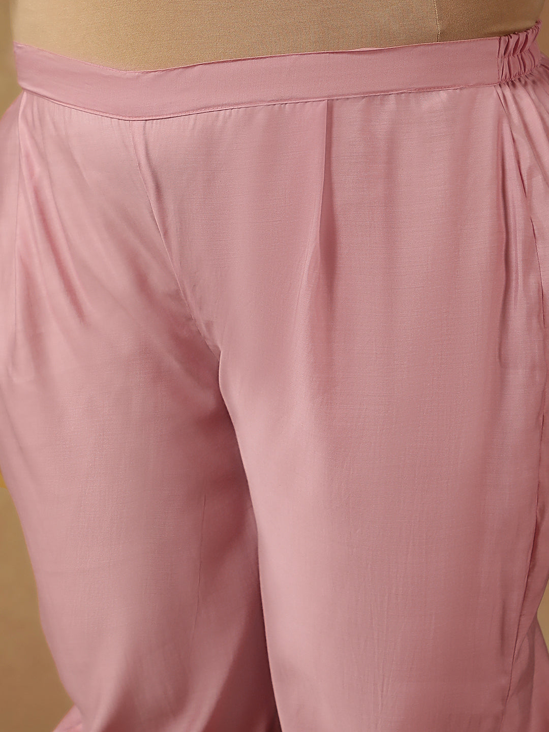 Expertly designed, this pink & silver floral embroidered Anarkali Kurta brings elegance to any occasion. The U-neck, long regular sleeves, and flared hem create a flattering silhouette. Pair it with solid Trousers and a beautifully embroidered dupatta for a complete ethnic look. Made with high-quality net fabric, it is both comfortable and stylish.