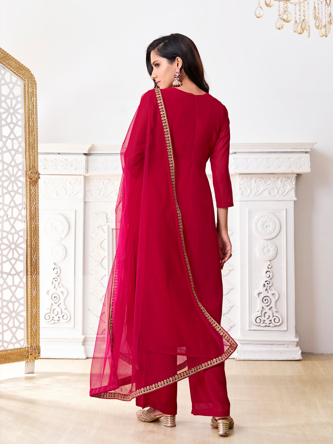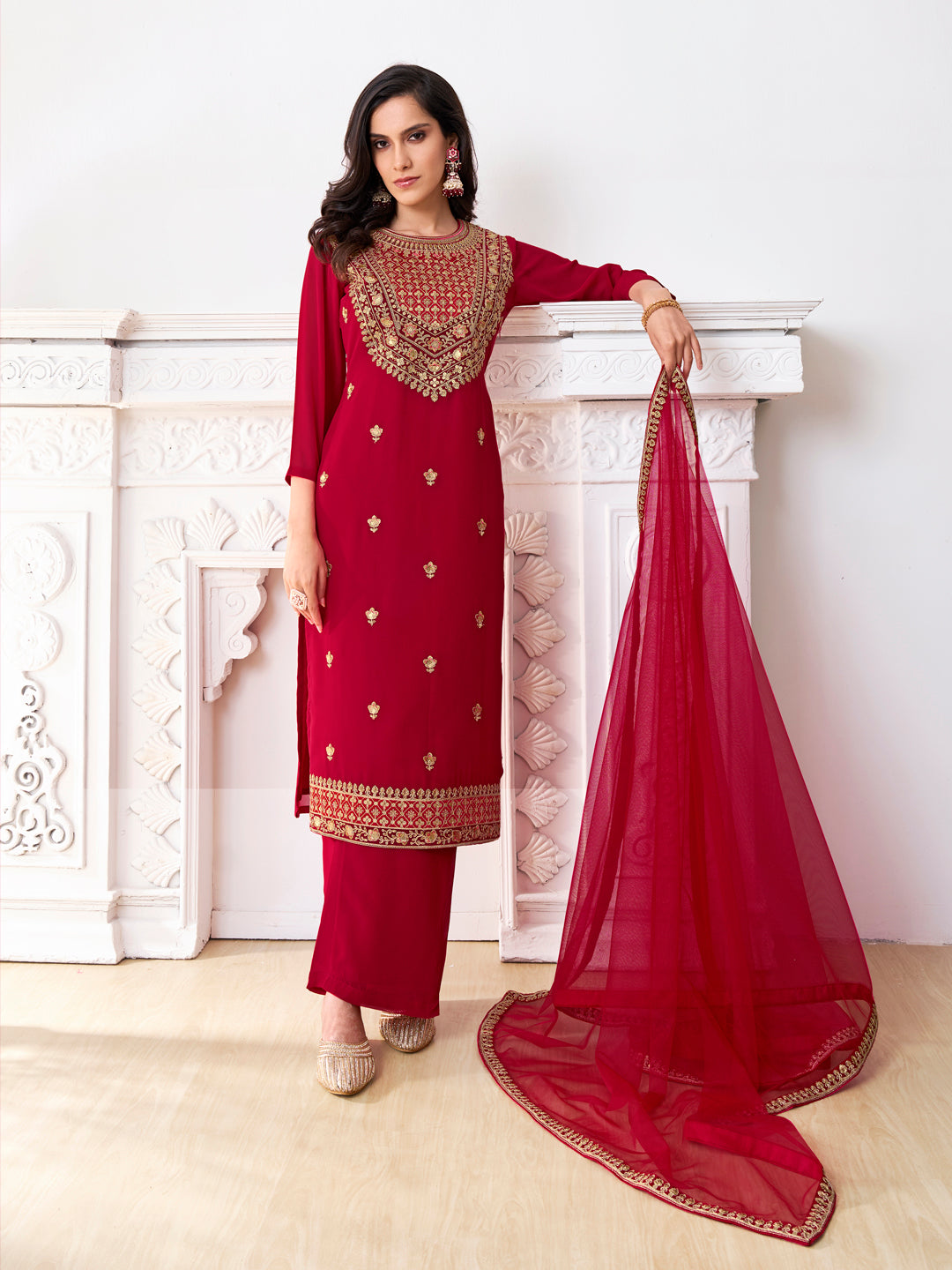 Elevate your traditional wardrobe with our floral embroidered kurta set. The red and gold tones, sequinned detail, and georgette fabric exude elegance and style. The straight shape and regular sleeves add a flattering touch, while the solid palazzos and dupatta with taping border complete the look. Perfect for any occasion.