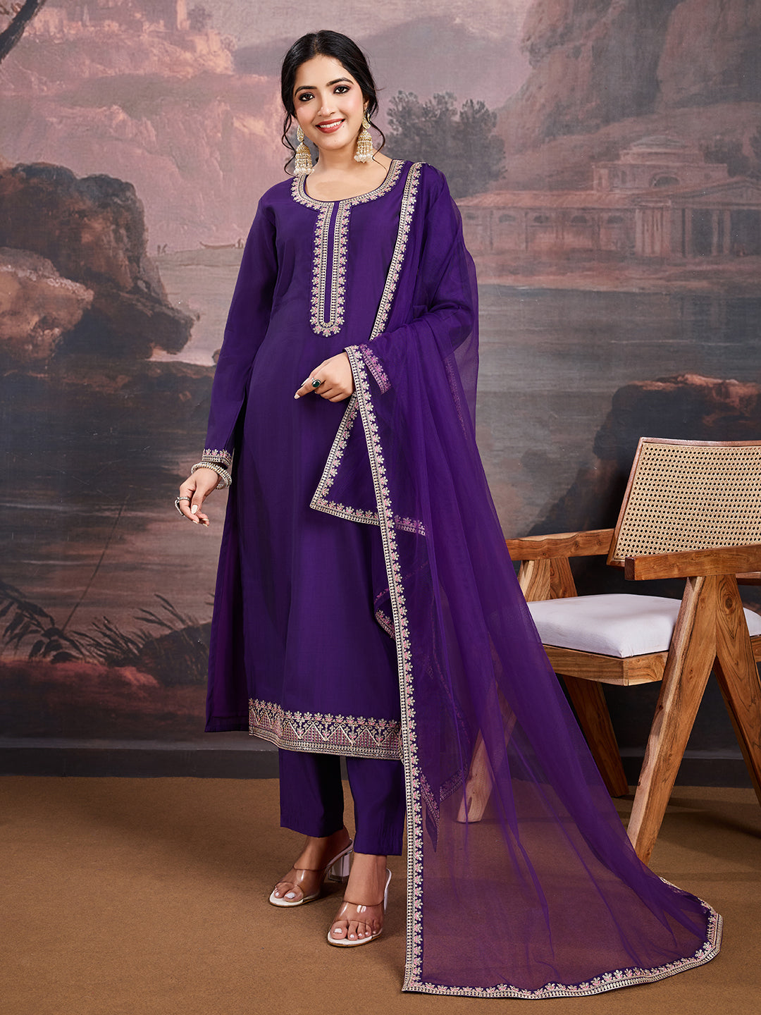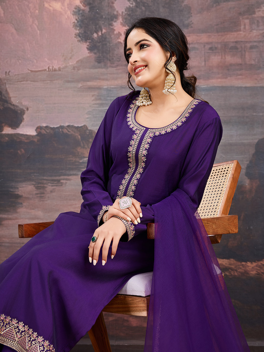Elevate your wardrobe with our Floral Embroidered Kurta Set. The purple and gold-toned kurta features elegant floral embroidery, a round neckline, and long sleeves. The straight-shaped calf-length design is made from a luxurious silk blend for a comfortable fit. The solid trousers have a partially elasticated waistband, while the dupatta boasts beautiful taping on the border. Perfect for any occasion.