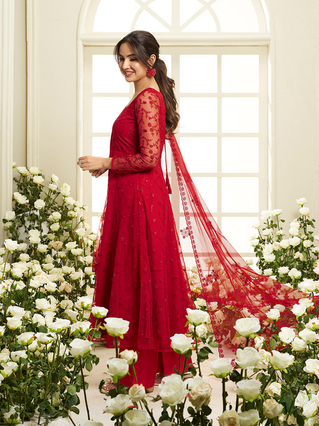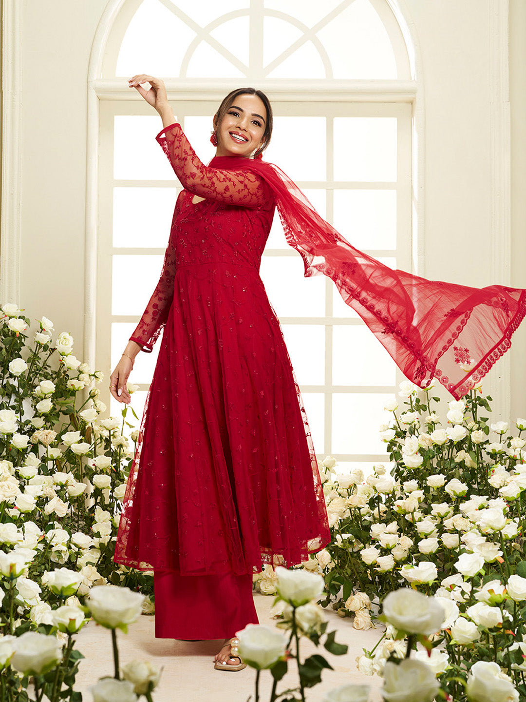 Red and silver-toned embroidered kurta with palazzos and dupatta