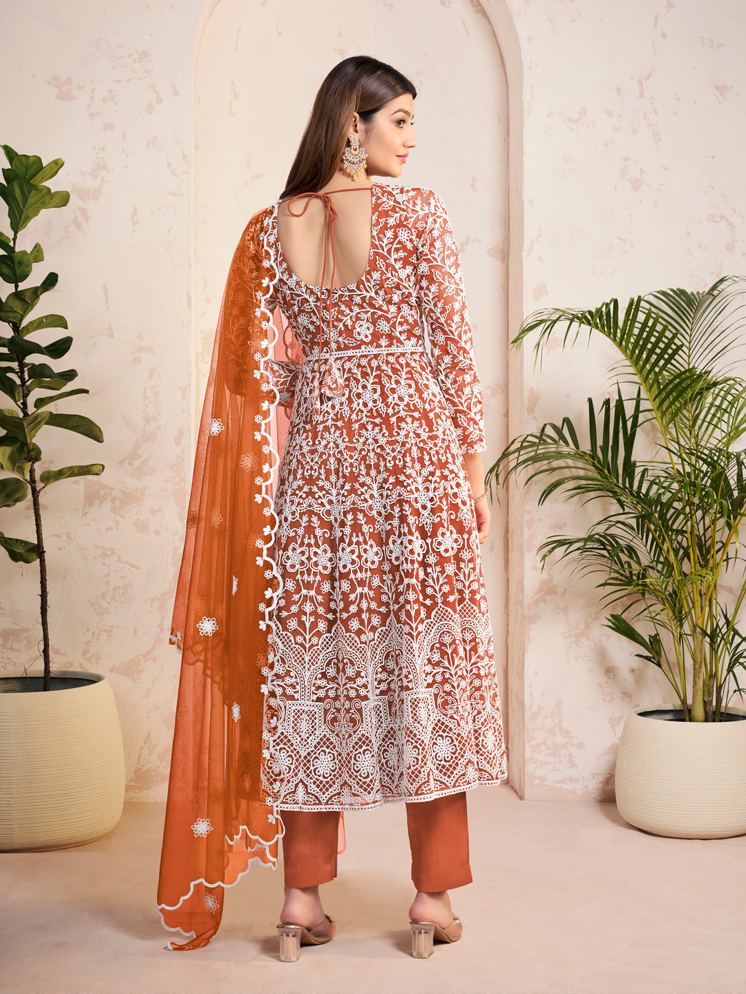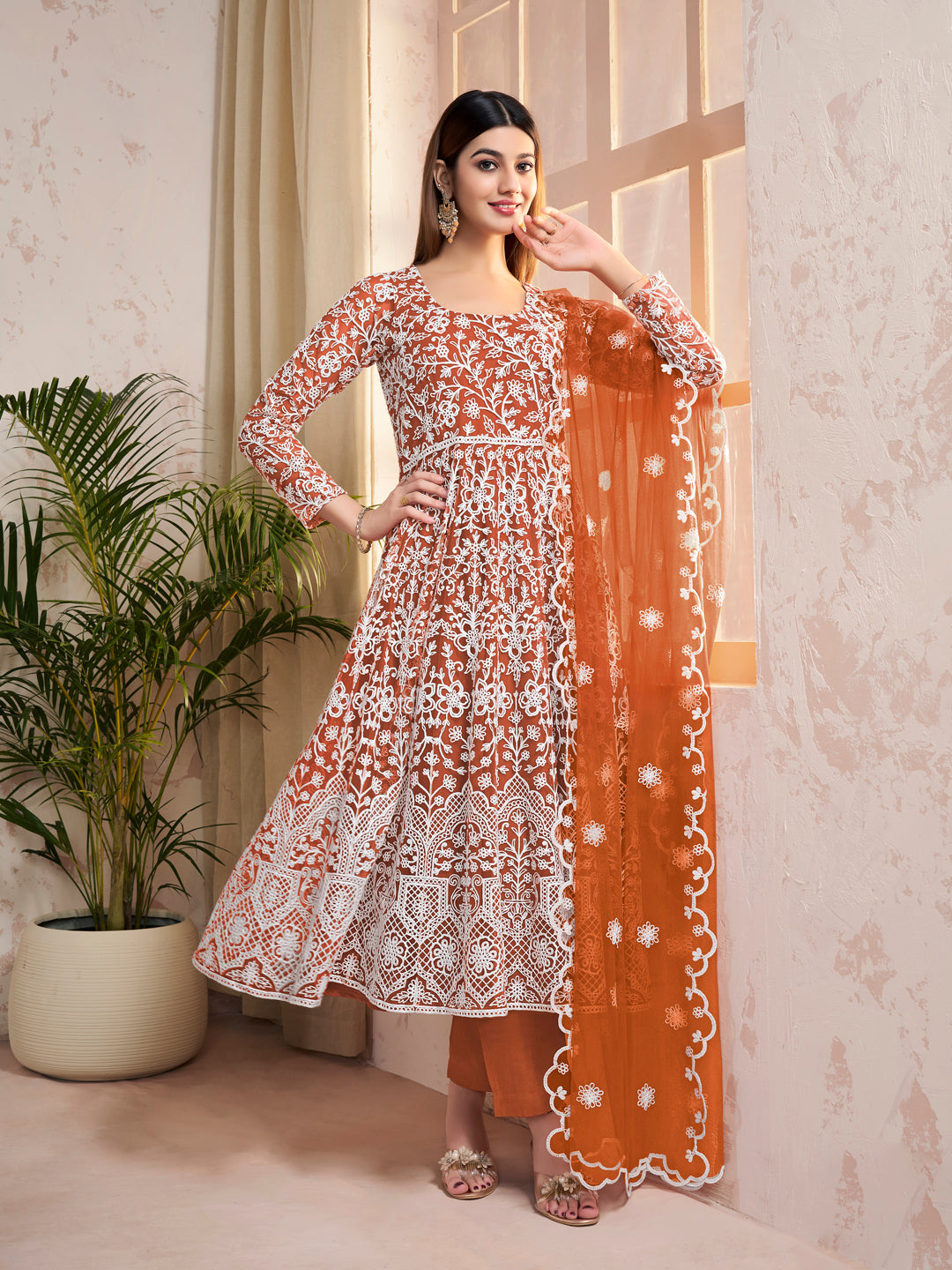 This rust and white embroidered Anarkali kurta set is a stylish addition to your wardrobe. The scoop neck and flared hem create a flattering silhouette, while the net fabric adds a touch of elegance. The solid trouser with an elasticated waistband and embroidered dupatta complete the look. Perfect for any occasion, this set is a must-have for any fashion-forward individual.