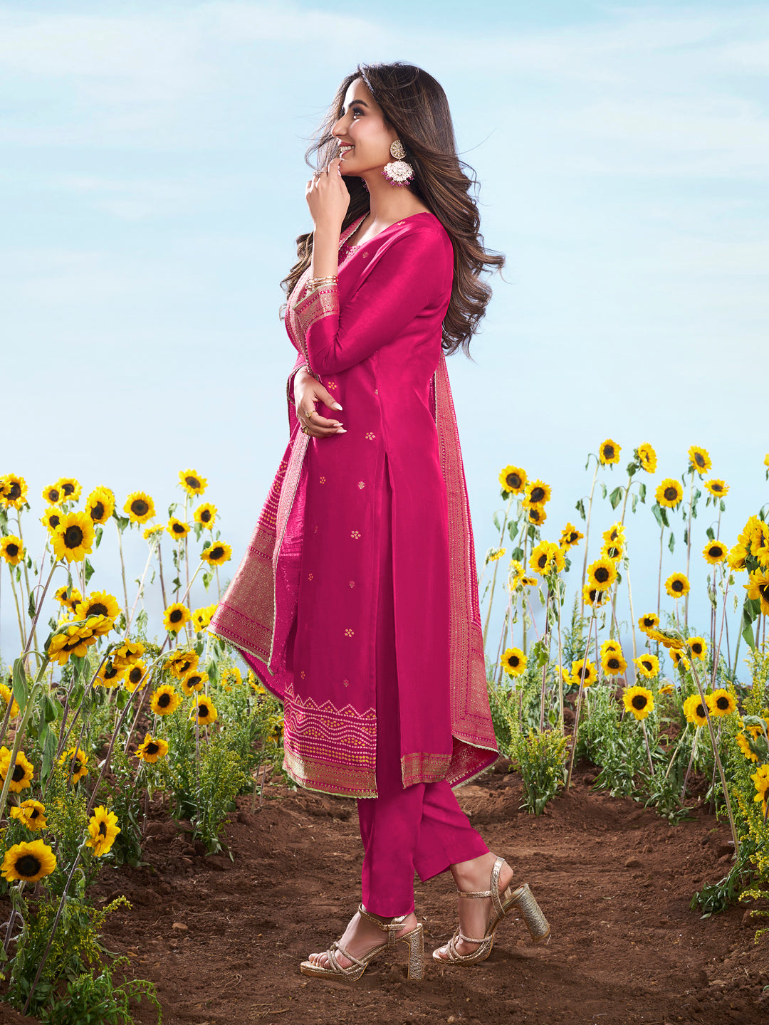 Magenta and gold-toned embroidered Kurta with Trousers with dupatta