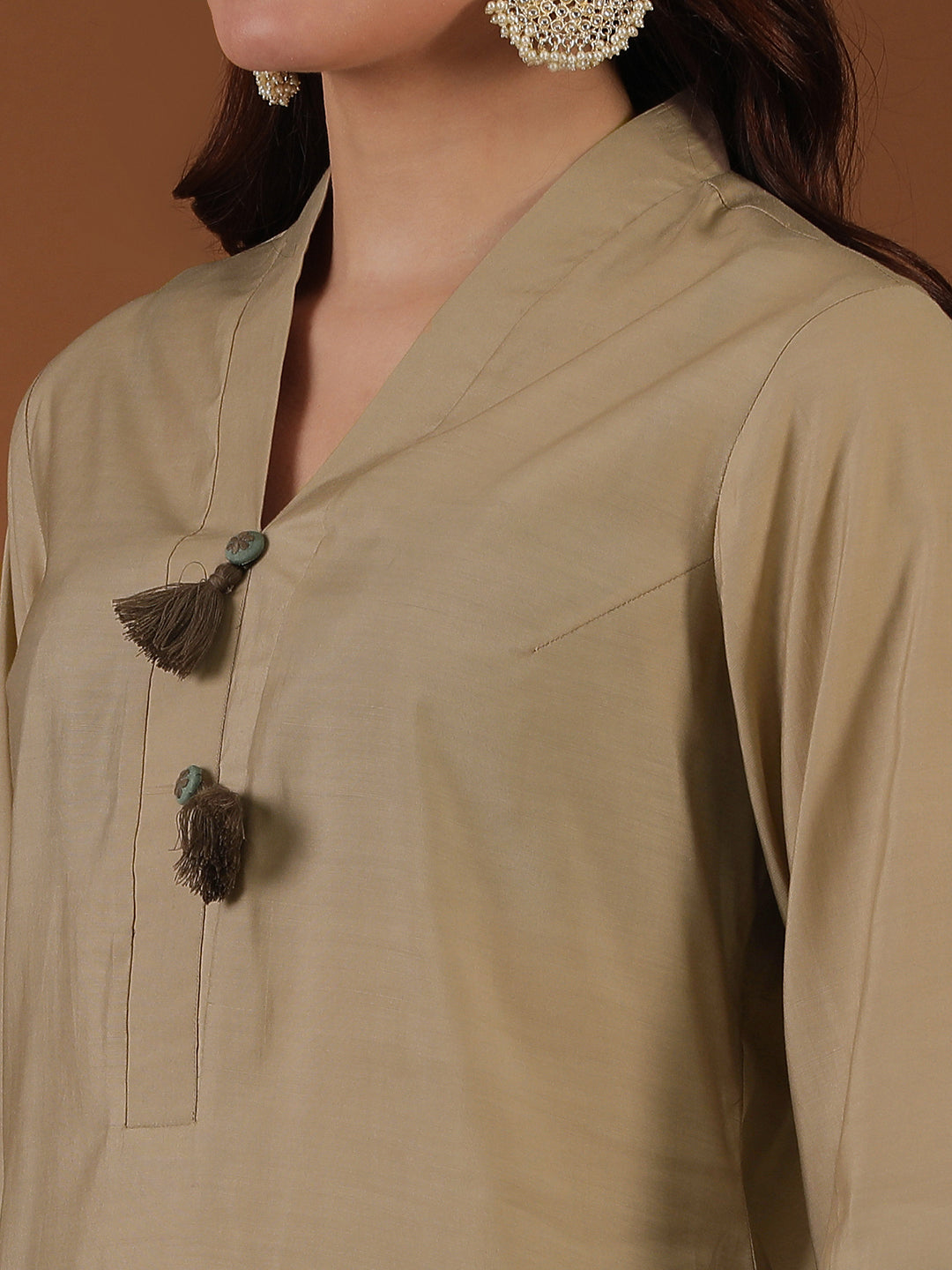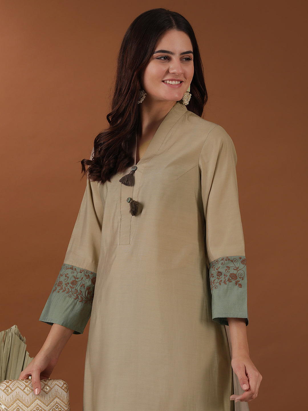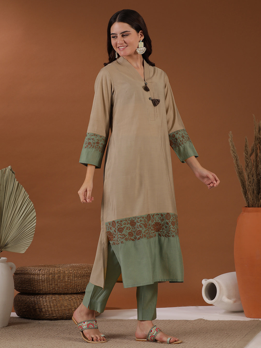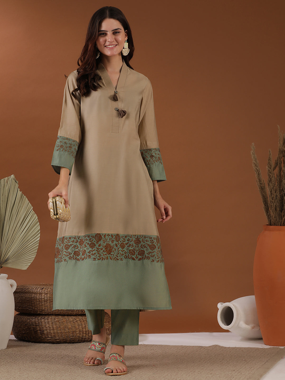 This beige and green embroidered Kurta with Trousers set features a beautiful floral design that adds a touch of elegance. Made from a luxurious silk blend fabric, it's perfect for a formal or special occasion. The Kurta is designed with a V-neck, three-quarter sleeves, and thread work detailing, while the trousers have a partially elasticated waistband for a comfortable fit. Complete the look with the included dupatta. Dry clean only.