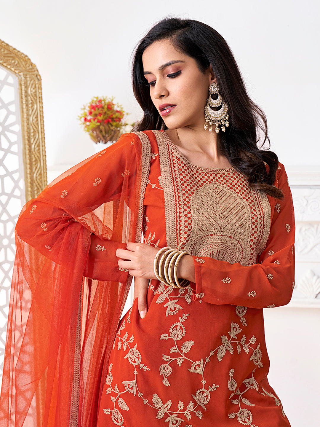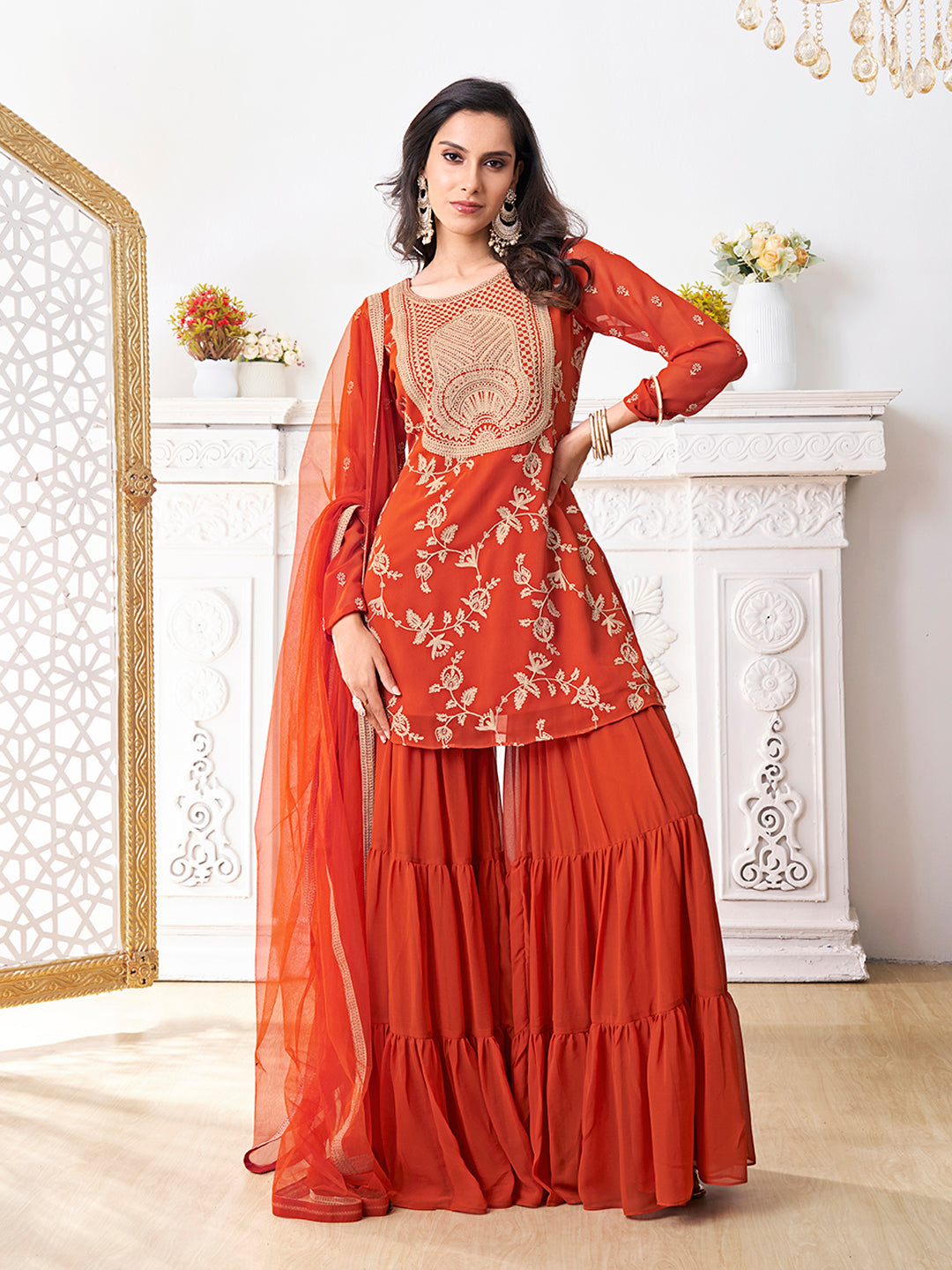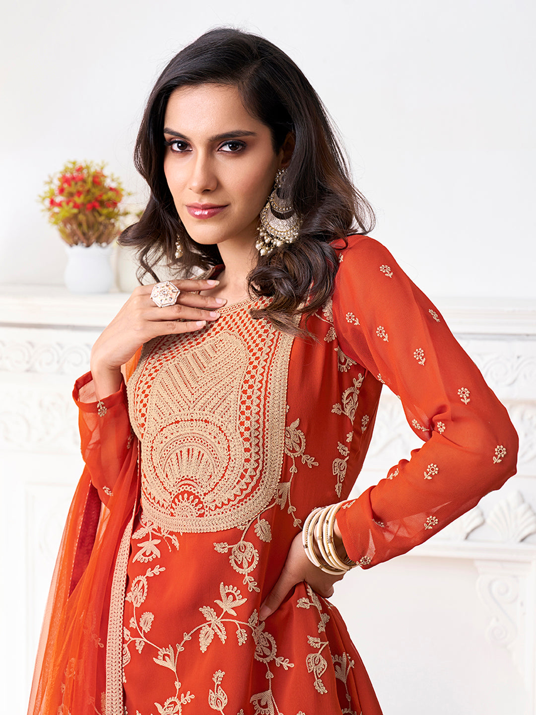 Upgrade your wardrobe with our Floral Embroidered Thread Work Georgette A-Line Kurta. The rust and gold-toned embroidery adds a touch of elegance to the A-line shape, while the thread work detail and round neck elevate the regular style. Paired with a solid Sharara and dupatta with taping border, this kurta is perfect for any occasion.