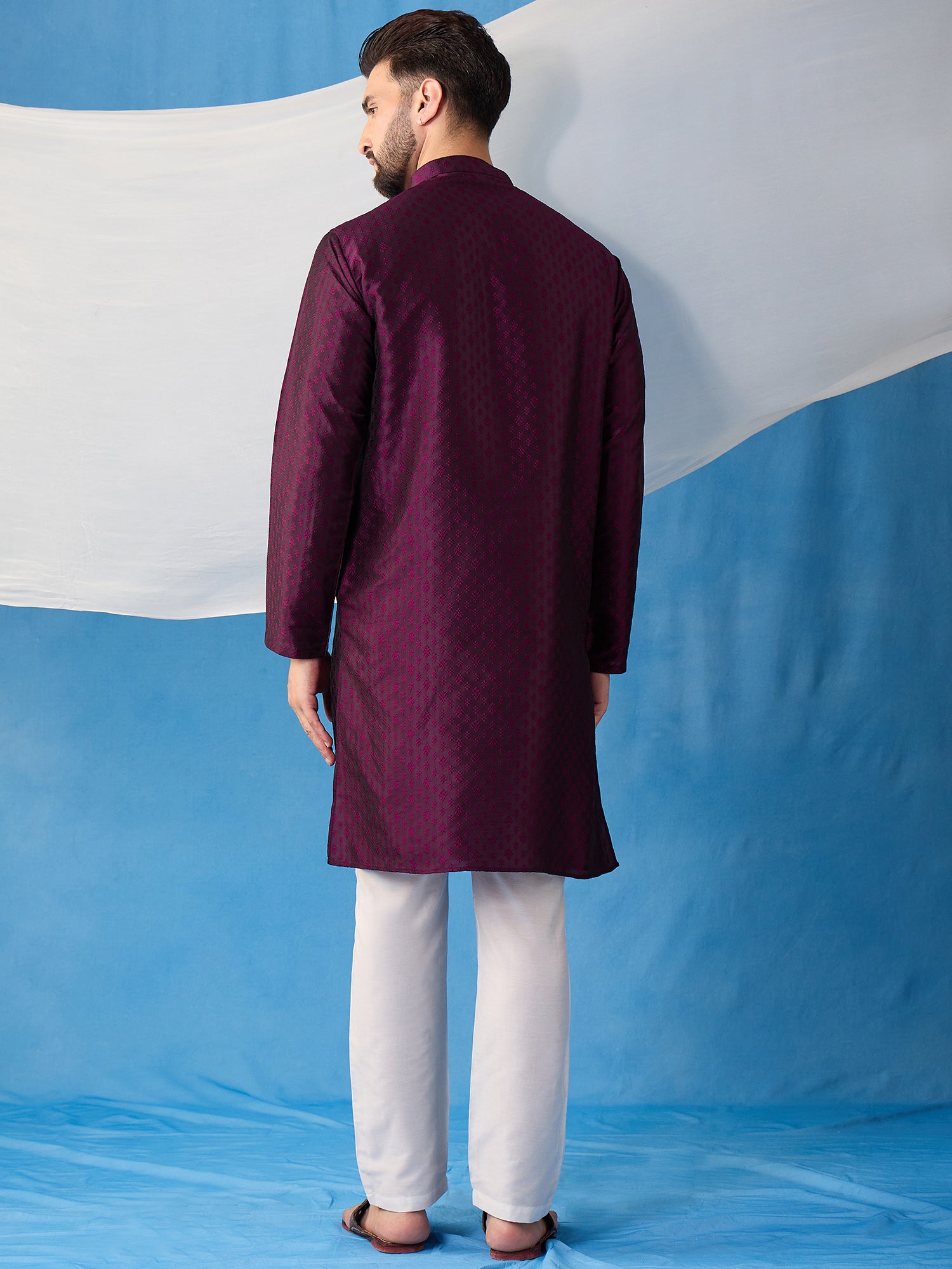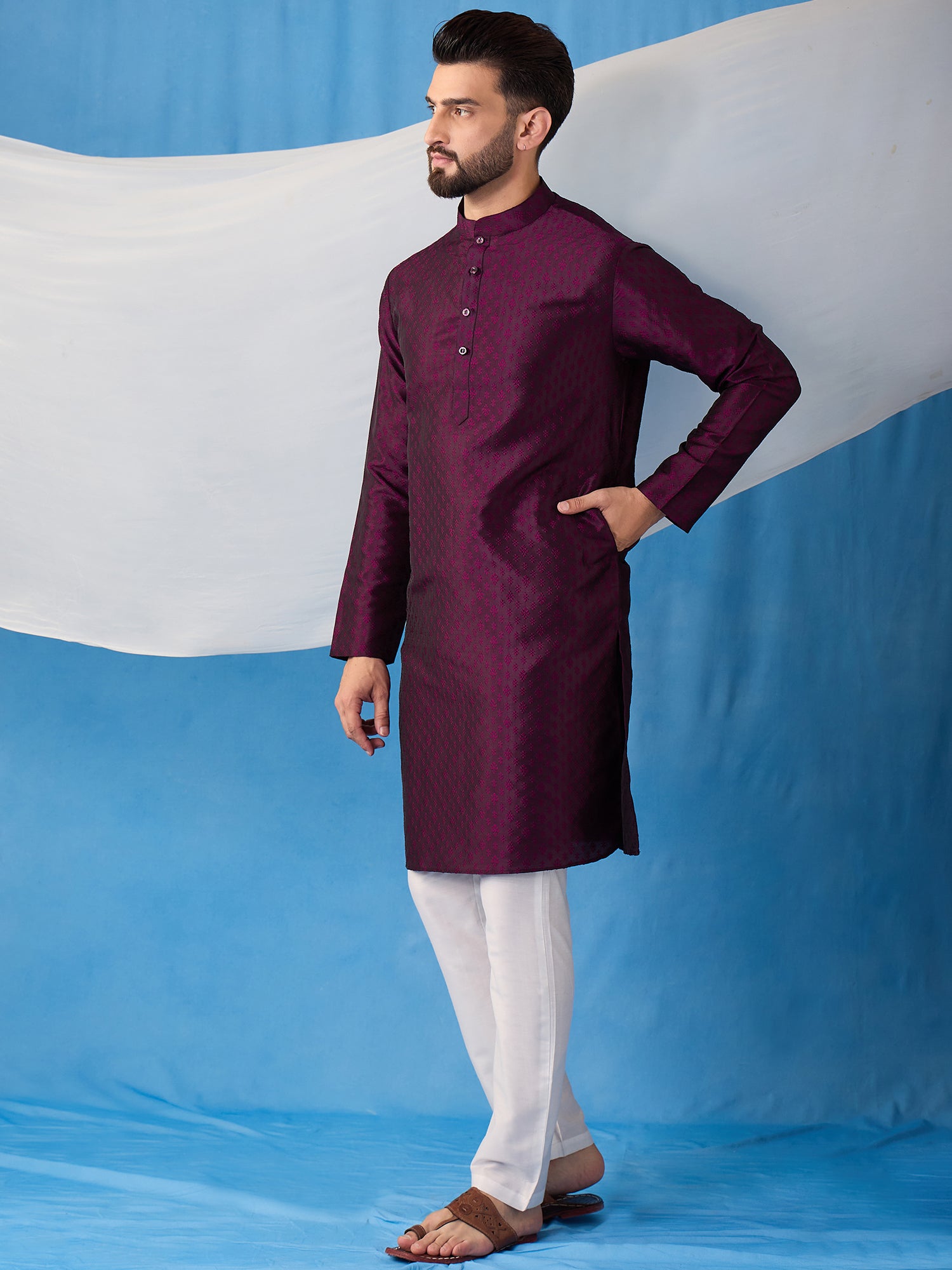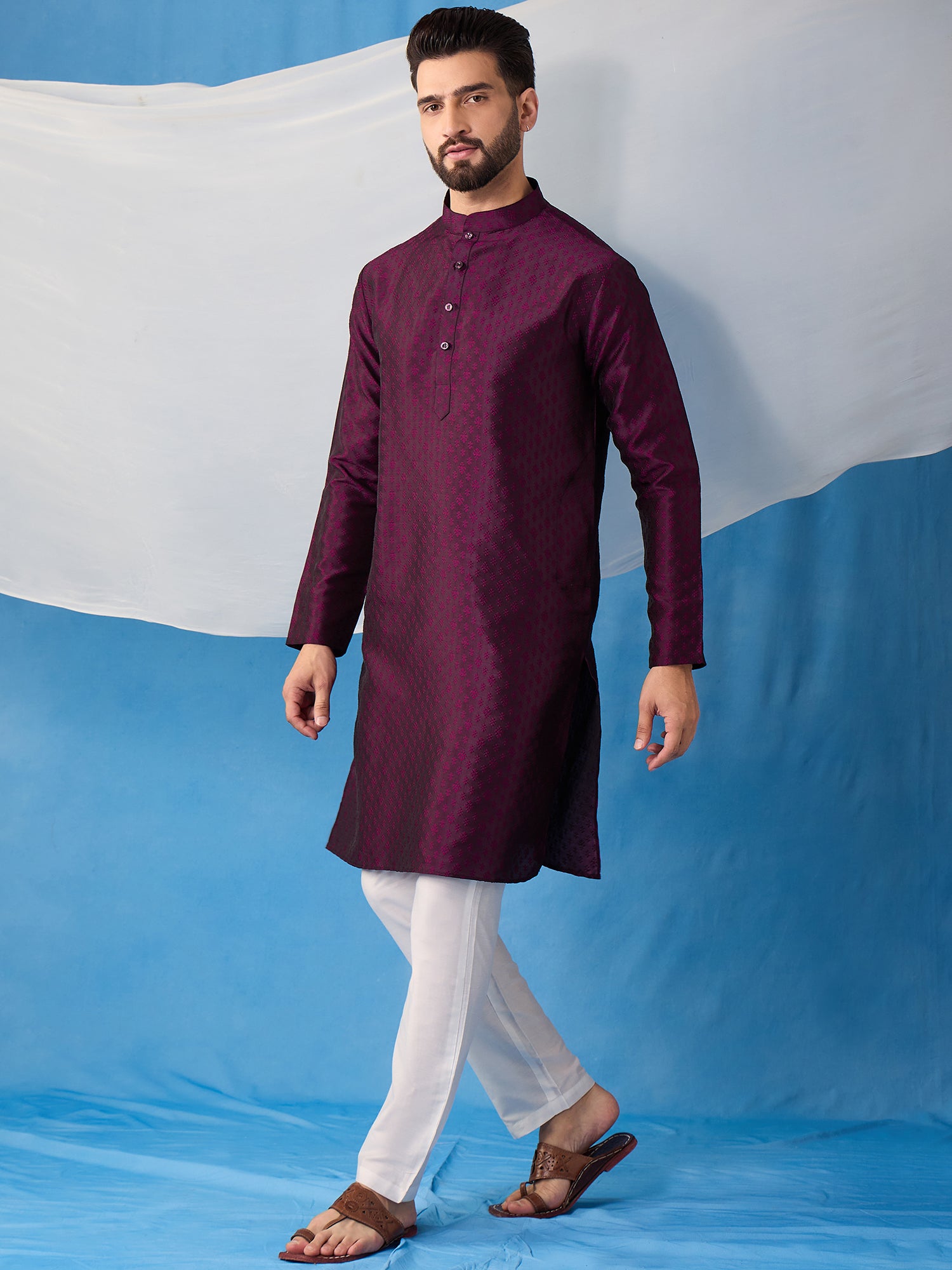 Introducing our beautiful silk blend Kurta and Trousers set. The Kurta features a delicate floral embroidery, a classic mandarin collar, and two pockets with intricate thread work detail. The trousers are solid in color with a partially elasticated waistband, providing both style and comfort. Elevate your wardrobe with this elegant jacquard weave set..