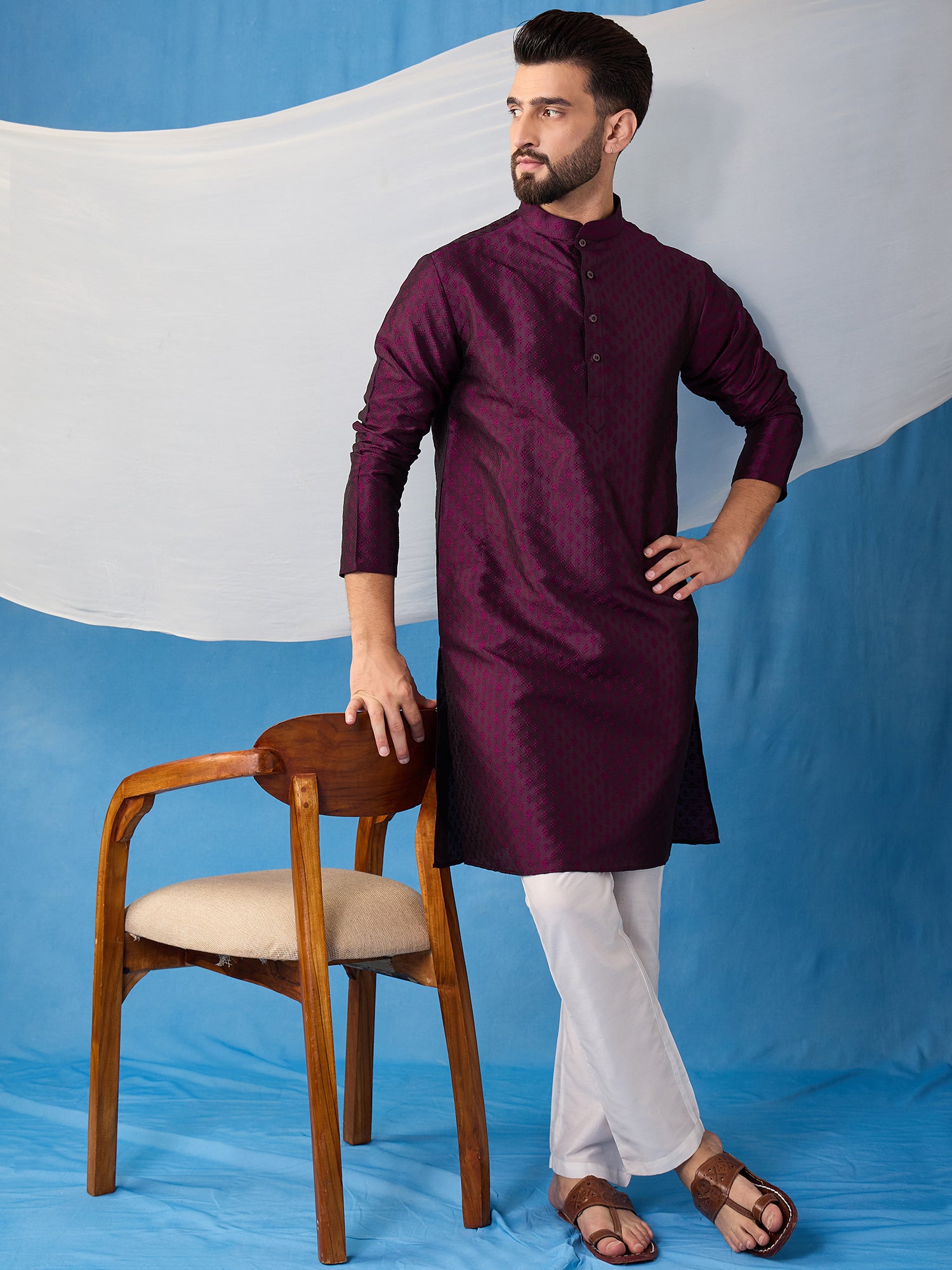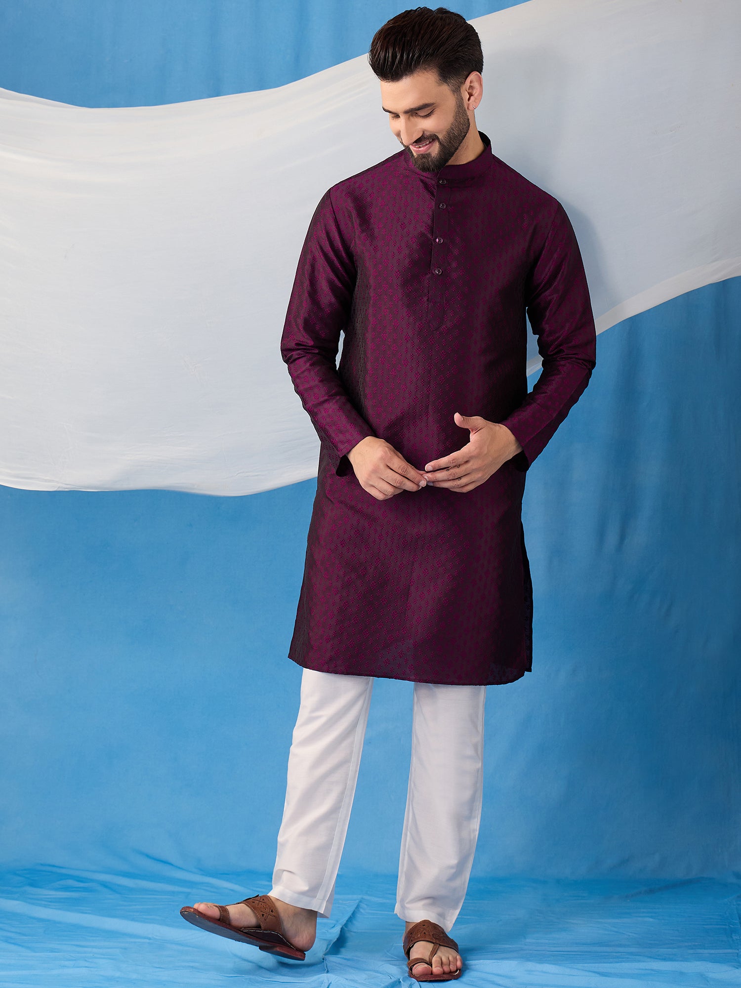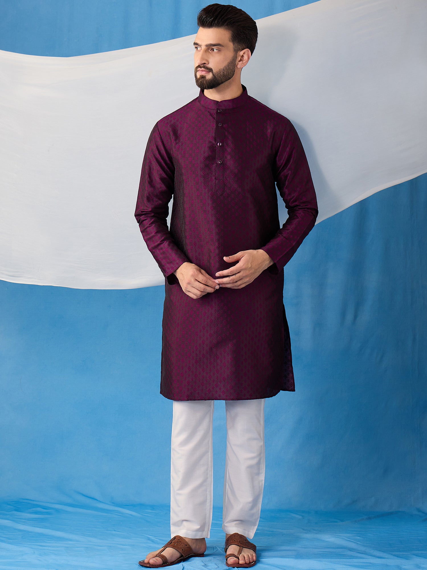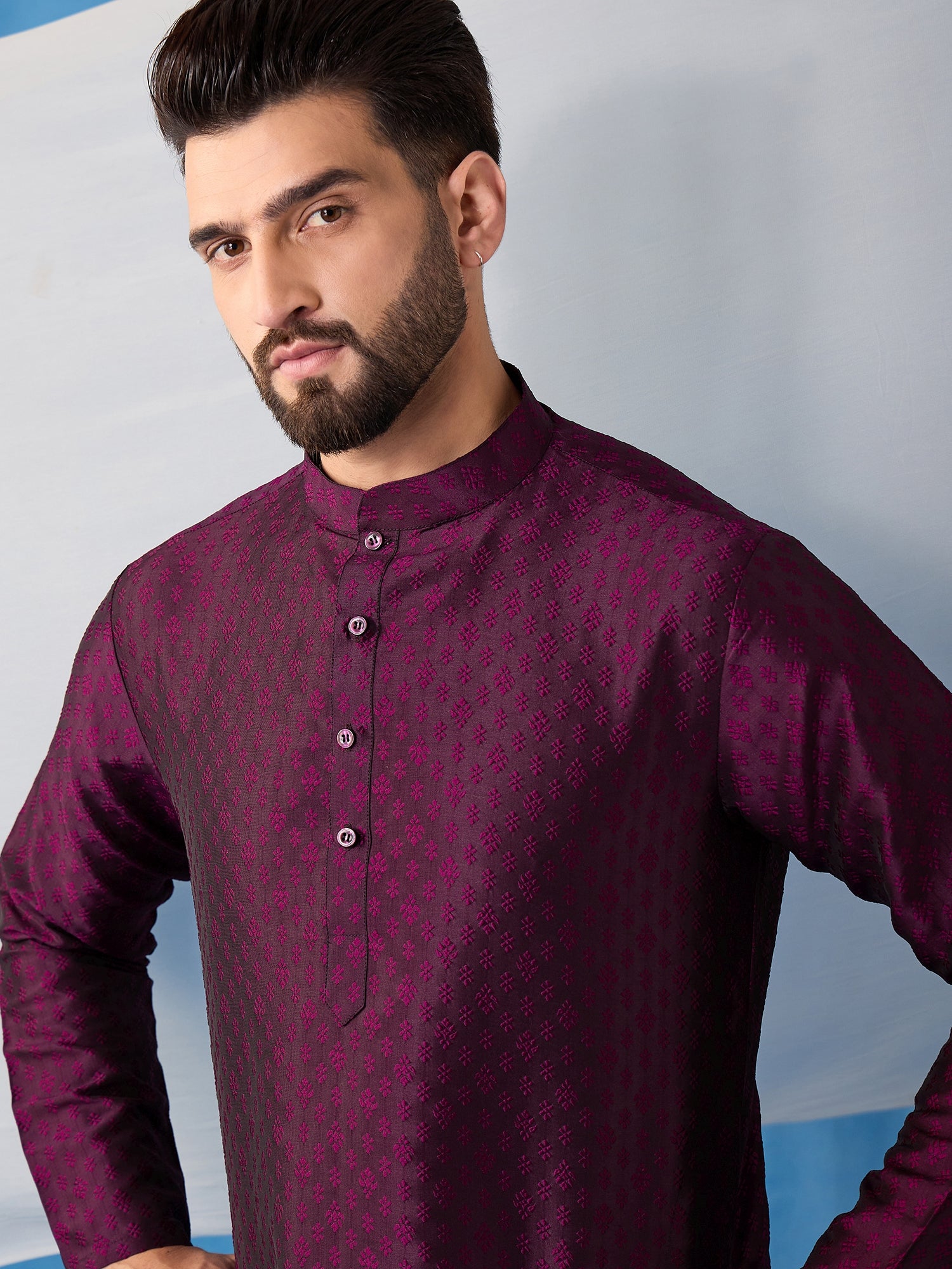 Introducing our beautiful silk blend Kurta and Trousers set. The Kurta features a delicate floral embroidery, a classic mandarin collar, and two pockets with intricate thread work detail. The trousers are solid in color with a partially elasticated waistband, providing both style and comfort. Elevate your wardrobe with this elegant jacquard weave set..