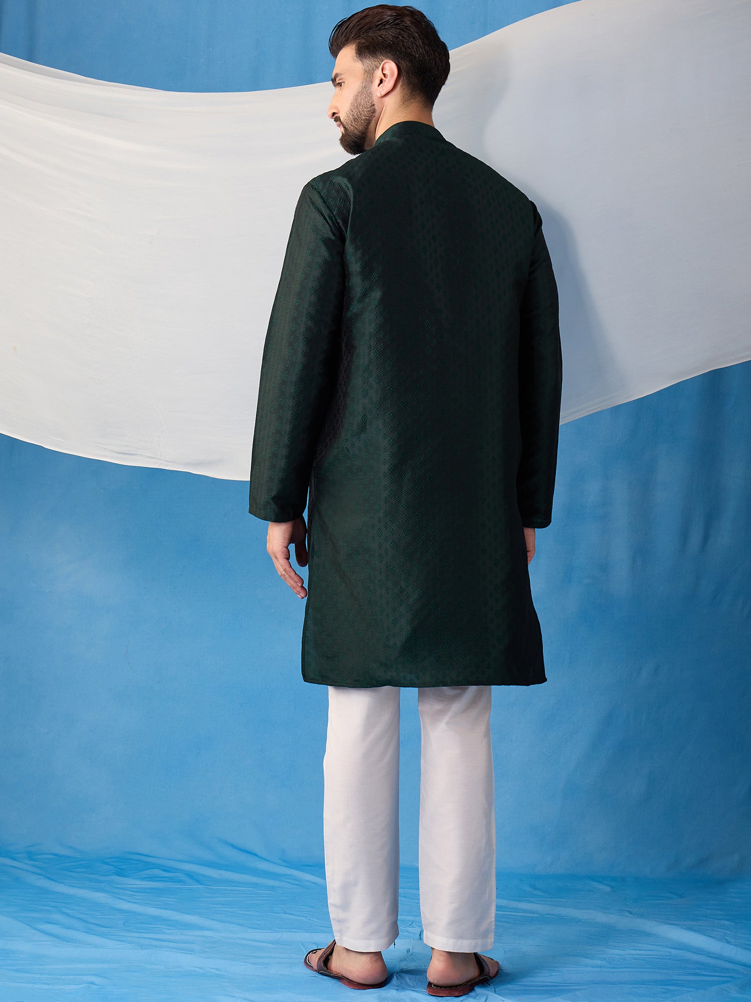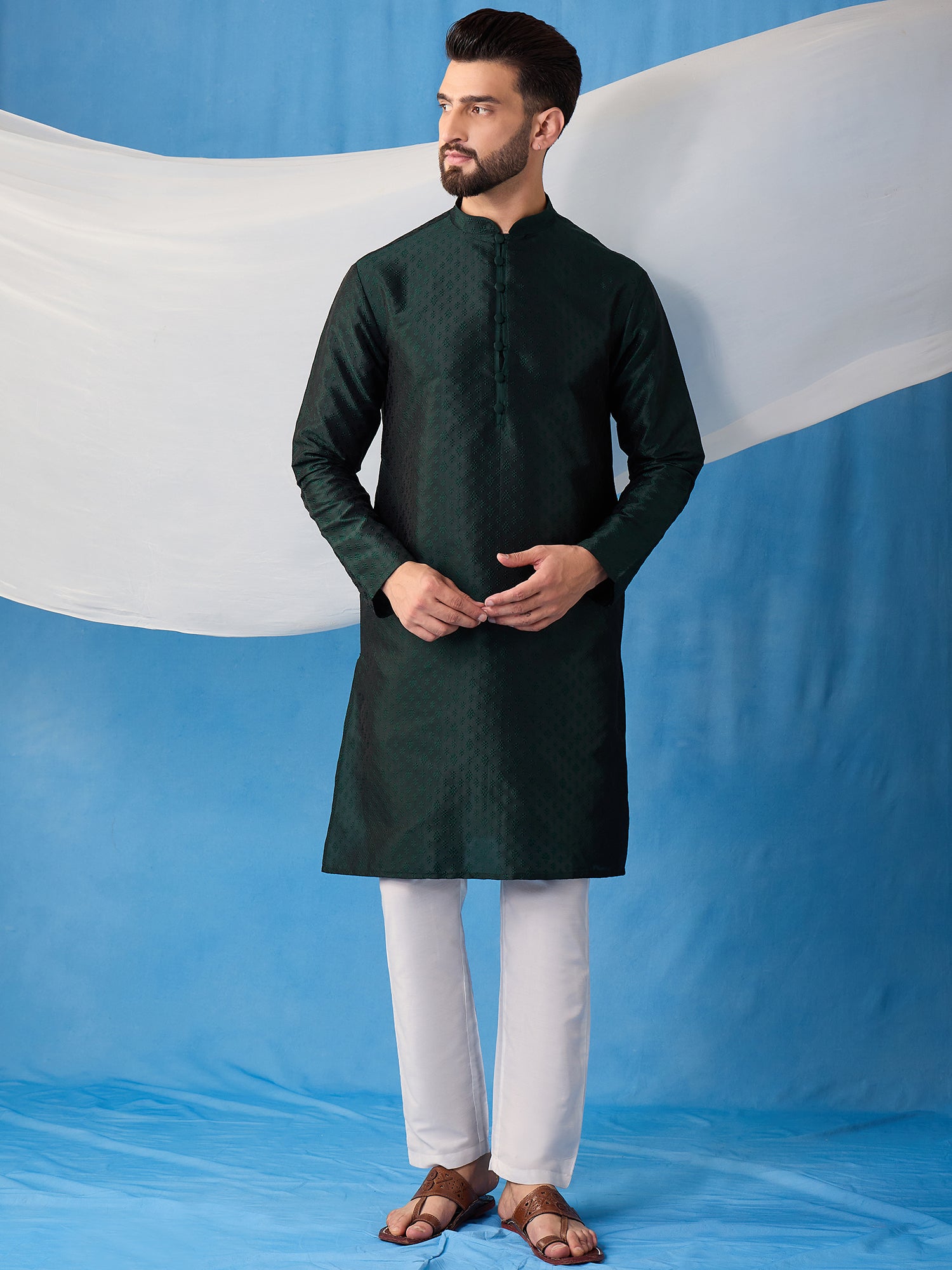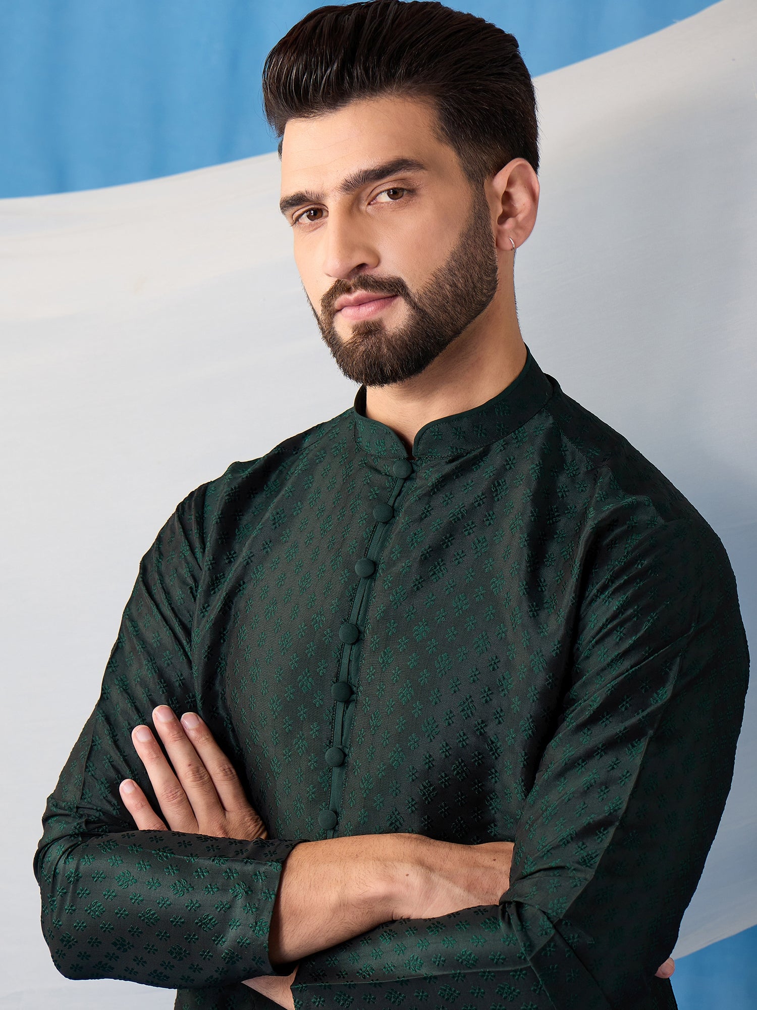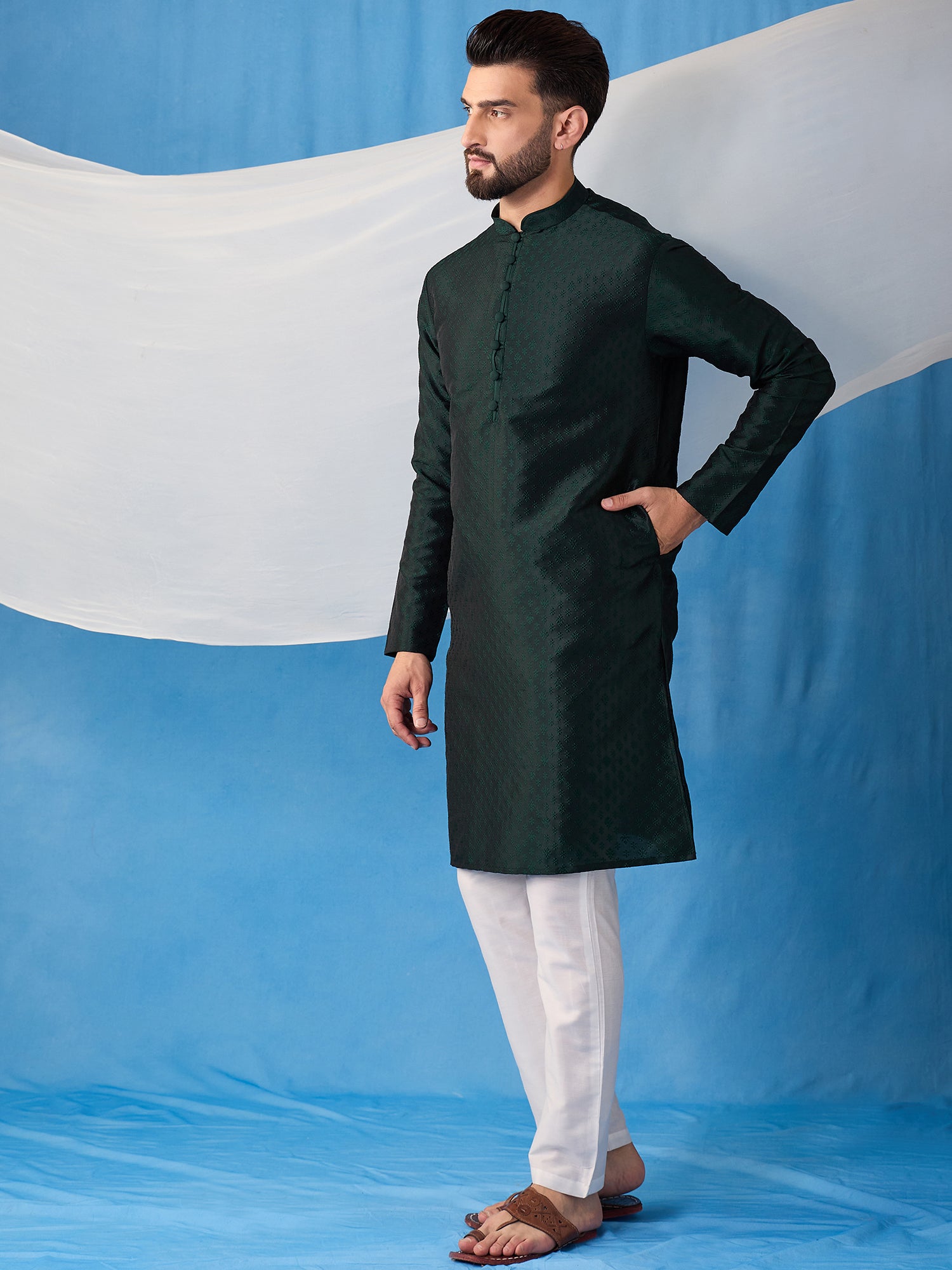 Expertly crafted with a silk blend machine weave fabric, this Floral Embroidered Thread Work Jacquard Weave Stright Kurta With Trousers features a beautiful embroidered floral design on a straight shape with a mandarin collar and long regular sleeves. The trousers are solid with a partially elasticated waistband and hook and eye & zip closure. Perfect for a sophisticated and stylish look.