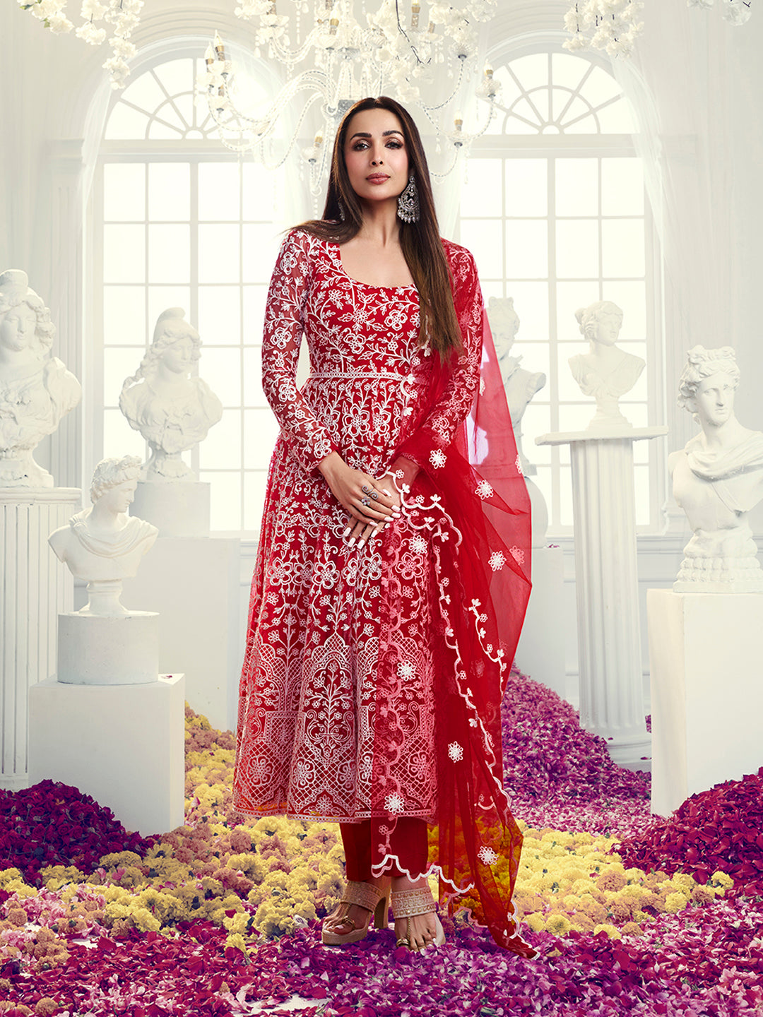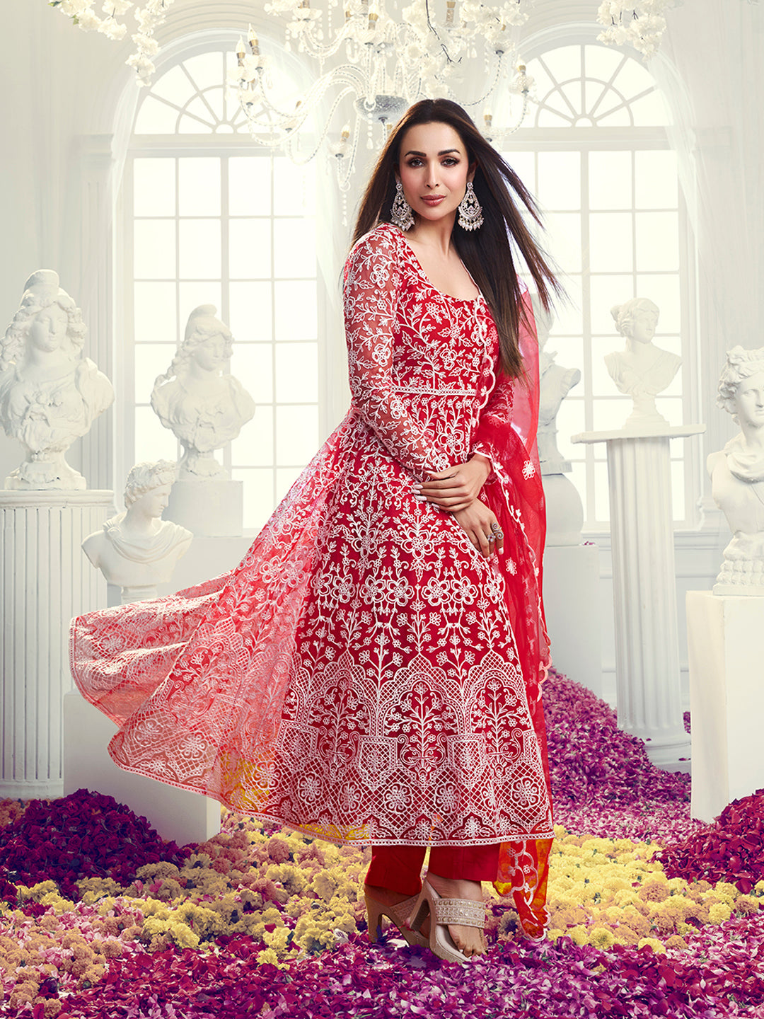 This red and white embroidered Kurta set features floral designs and intricate thread work on a scoop neck, long-sleeved Anarkali style top. Made with net machine weave fabric, the calf-length kurta flares at the hem for a flattering fit. The solid trousers have a partially elasticated waistband for comfort, while the embroidered dupatta with taping border completes the elegant look.