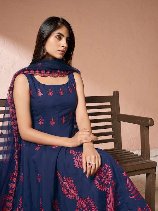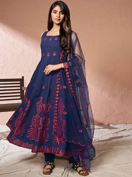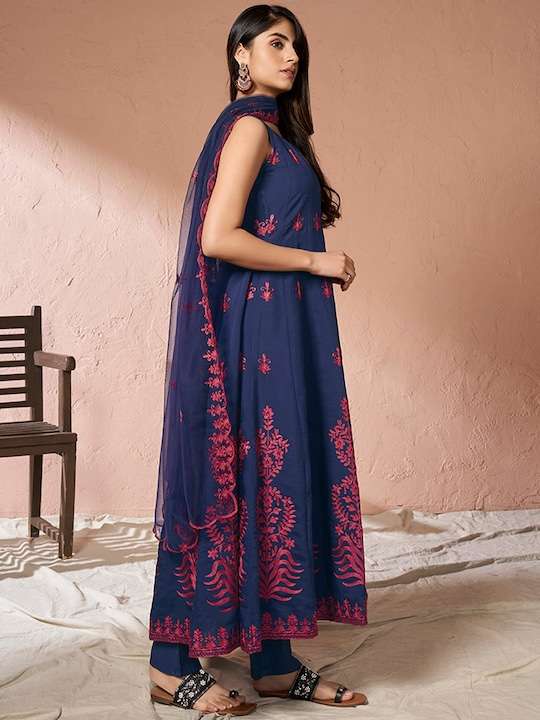 Crafted from lightweight and breathable pure cotton, this Navy blue Anarkali kurta boasts beautiful floral embroidered thread work detail and pleats, designed to flatter all body shapes. Complete with Trousers and Dupatta, it's perfect for a day of comfort and style.