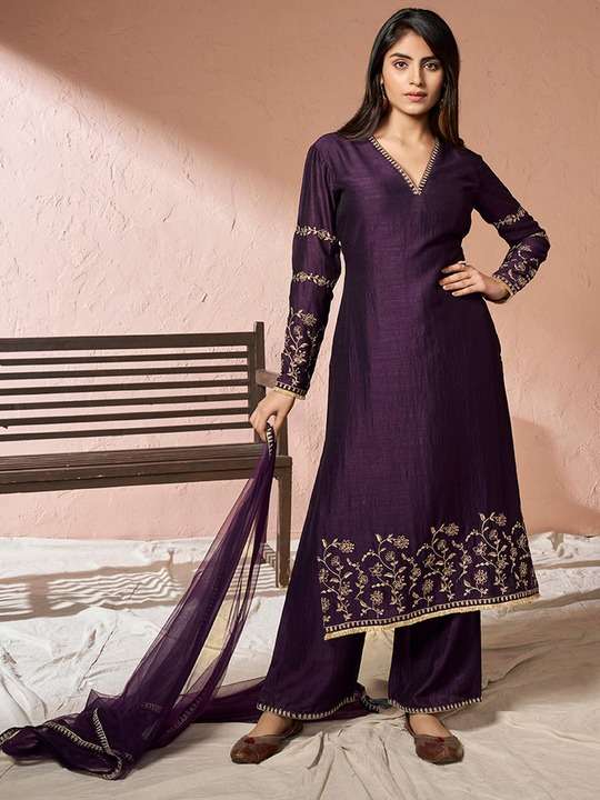 Look fashionable and stylish in this beautiful Floral Embroidered Thread Work Straight Kurta With Palazzos & Dupatta. It features a burgundy kurta with floral embroidery, a straight shape and regular style. The V-neck design and long regular sleeves complete the look. The set also includes solid palazzos with partially elasticated waistband and a dupatta. It is made of a silk blend fabric for soft comfort.