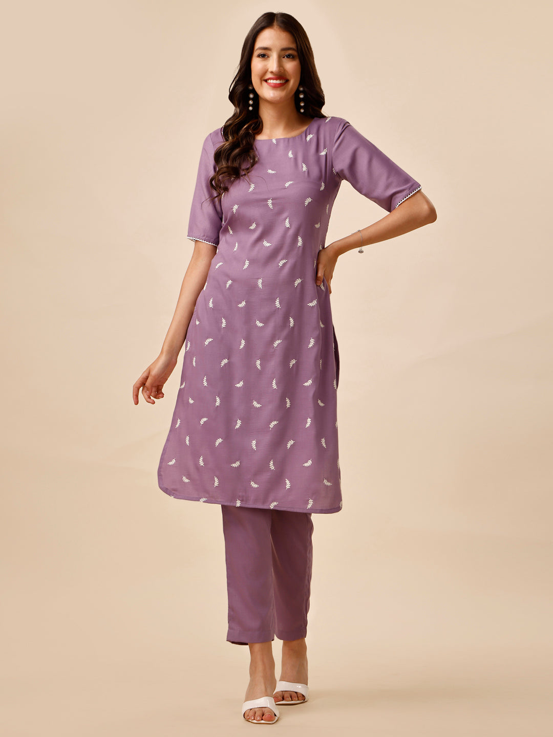 Elevate your wardrobe with our elegant Lavender and Cream Floral Embroidered Straight Kurta with Trousers. This silk blend machine weave kurta features intricate thread work detailing, a round neck, and short regular sleeves for a classic look. The calf length and curved hem add a touch of sophistication, while the partially elasticated waistband and slip-on closure of the solid-colored trousers offer both comfort and style.