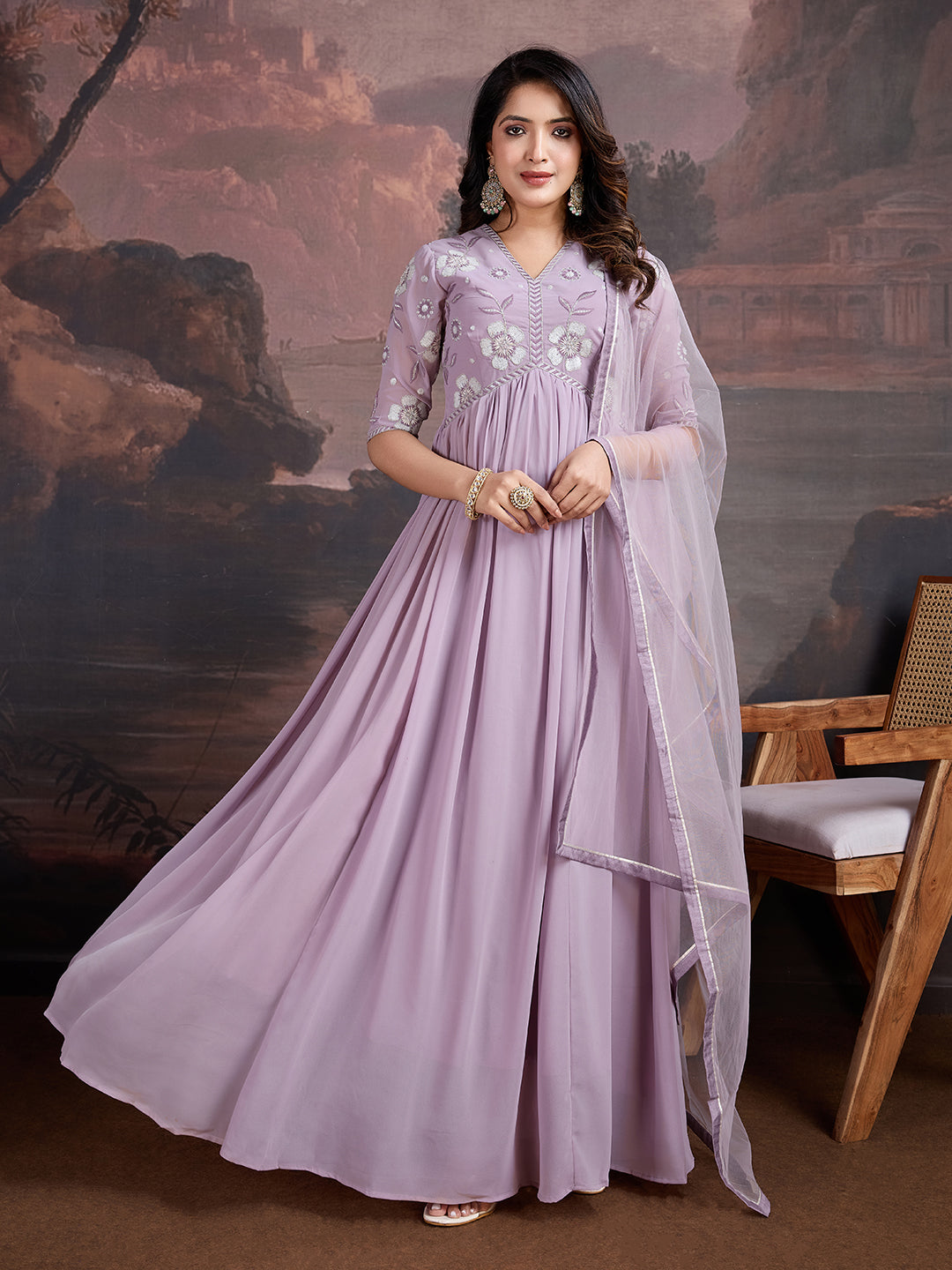 Discover the elegant and feminine look of our Floral Embroidered V-Neck Anarkali Kurta. The empire style and fit and flare shape accentuate your figure while the mauve and silver-toned colors add a touch of sophistication. Complete your outfit with the included dupatta for a stunning finish.