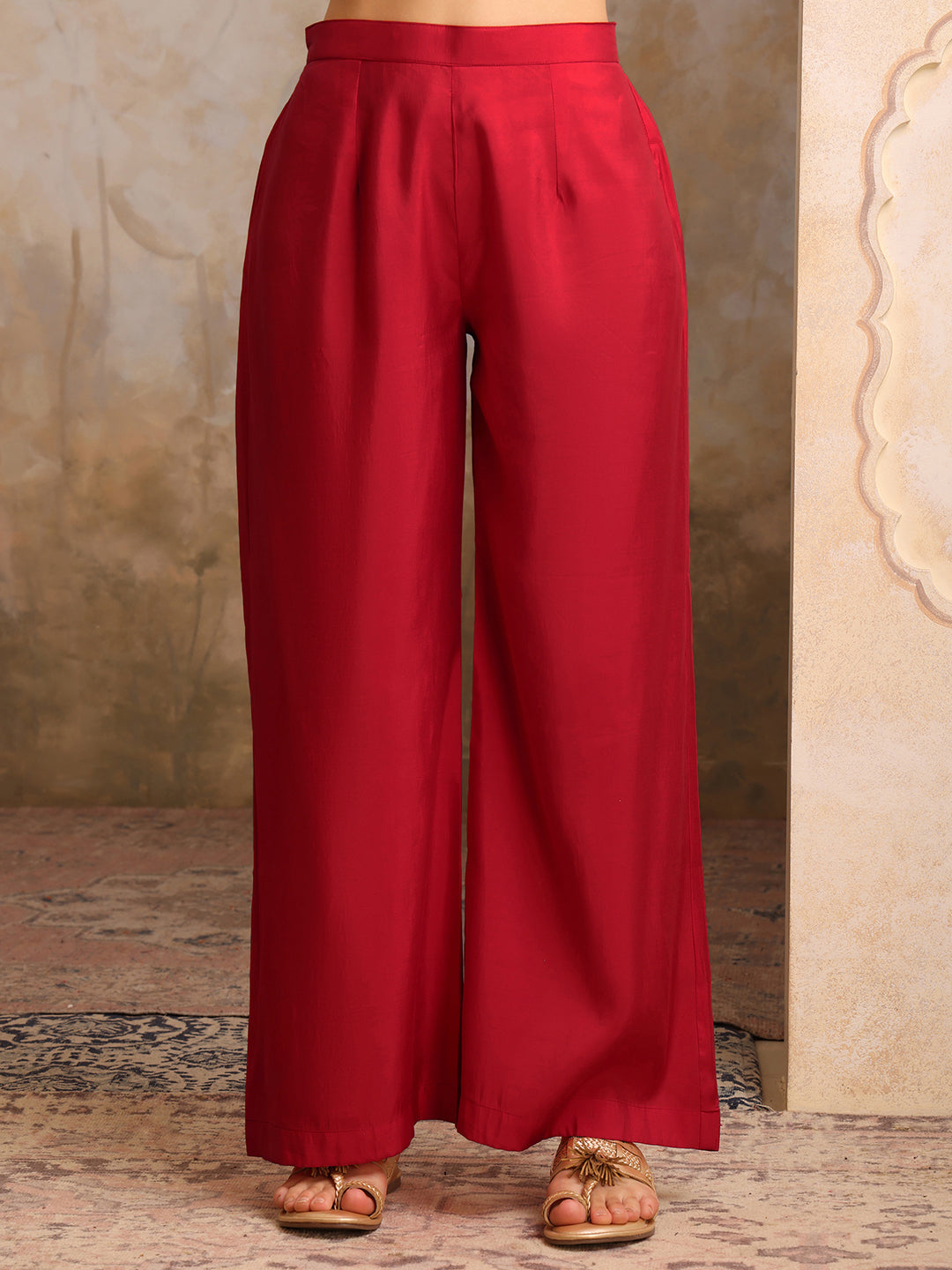 Red, gold toned and green embroidered kurta with palazzos and dupatta