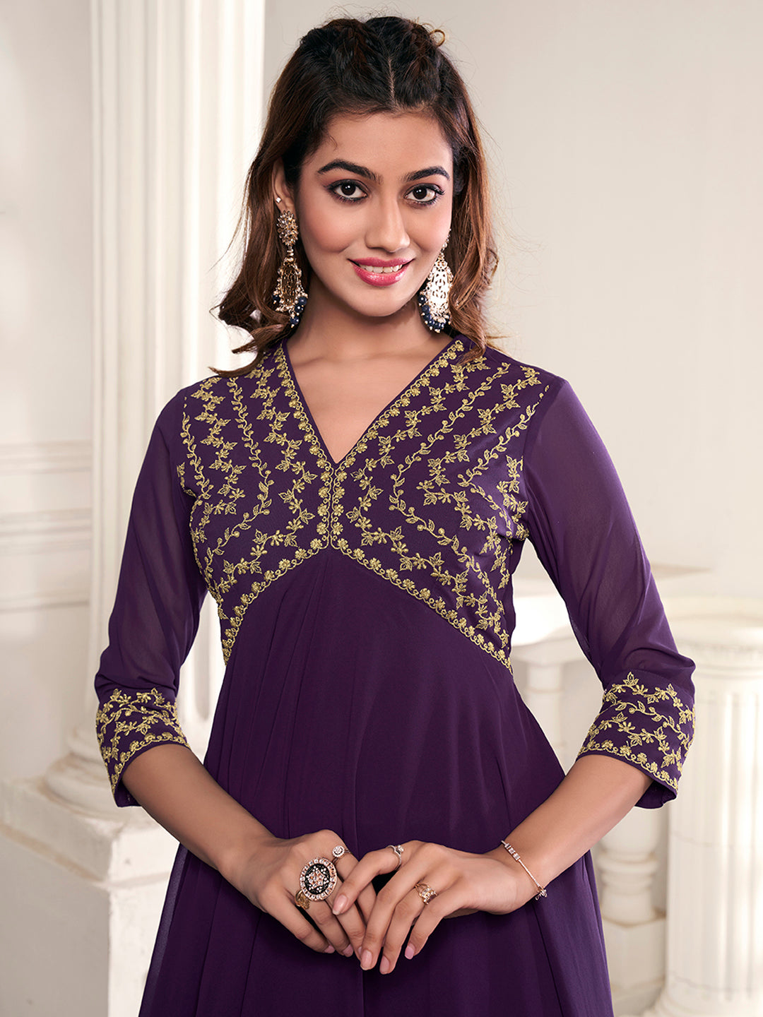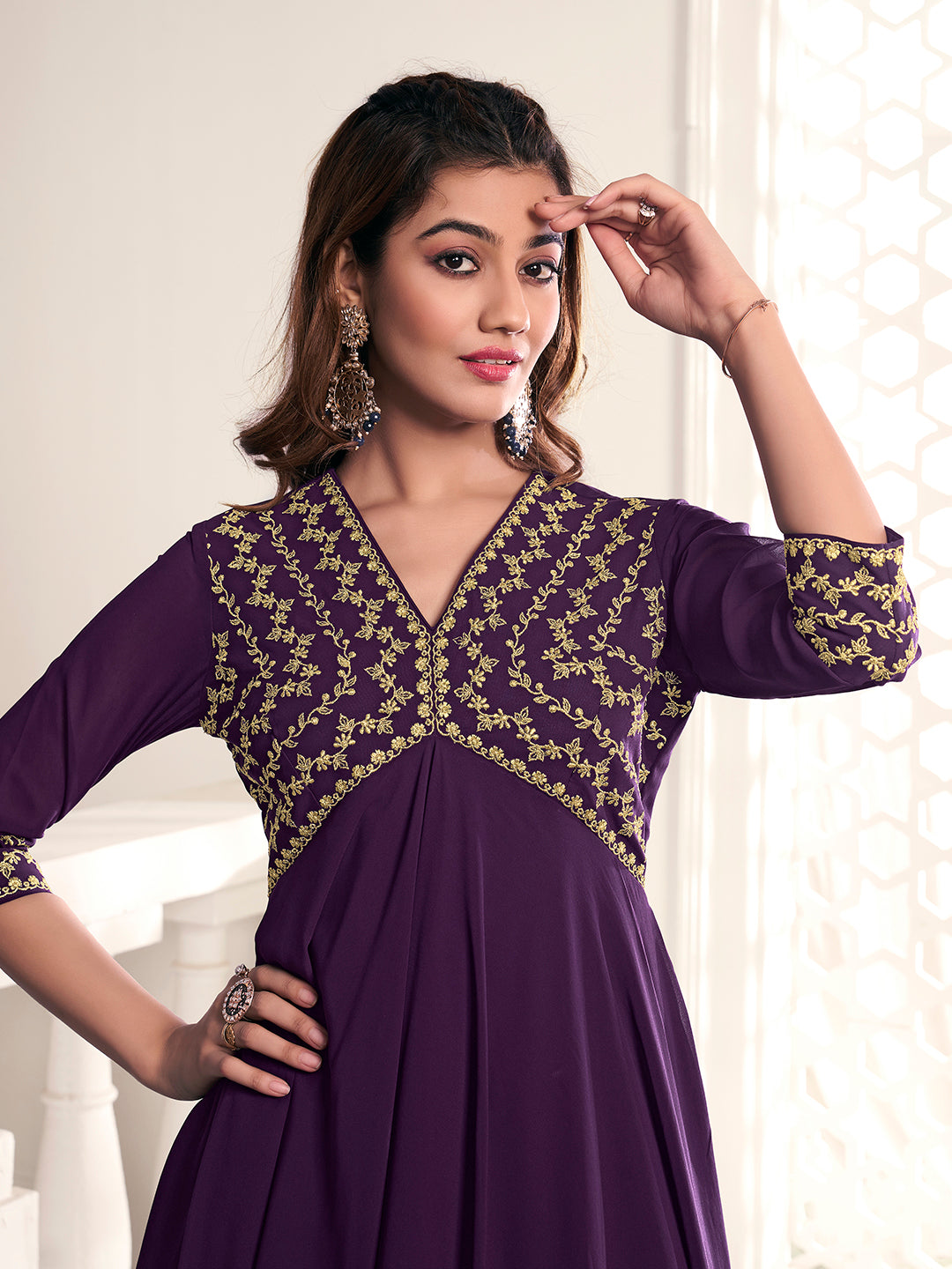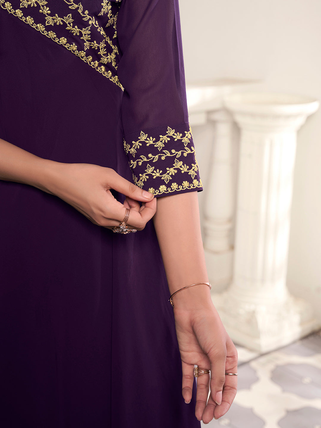 Purple embroidered top, has a v neck and three quarter sleeves, secured with slip-on closure