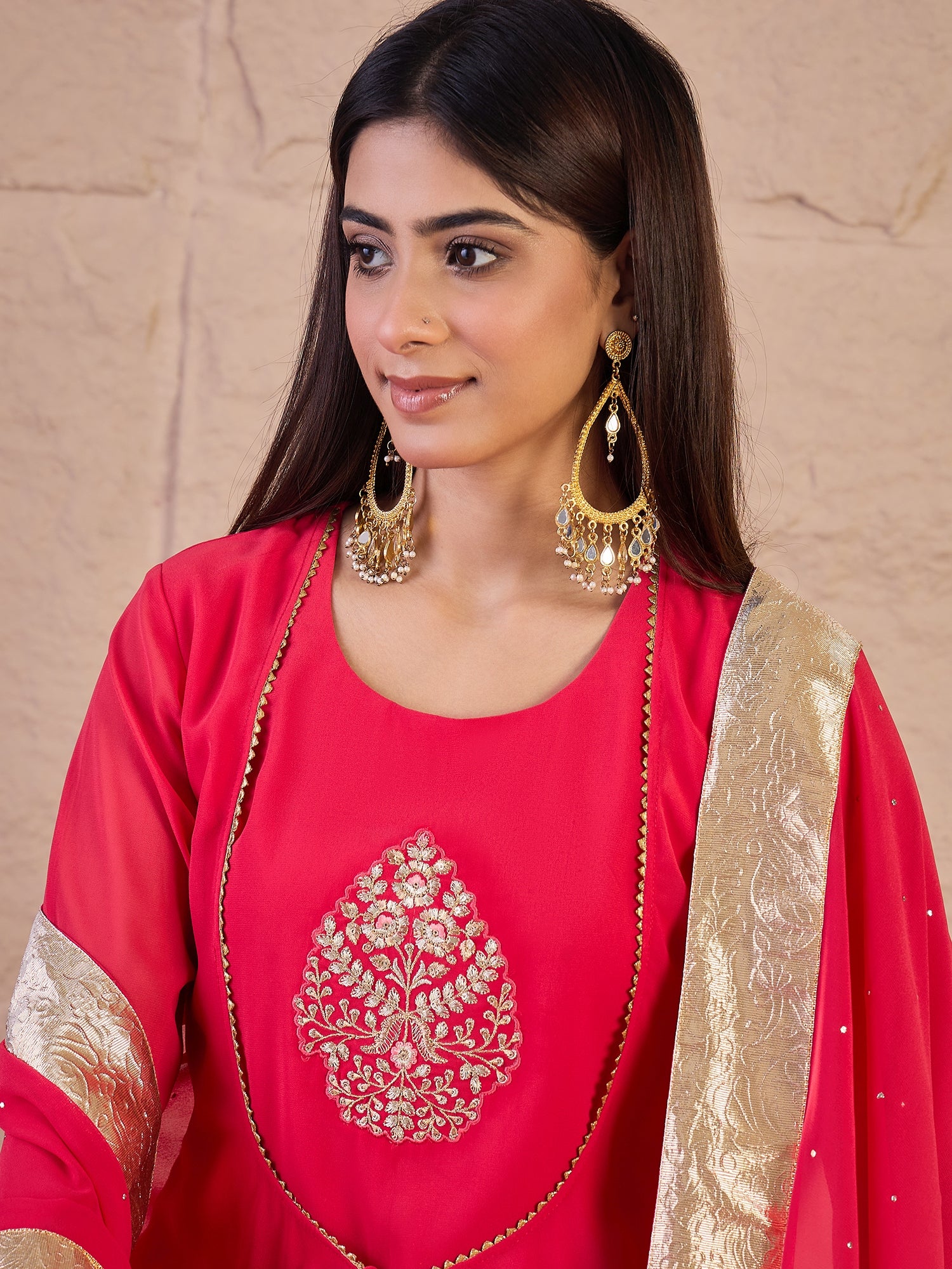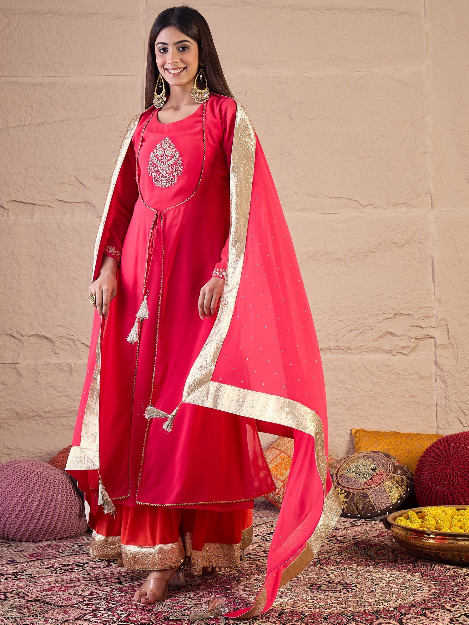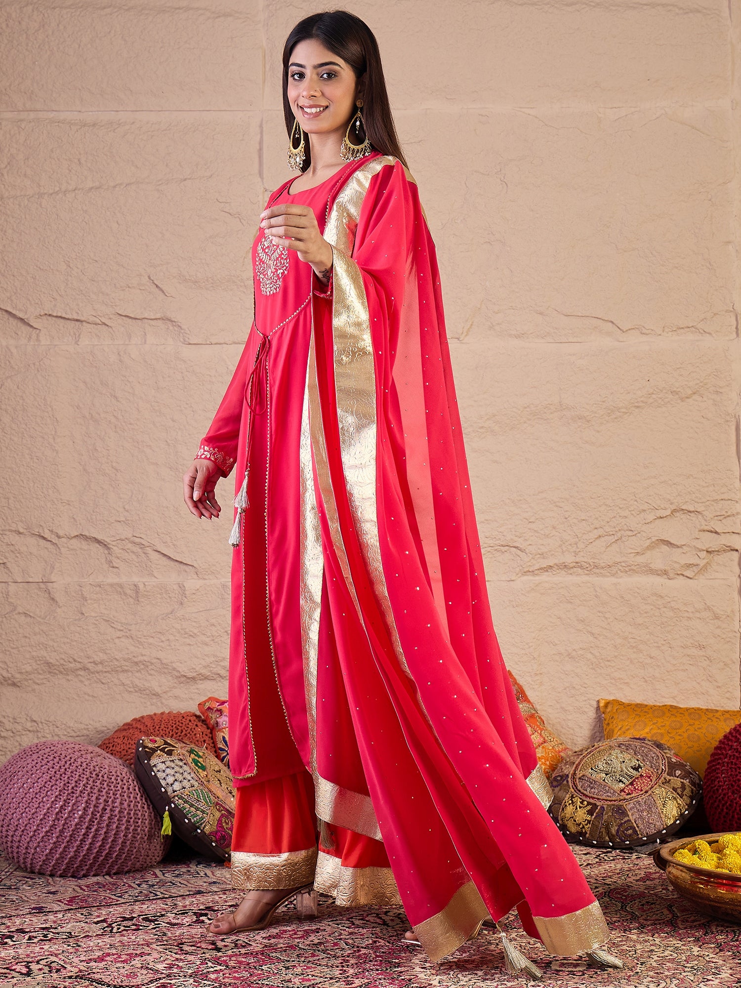 Red and gold toned embroidered kurta with palazzos & dupatta