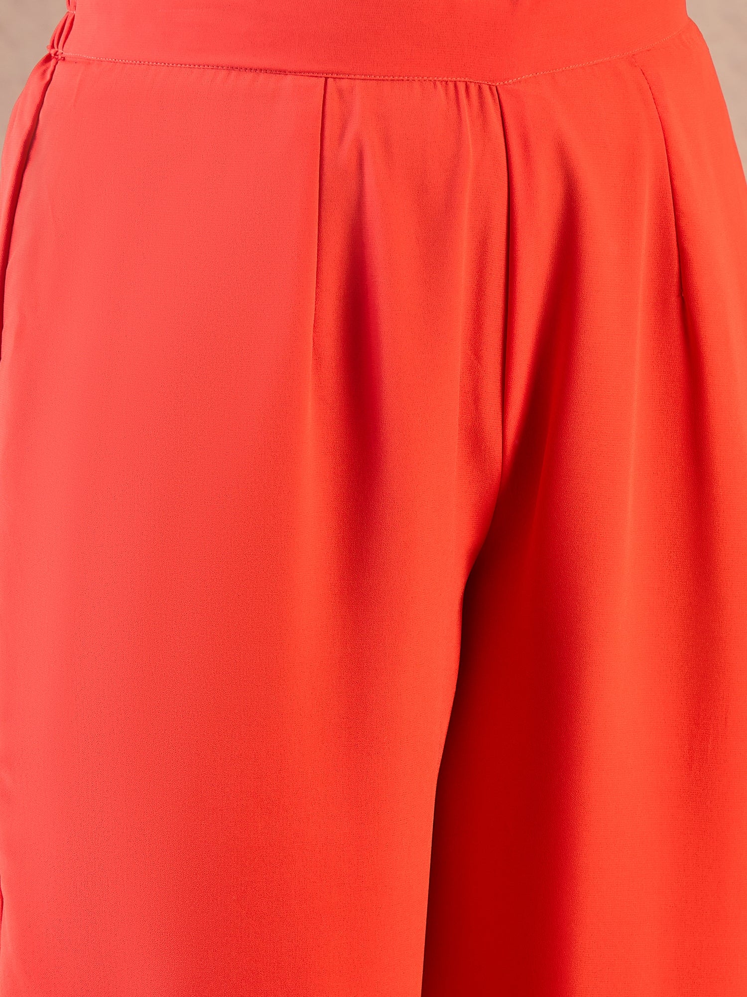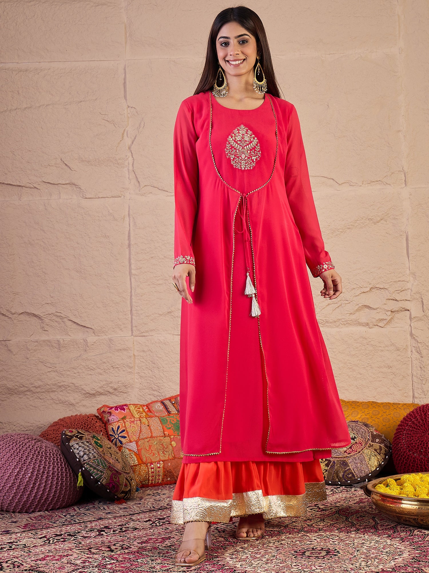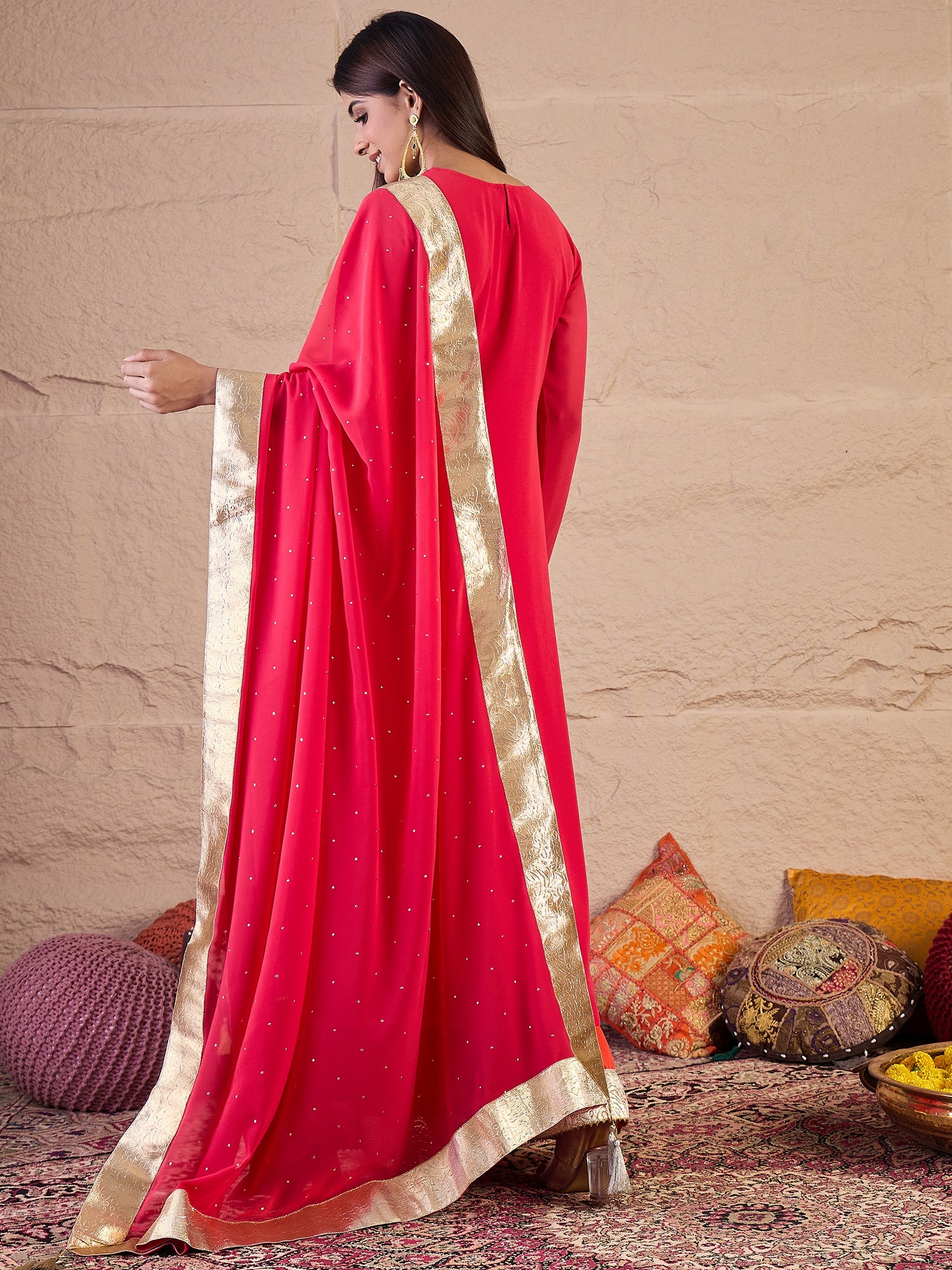 Red and gold toned embroidered kurta with palazzos & dupatta