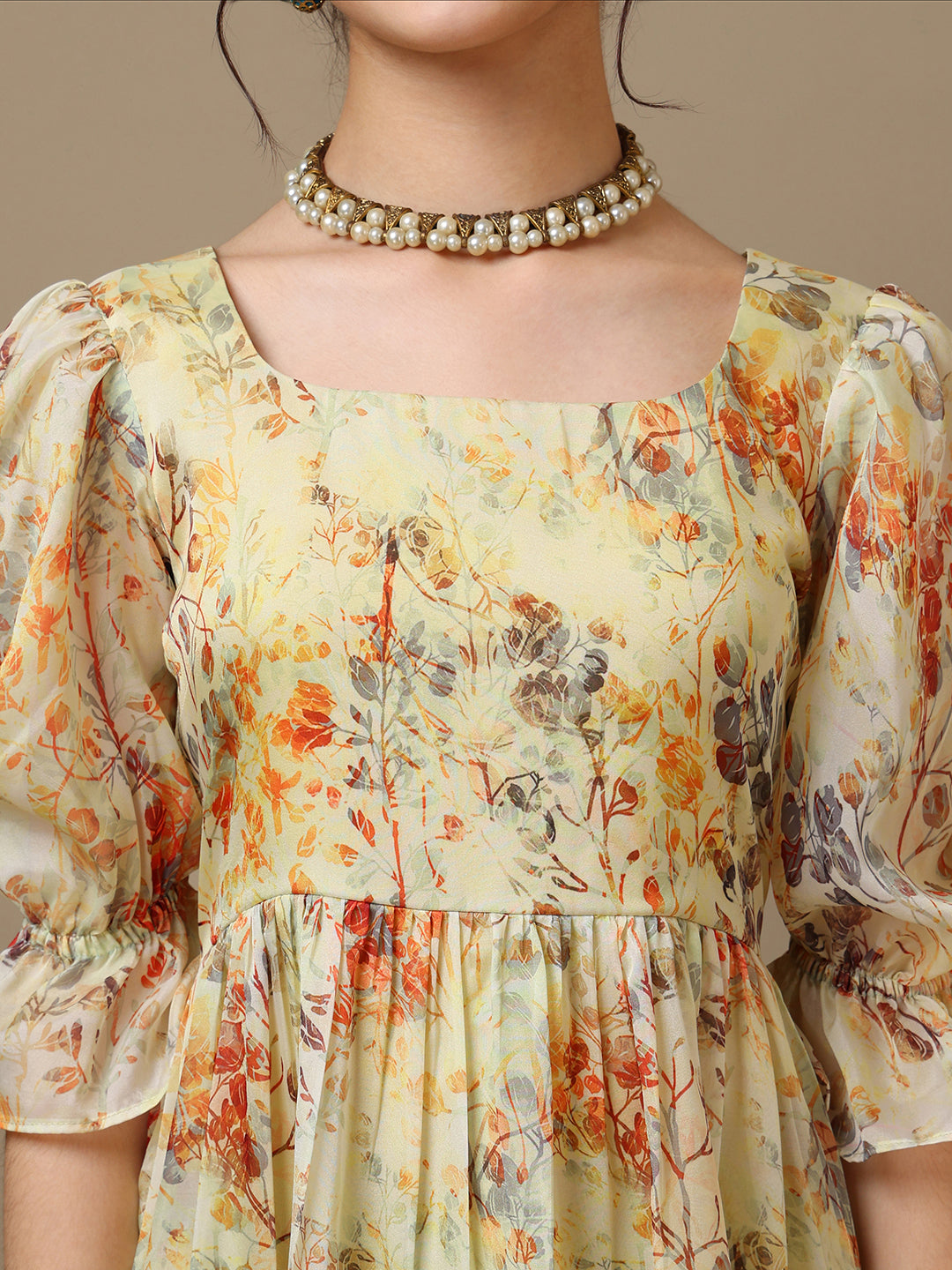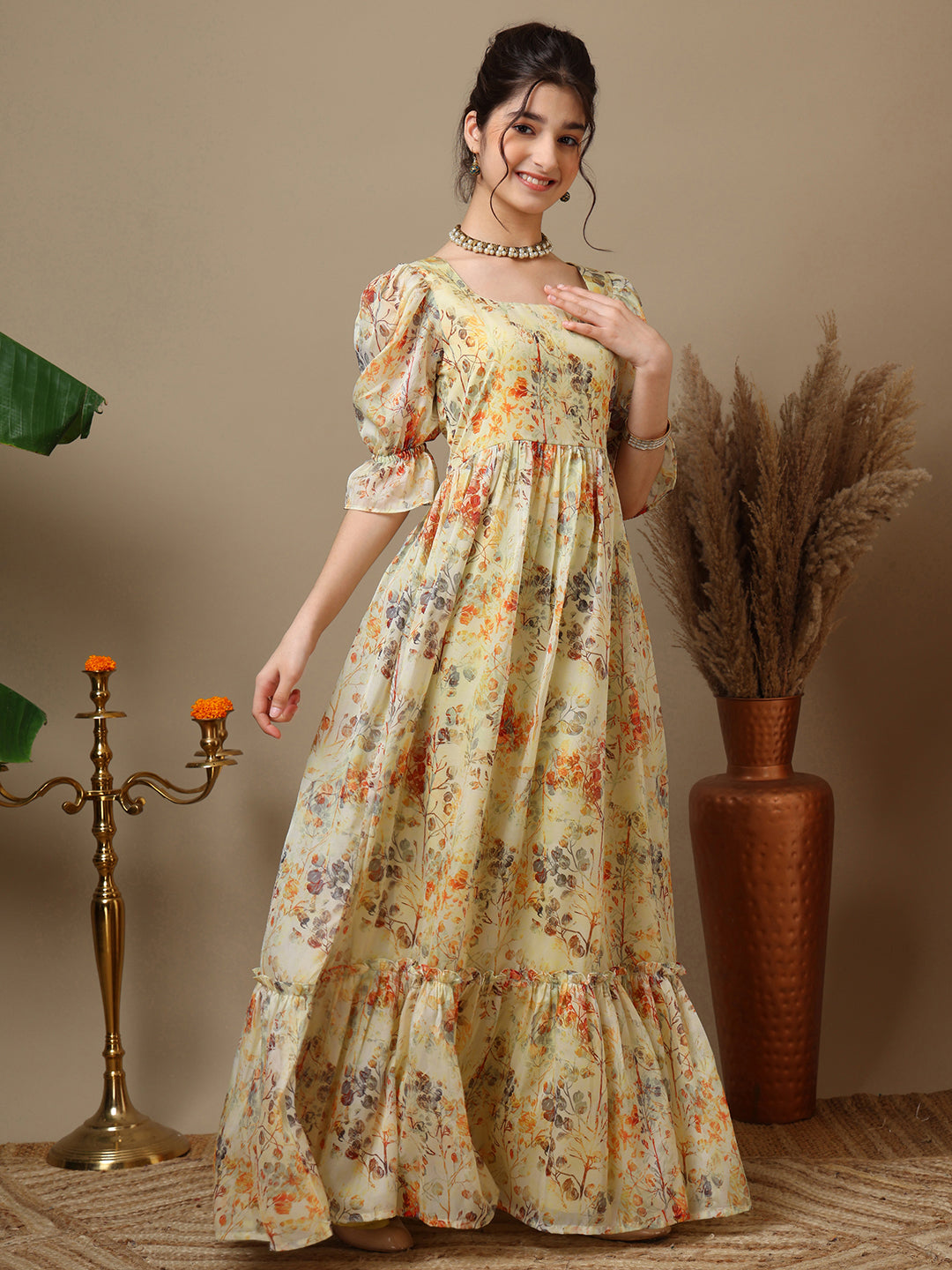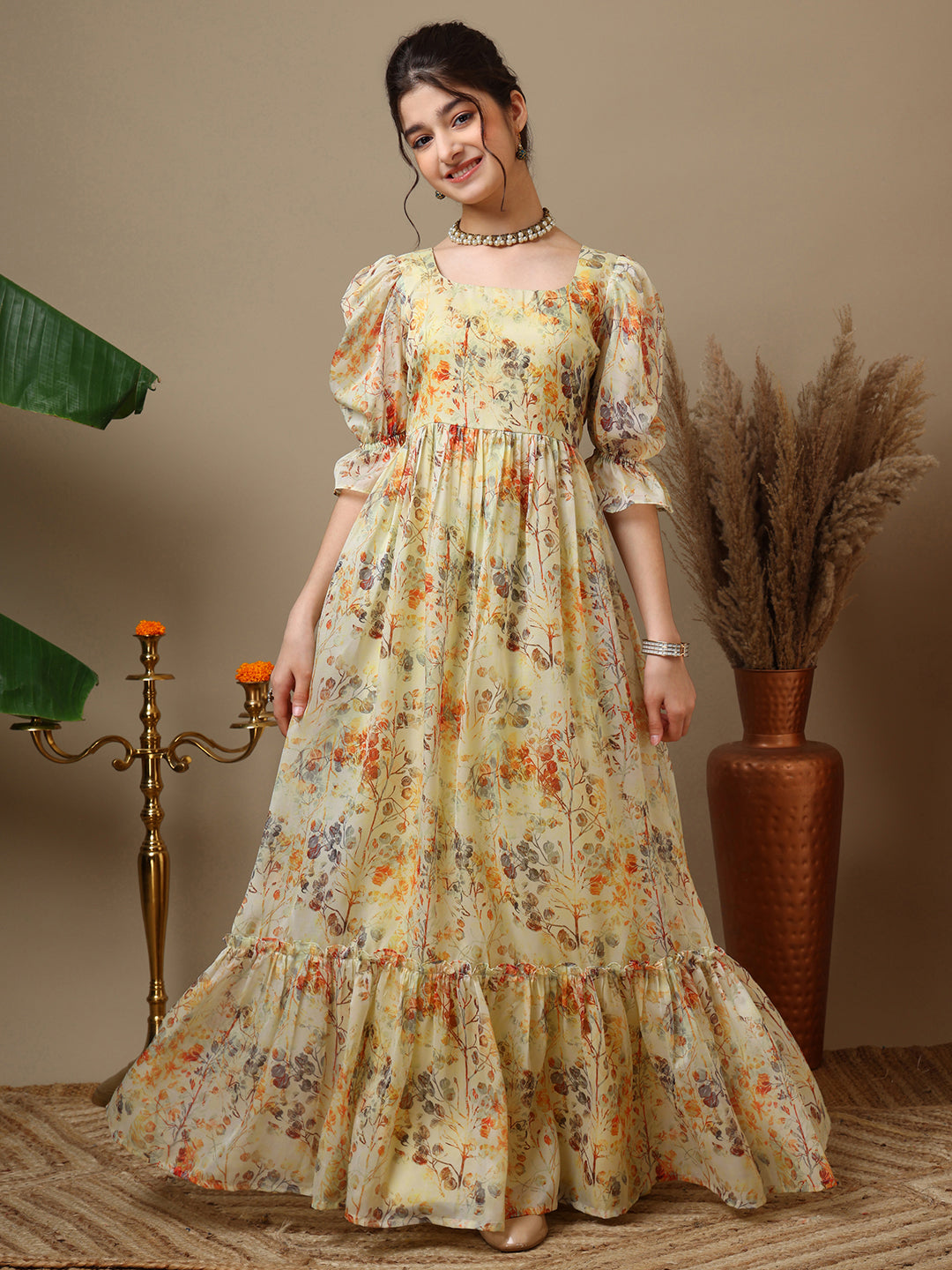 Embrace timeless elegance with this stunning floral printed maxi ethnic dress. Featuring a vibrant yellow and orange floral design, this piece combines traditional charm with contemporary style. The square neckline offers a flattering, modest silhouette, while three-quarter bell sleeves add graceful movement and a touch of bohemian flair. Gathered and pleated details at the waist create beautiful dimension and flattering draping. Crafted from luxurious organza with a crepe lining, this maxi dress flows beautifully to the floor with a flared hem that enhances your natural movement. Perfect for festive occasions, celebrations, or everyday ethnic wear. Dry clean recommended to maintain the fabric's quality and vibrant print.