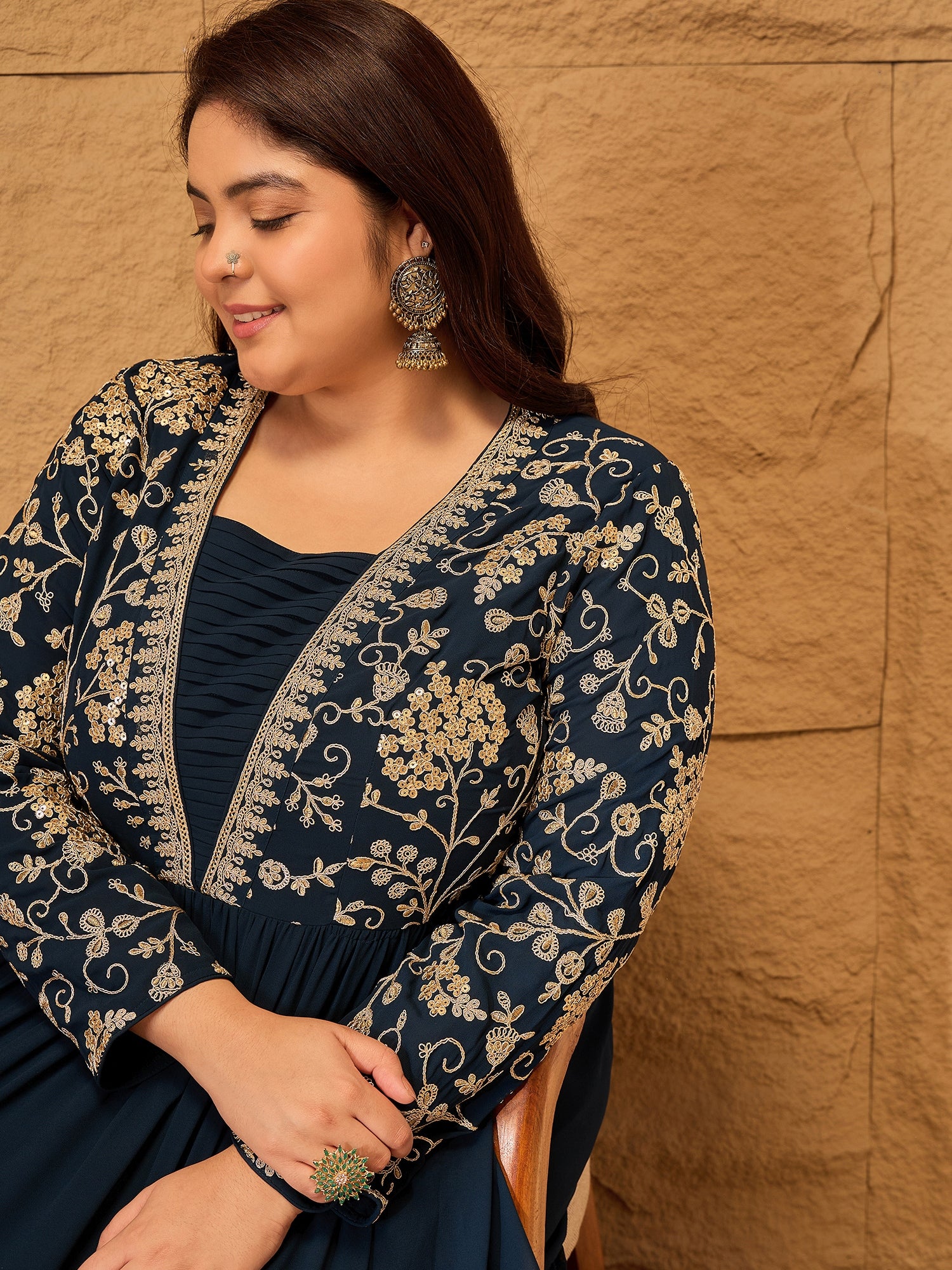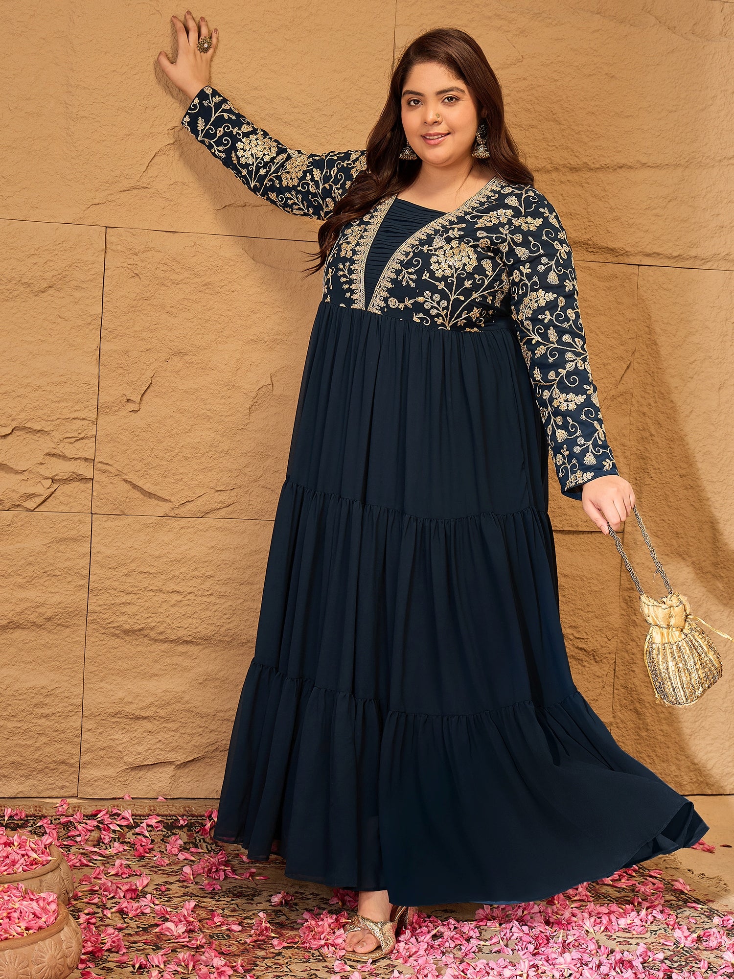 This ethnic dress showcases a vibrant teal blue color with intricate zari and sequin embroidery. The A-line shape and flared hem create a flattering silhouette, while the V-neck and long sleeves add a touch of elegance. Slip into this maxi dress and effortlessly exude style and cultural charm.