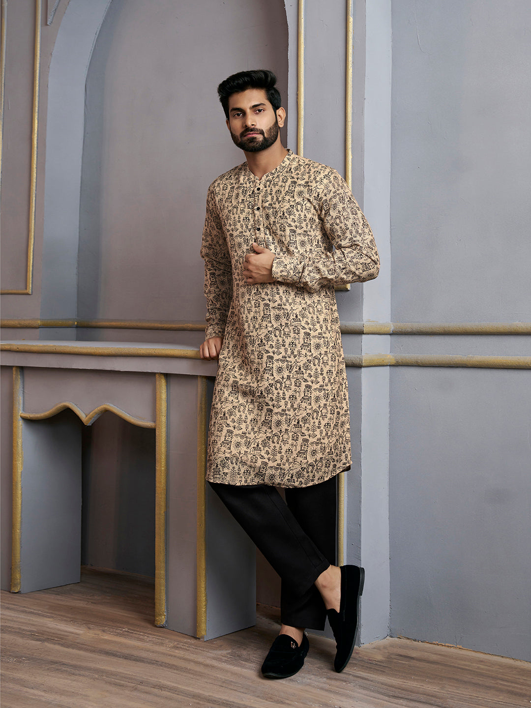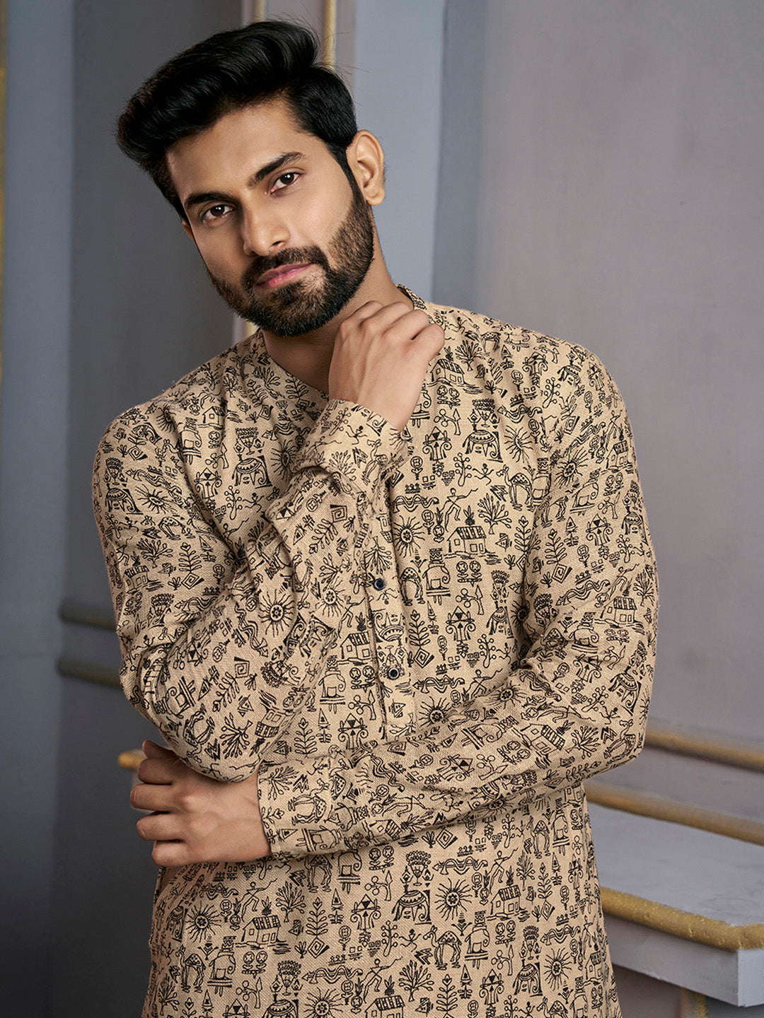 Expertly crafted from machine weave jute silk, this beige kurta features a beautiful floral print and a mandarin collar for a sophisticated touch. The long and regular sleeves, along with the straight shape and knee length, make for a versatile and comfortable fit. Made with jute cotton material, this kurta is perfect for any formal occasion and can be easily cared for with dry cleaning. Available in size M.