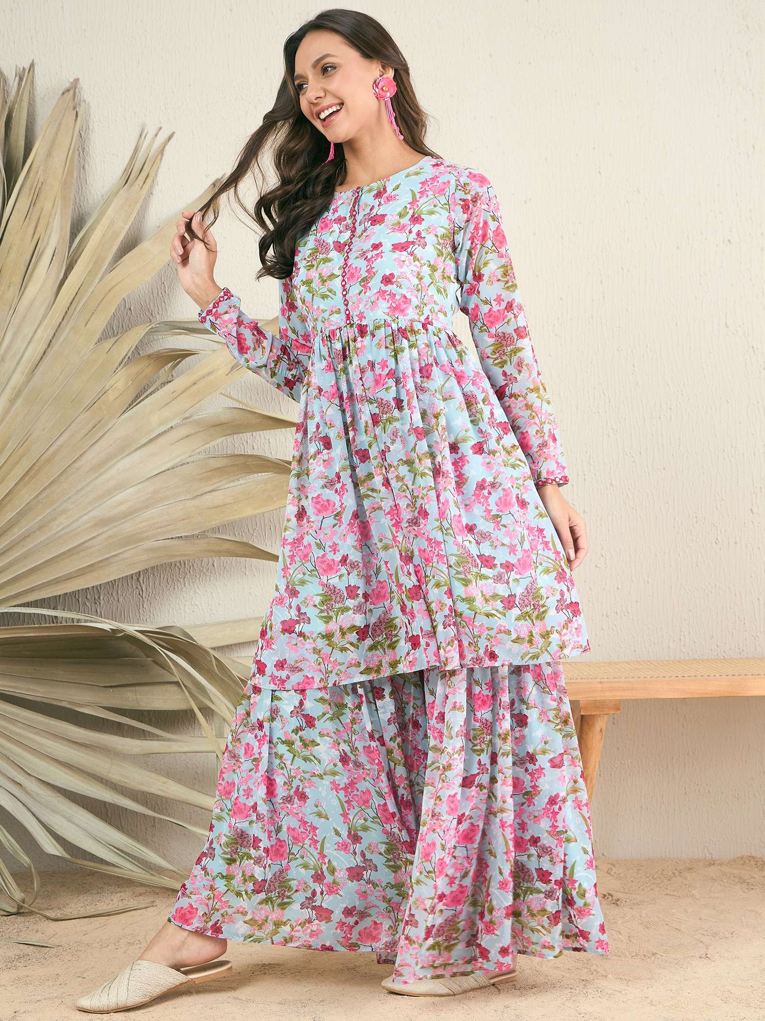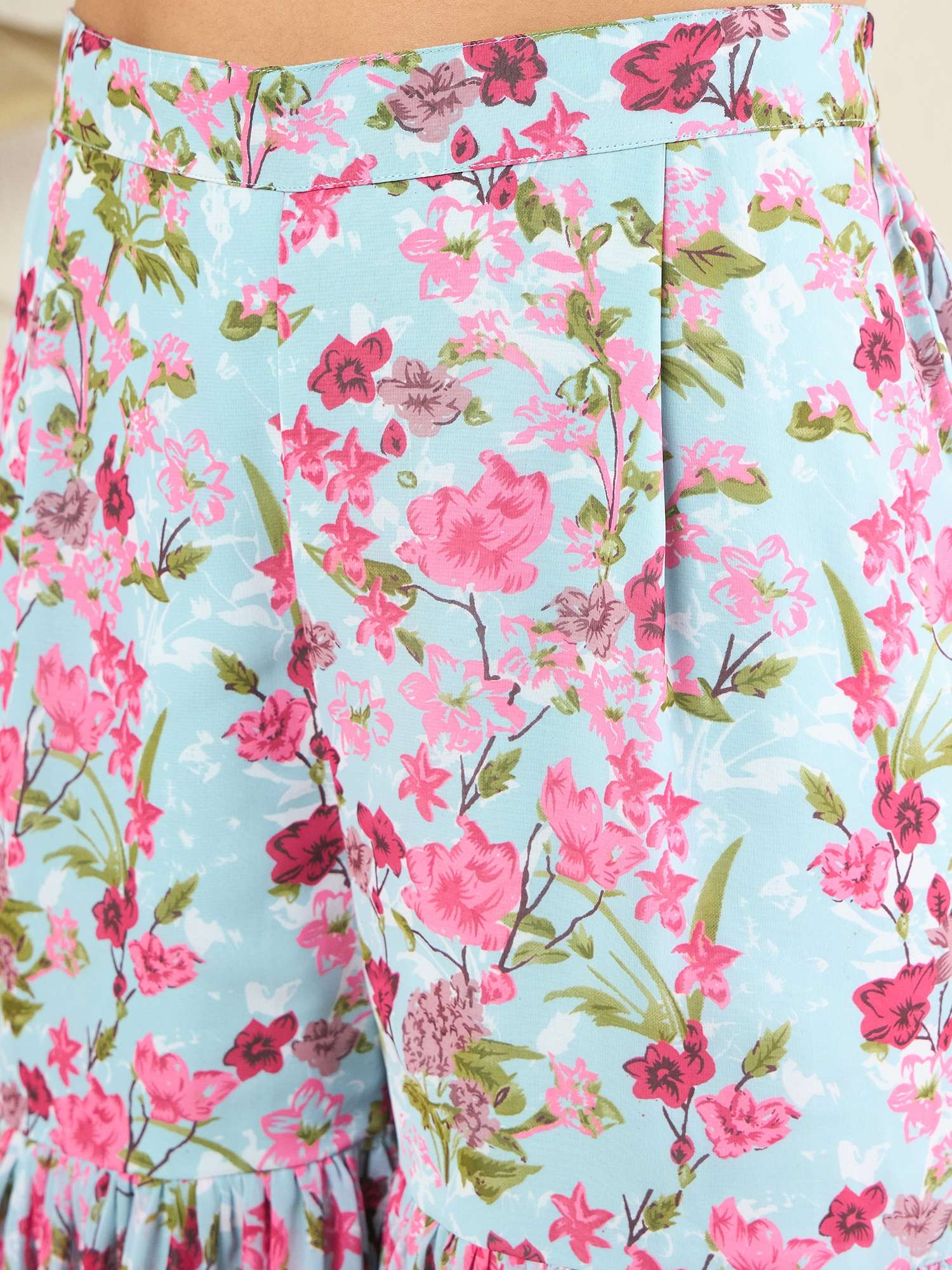 Blue and pink printed sharara, has an elasticated waistband with slip-on closure