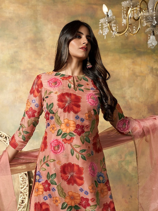 This peach-coloured printed kurta with dupatta is perfect for a summer look. It features a floral design, regular style, round neck, and thread work detail. The calf length length with a straight hem and organza machine weave fabric creates a refreshing, effortless look. The partially elasticated waistband and slip-on closure of the solid Palazzos provide a comfortable fit.