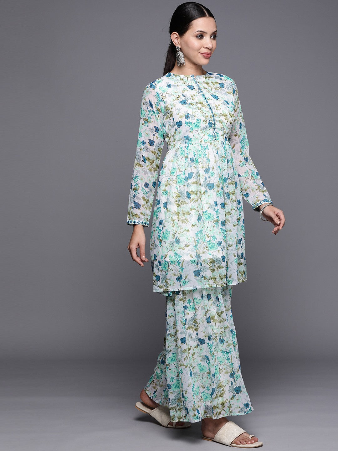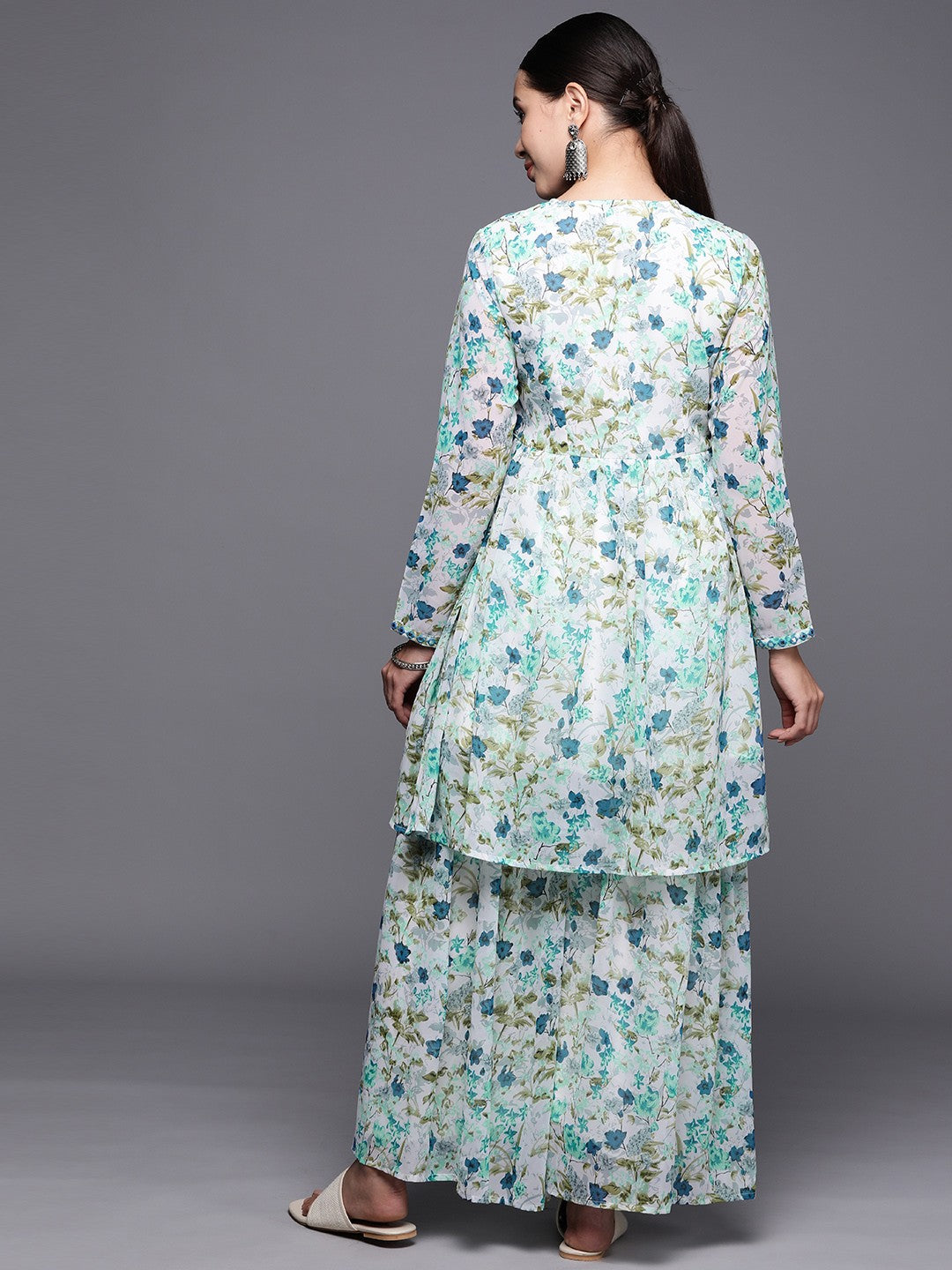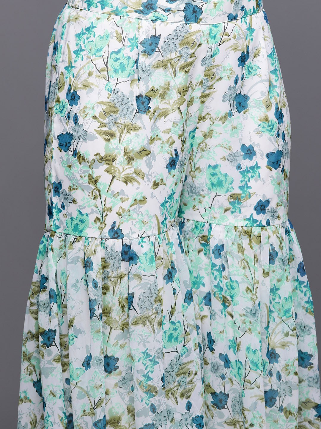 White and blue printed sharara, has an elasticated waistband with slip-on closure