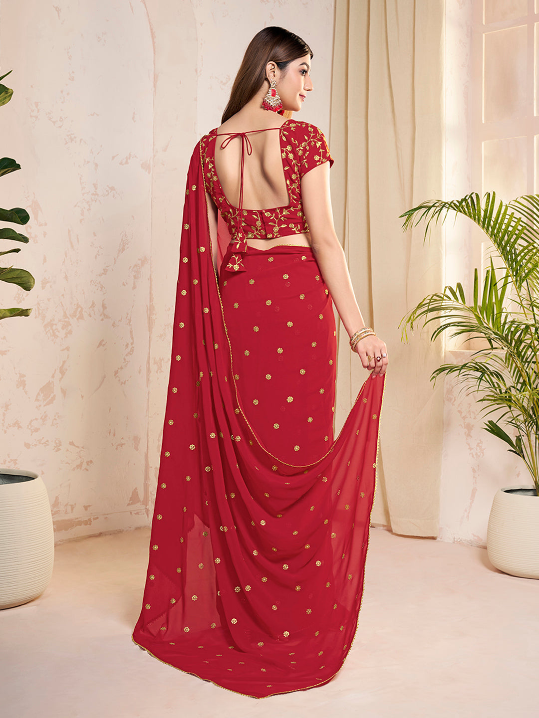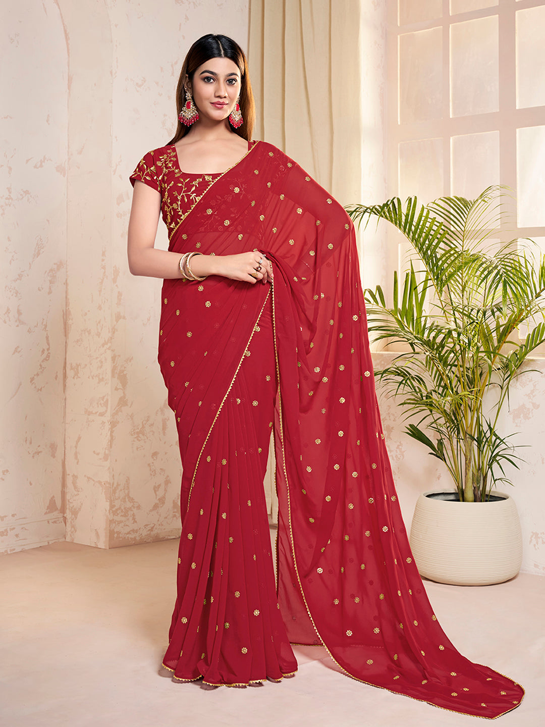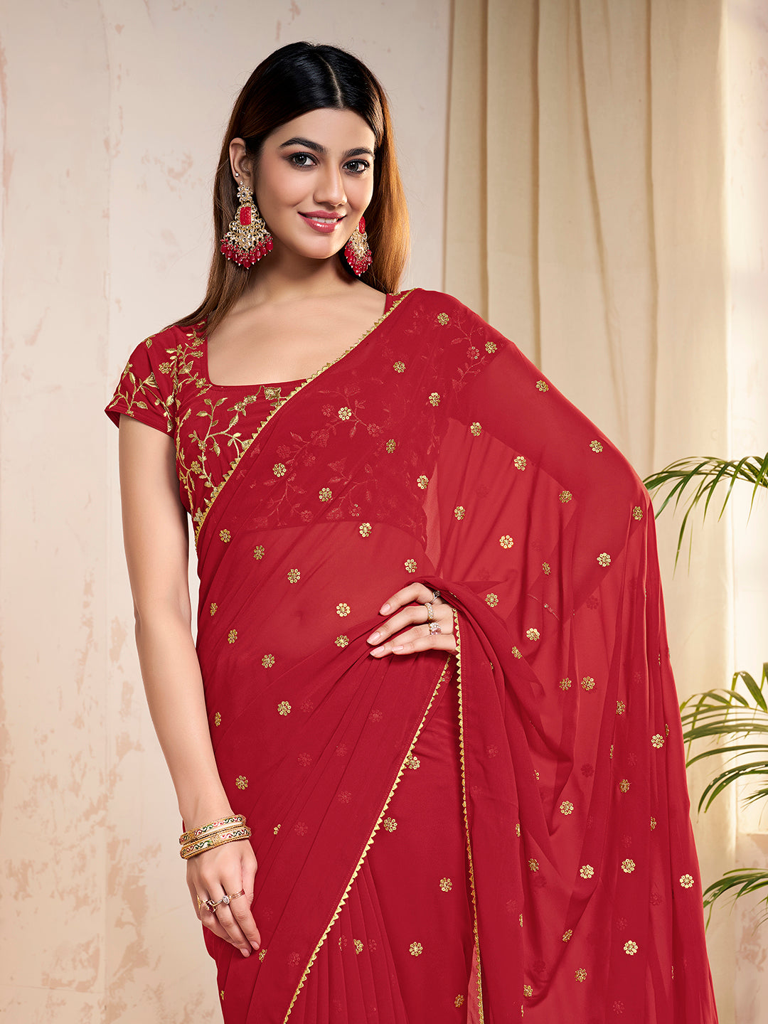 Elevate your traditional wardrobe with this stunning Floral Sequinned Poly Georgette Heavy Work Saree. The rich red and gold-toned saree features intricate floral embroidery and a beautifully embellished border. With delicate sequin detailing, this saree offers a touch of glamour to any occasion. Comes with an unstitched blouse piece for a customizable fit.