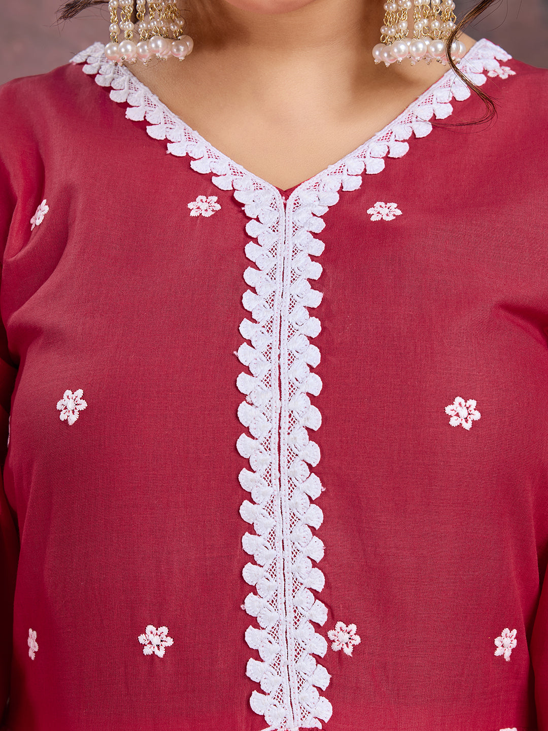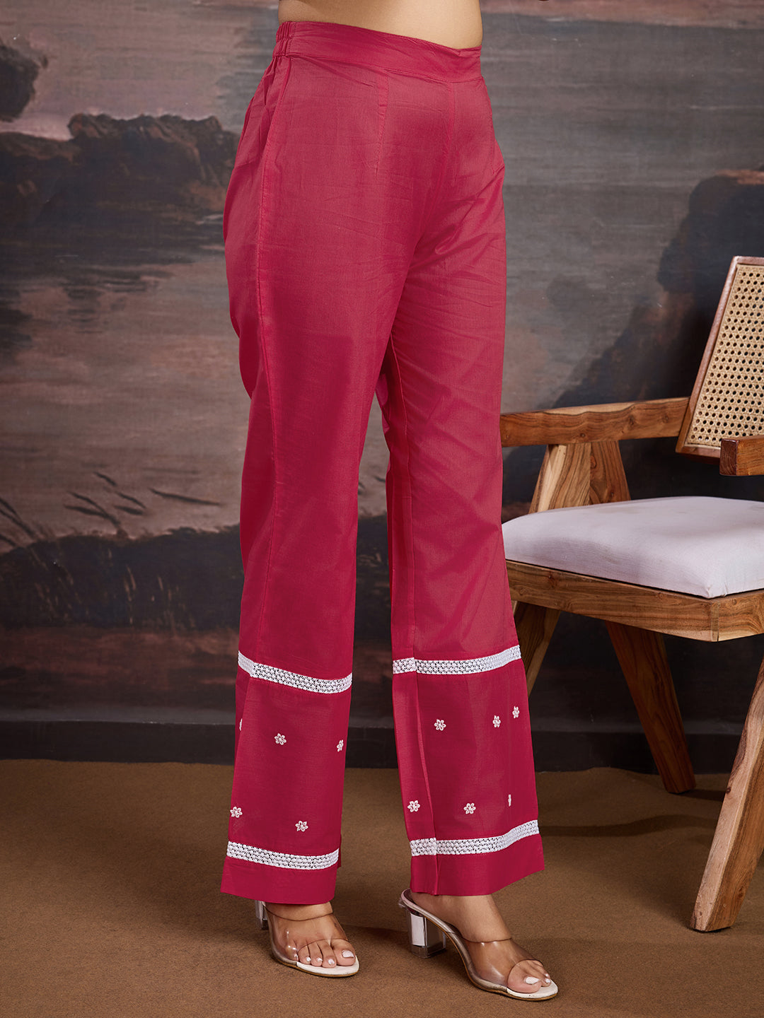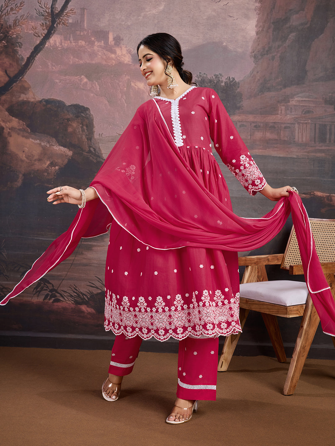 Elevate your ethnic wardrobe with our Floral Thread Embroidered A-Line Kurta & Trousers With Dupatta. The vibrant red and white color scheme, delicate floral thread embroidery, and V-neckline exude elegance. The A-line shape and flared hem of the kurta create a flattering silhouette. The trousers feature a partially elasticated waistband for comfort and a slip-on closure for easy wear. Complete the look with the coordinating red dupatta featuring a taping border for a touch of sophistication. Made from a machine-weave regular cotton blend for durability and comfort. Order now for an effortlessly chic ethnic ensemble.