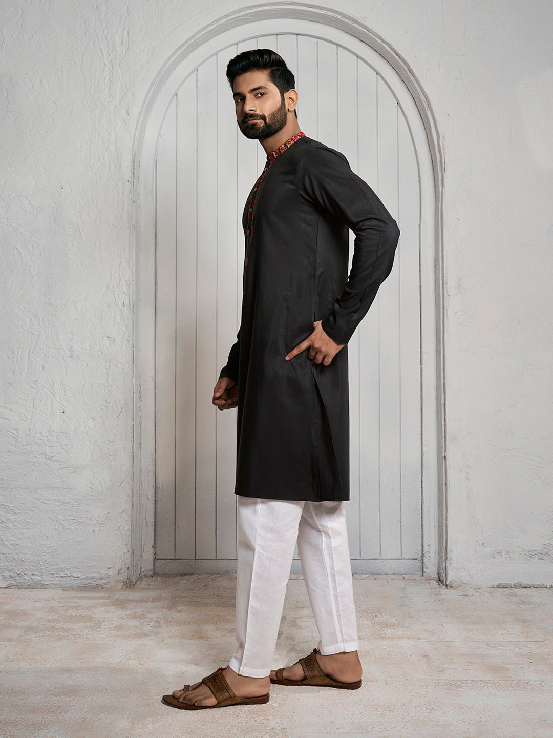 Add a touch of elegance to your wardrobe with our black Floral Yoke Design Mandarin Collar Straight Kurta. This knee-length kurta features a beautiful floral yoke design and a mandarin collar for a sophisticated look. Made with high-quality cotton blend fabric, it is soft and comfortable to wear. Perfect for any occasion, it can be easily paired with your favorite bottoms. Dry clean recommended for long-lasting wear.