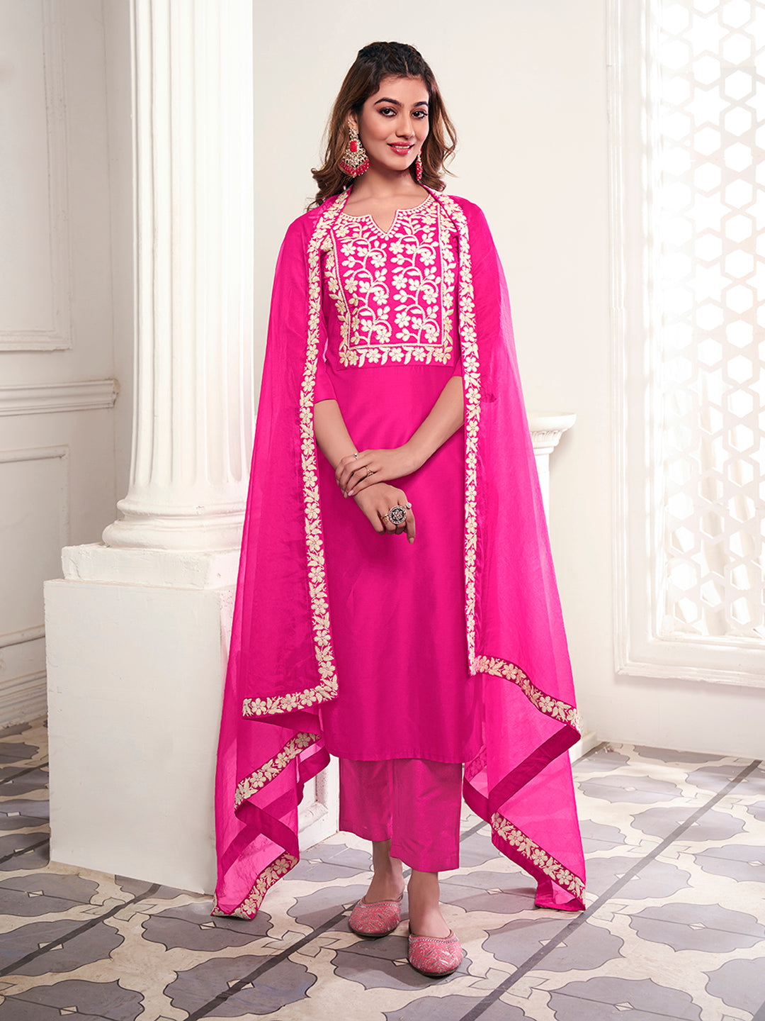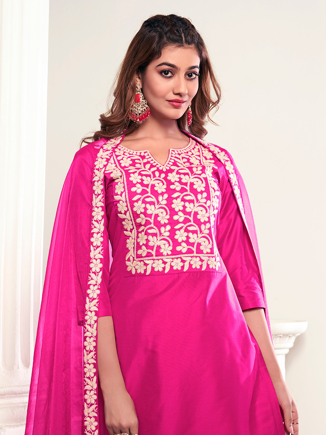 Expertly designed with a magenta and white floral yoke, this Kurta with Trousers and Dupatta set is both elegant and comfortable. The silk blend fabric and thread work detail add a touch of sophistication, making it perfect for any occasion. The trousers feature a partially elasticated waistband and slip-on closure for a perfect fit. Dry clean only.