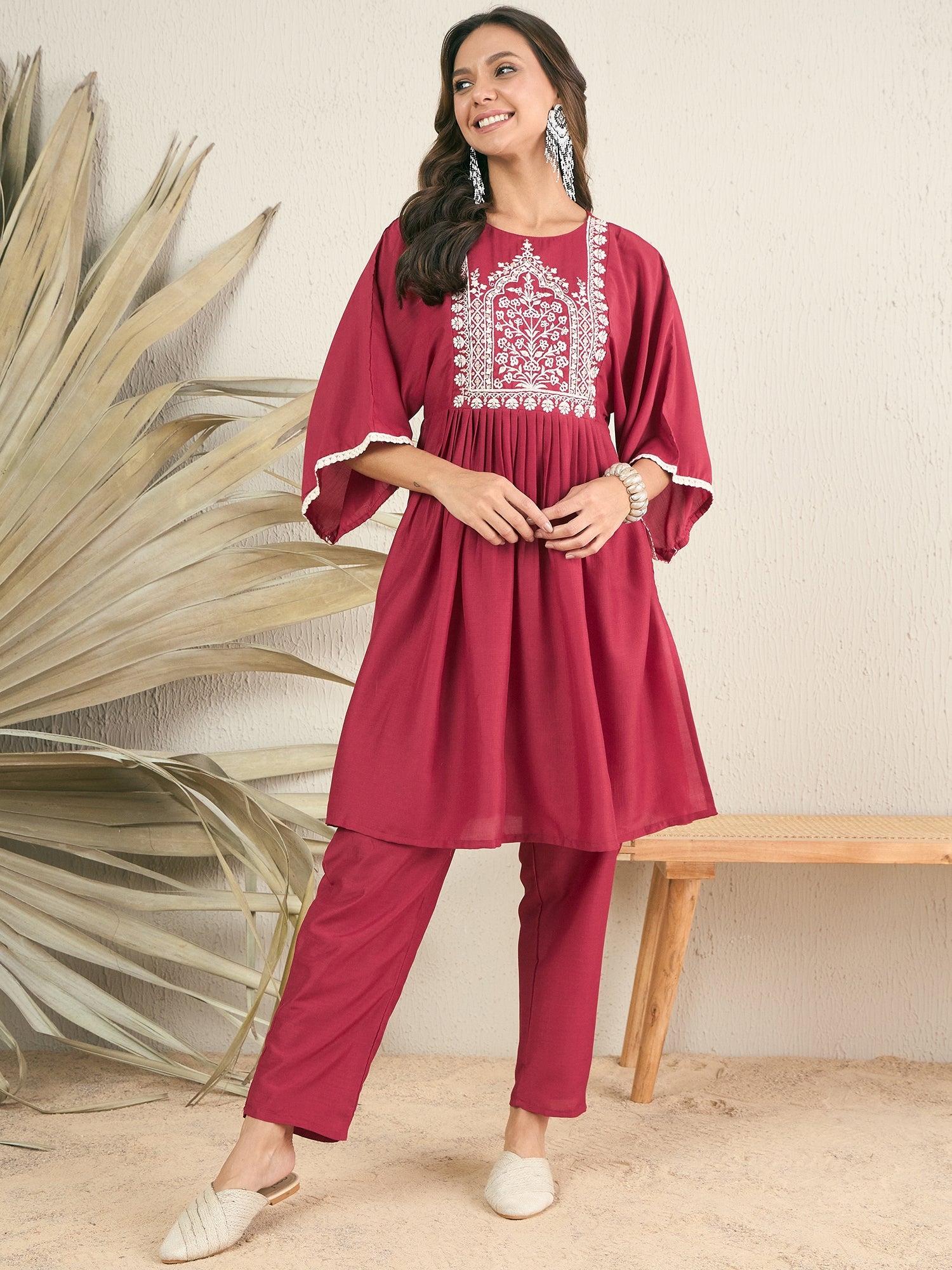 Experience elegance and comfort with our Floral Yoke Design Pleated Thread Work A-Line Kurta paired with Trousers. The red and white yoke design adds a touch of sophistication while the pleated style and flared sleeves provide a flattering silhouette. Made with a cotton blend fabric, this kurta is perfect for any occasion.