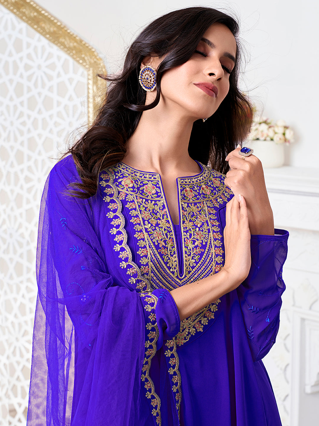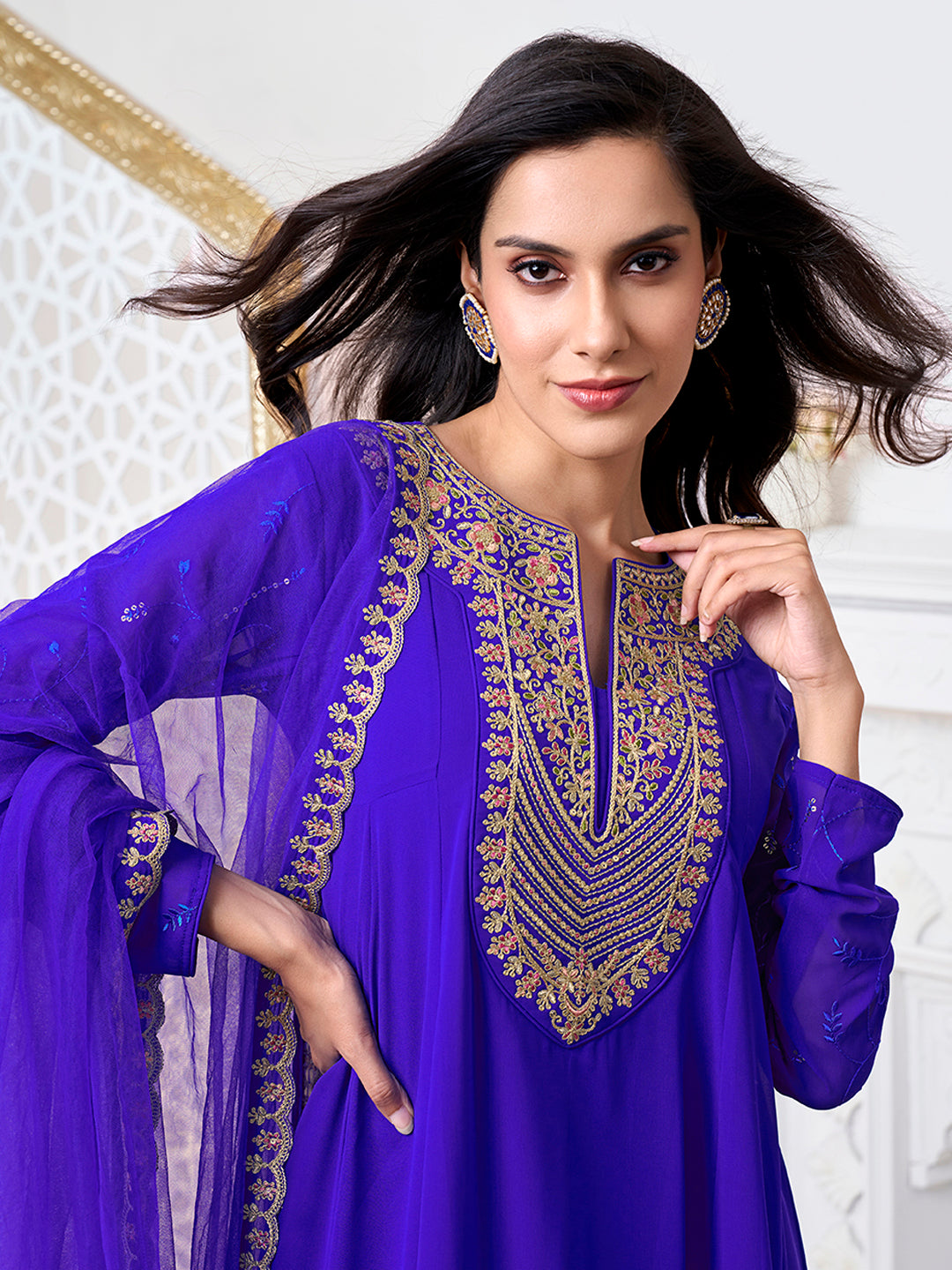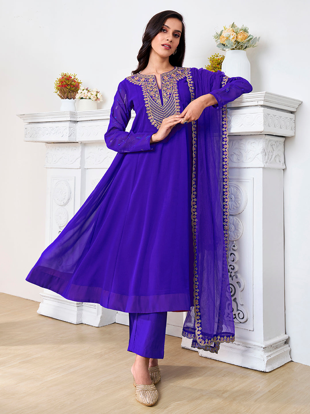 Look timeless and elegant in our blue and gold toned floral yoke design kurta with matching trousers and dupatta. The zari detail and calf length hem add a touch of sophistication to the A-line shape. Made with georgette fabric, the kurta features a notch neck and long sleeves for a comfortable yet stylish fit. The solid trousers with a partially elasticated waistband and the solid dupatta with a taping border complete this stunning ensemble. Perfect for any formal occasion.