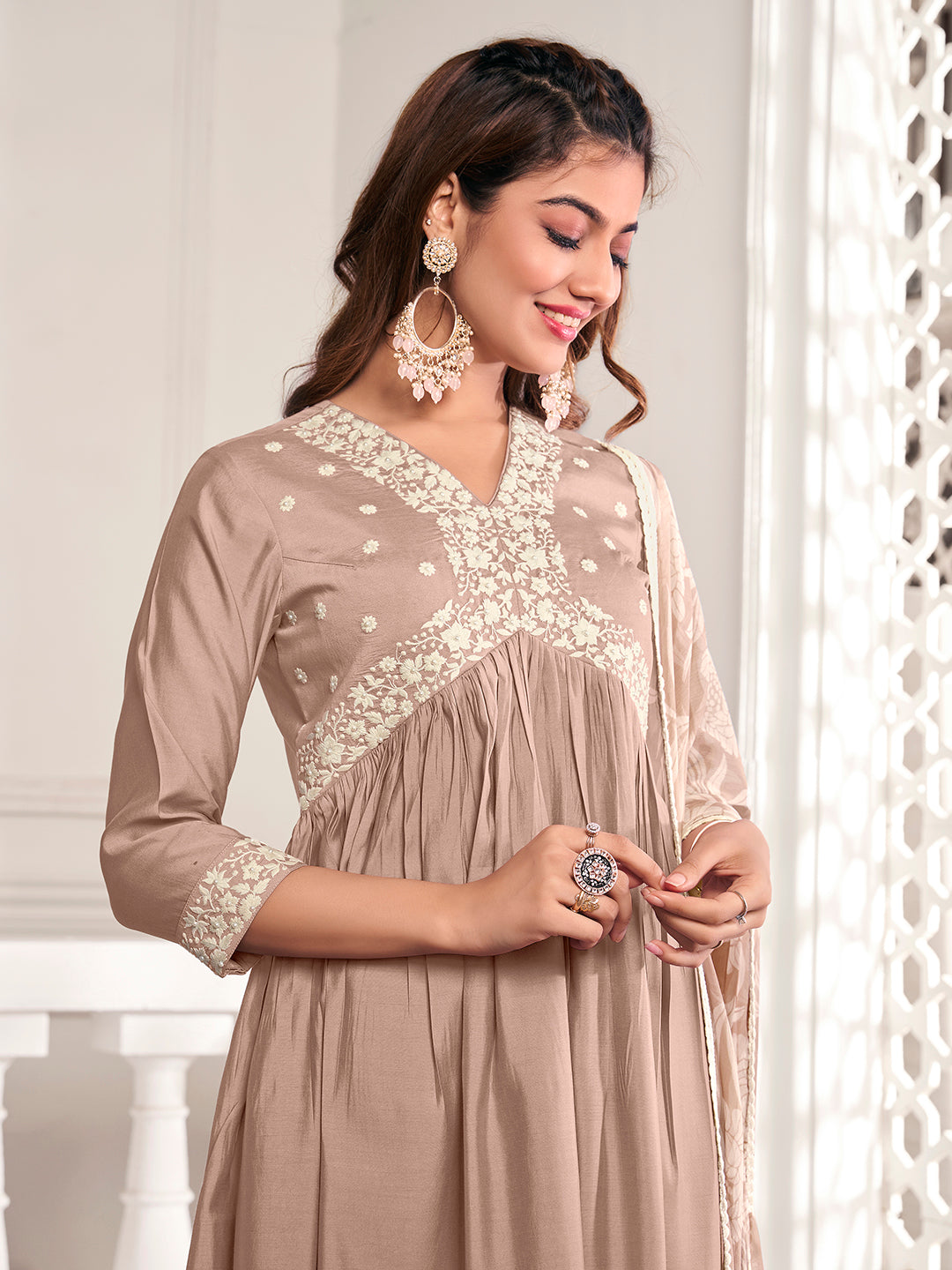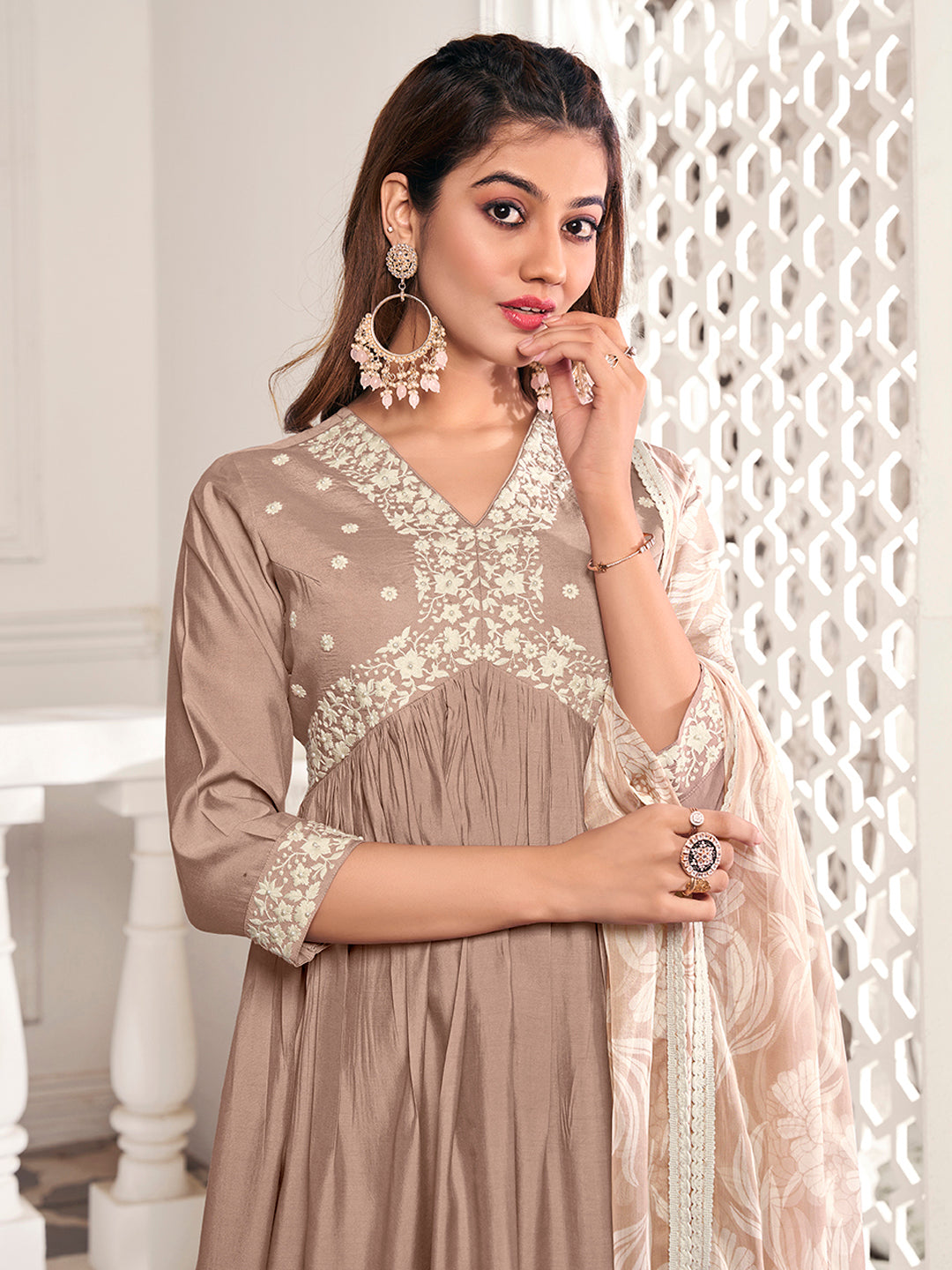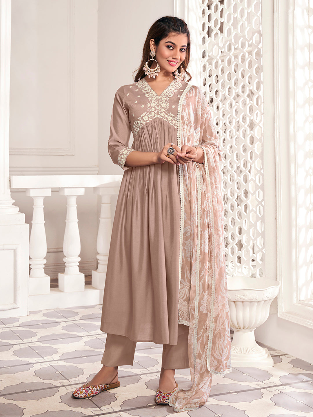 Add a touch of elegance with our Floral Yoke Design Anarkali Kurta and Trousers set. The pleated kurta features a beautiful floral yoke design and intricate thread work for a sophisticated look. The silk blend fabric adds comfort and luxury. Paired with solid trousers and a printed dupatta with taping border for a complete set. Dry clean recommended.