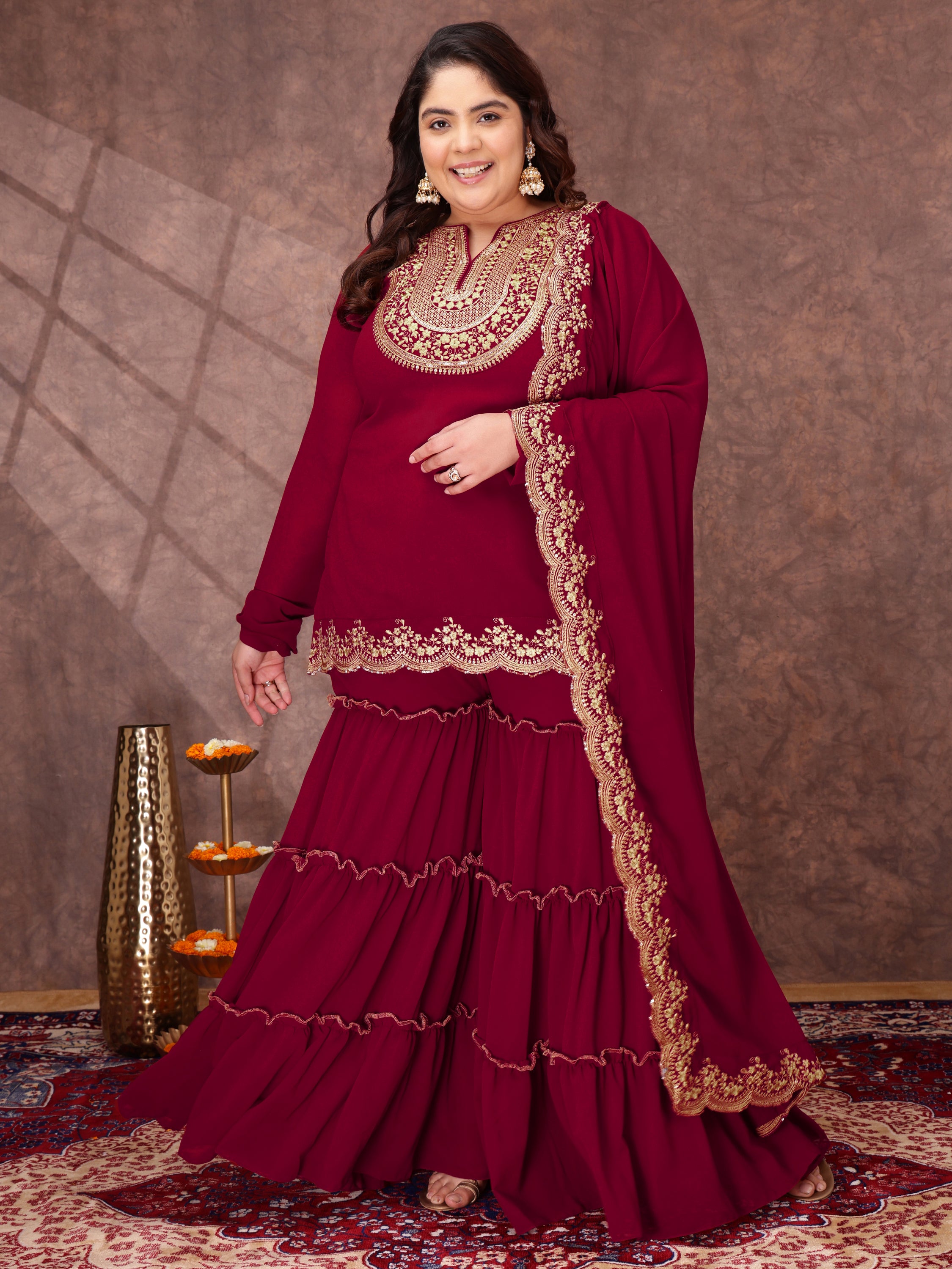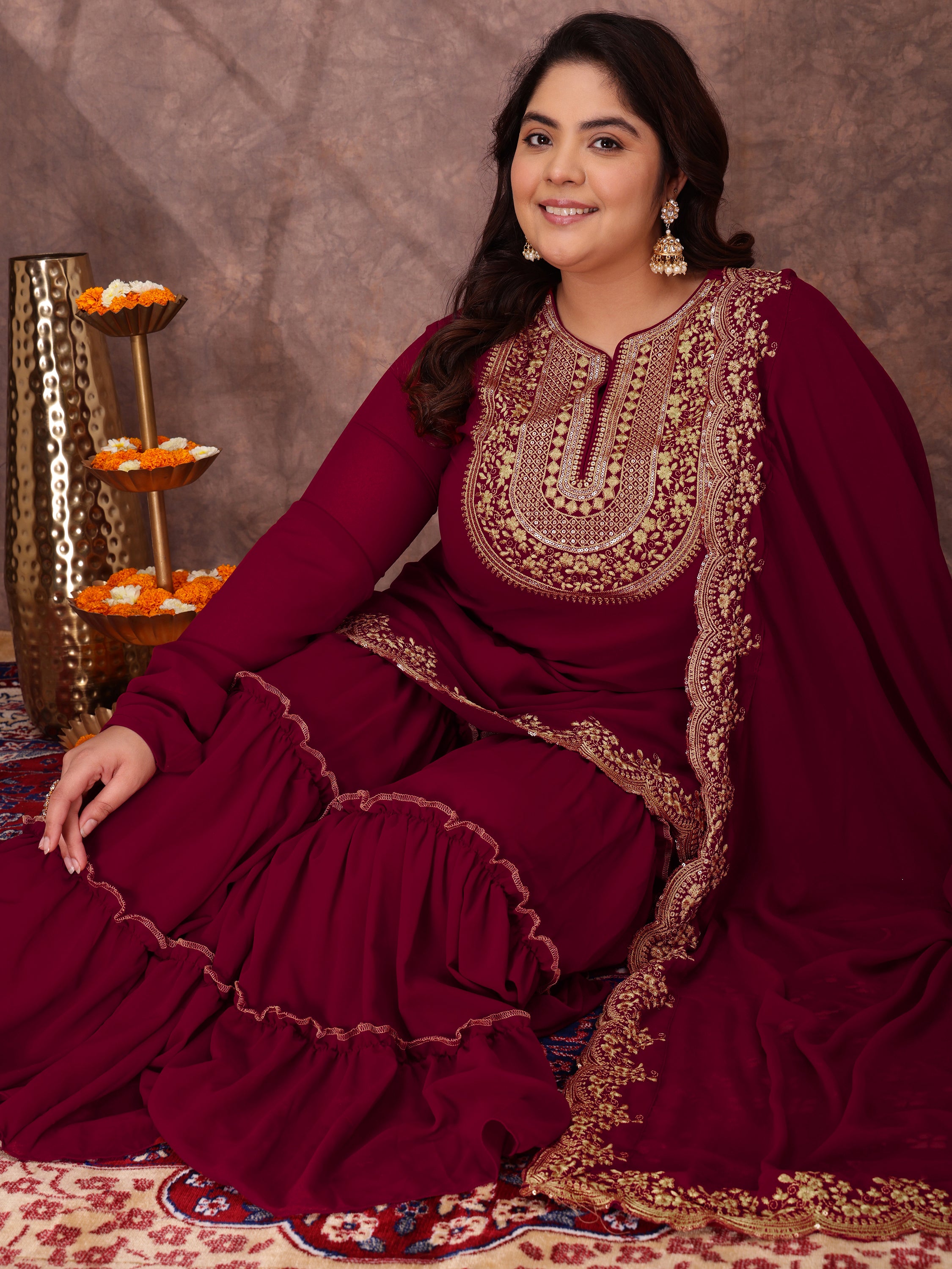 Maroon and gold-toned embroidered kurta set