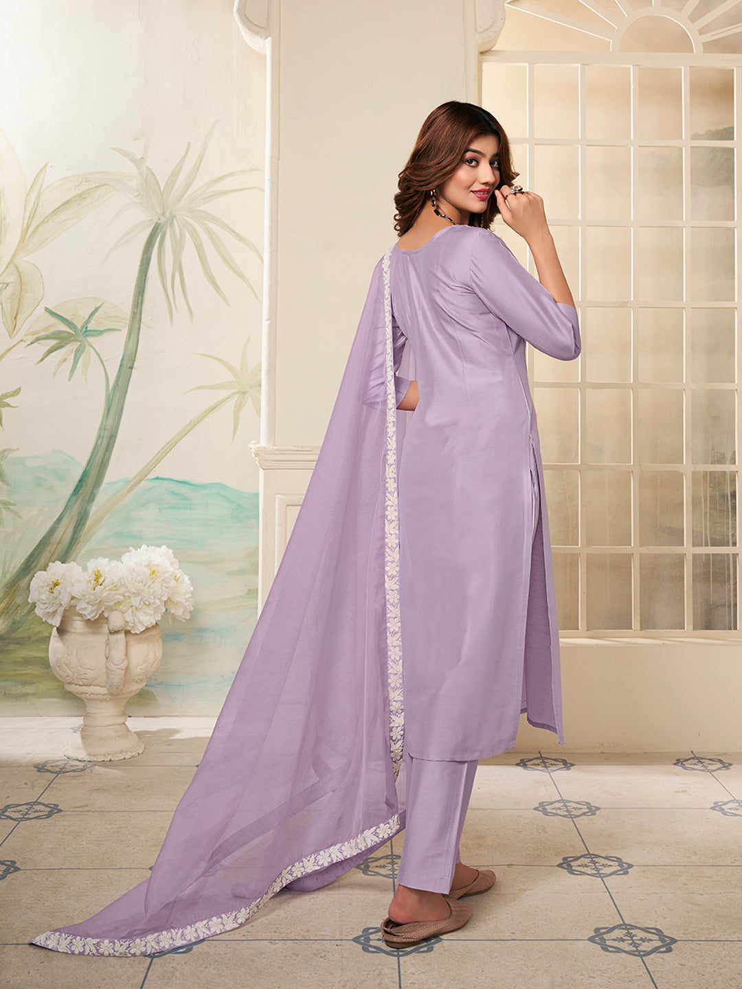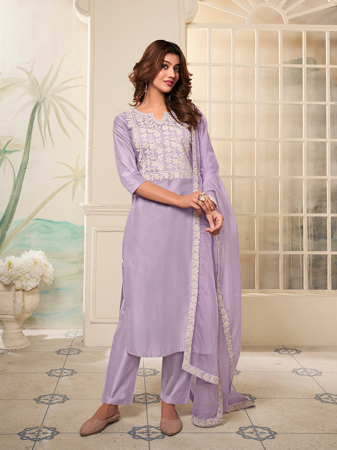 Expertly crafted silk blend kurta set, featuring a stunning mauve floral yoke design. With a straight shape and regular style, this kurta offers comfortable three-quarter sleeves, 2 pockets with delicate thread work, and a calf-length straight hem. Paired with solid trousers, partially elasticated for a perfect fit, and a matching dupatta in sheer organza fabric. Dry clean only.