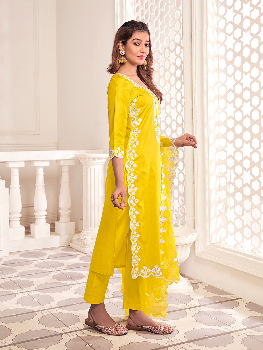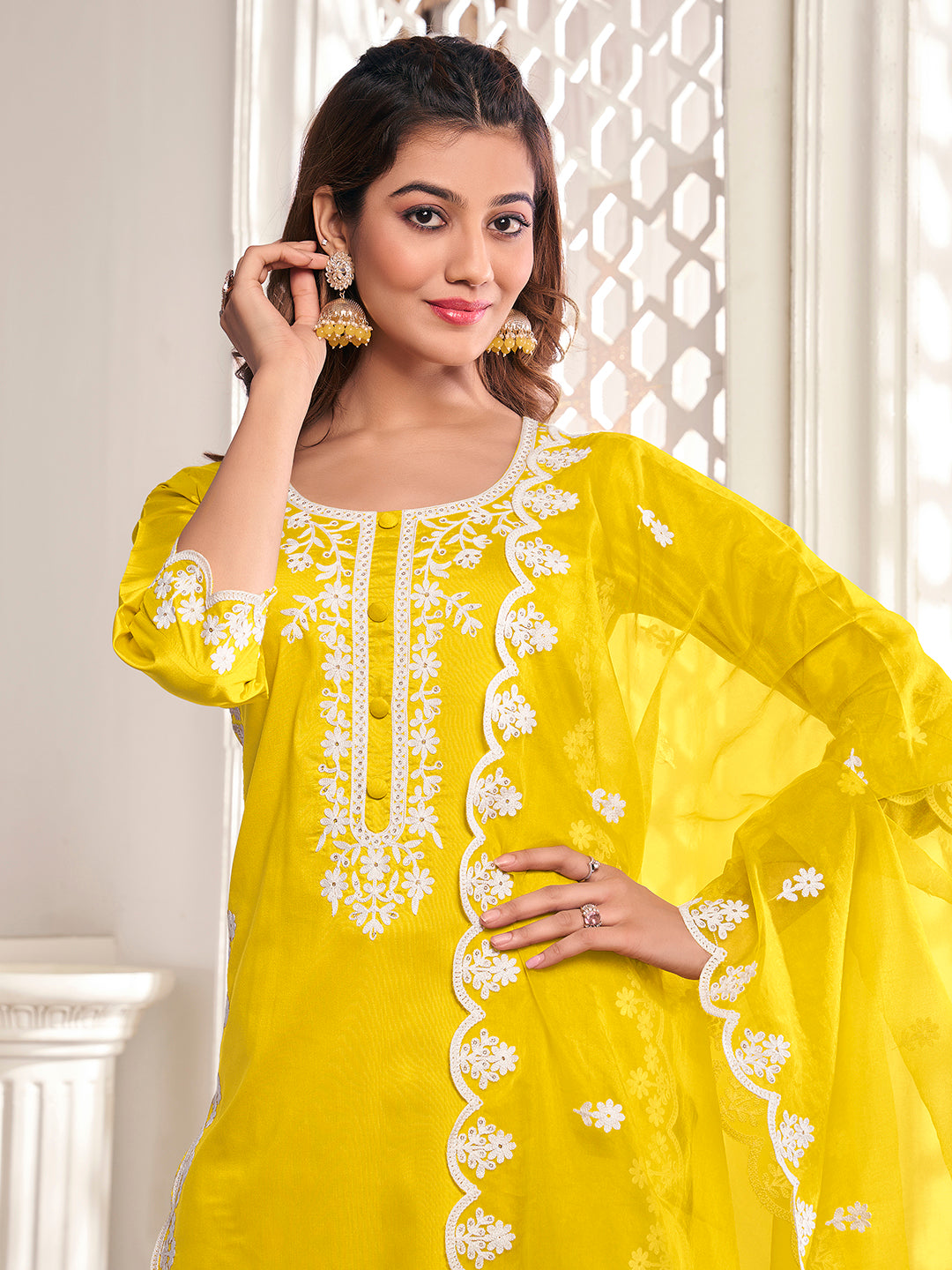 Upgrade your traditional wardrobe with our Floral Yoke Design Thread Work Kurta, featuring a beautiful yellow floral yoke design and thread work detailing. The silk blend fabric adds a luxurious touch to the straight, regular fit kurta and solid trousers. Complete the look with the included dupatta for a sophisticated and elegant ensemble. Dry clean only.