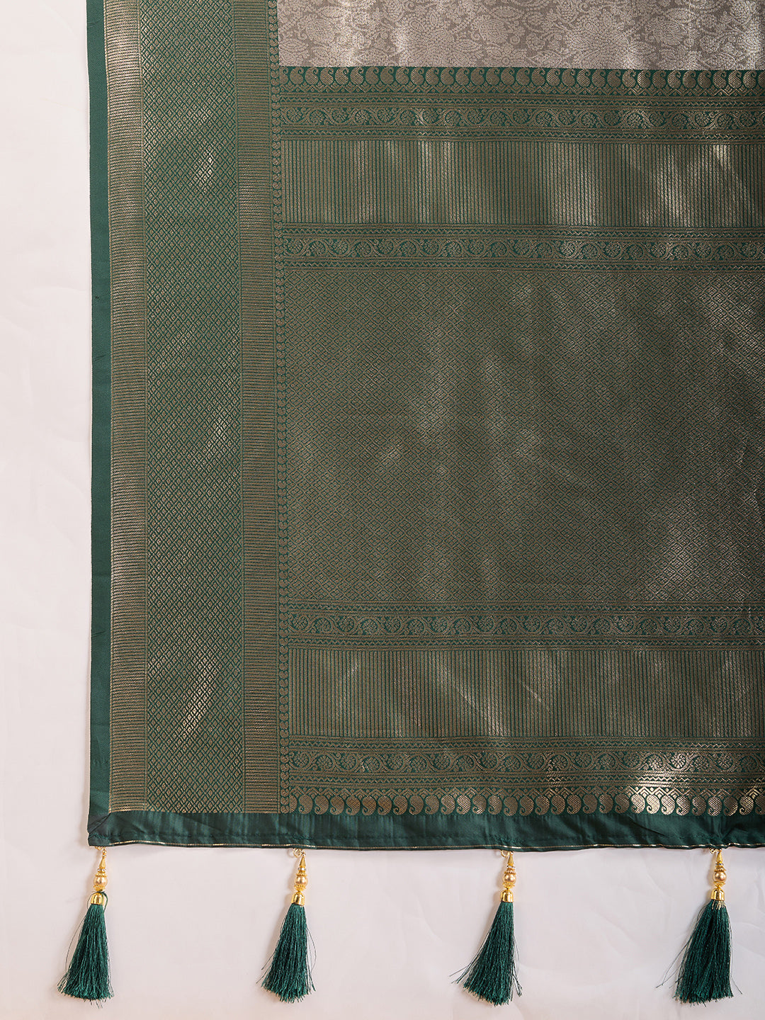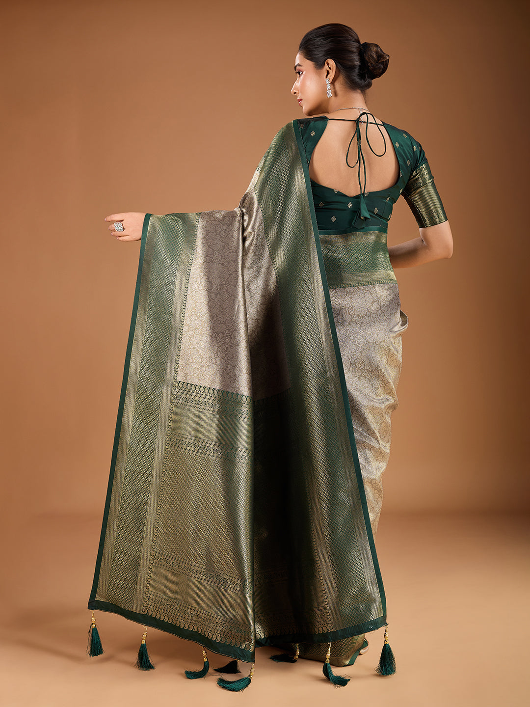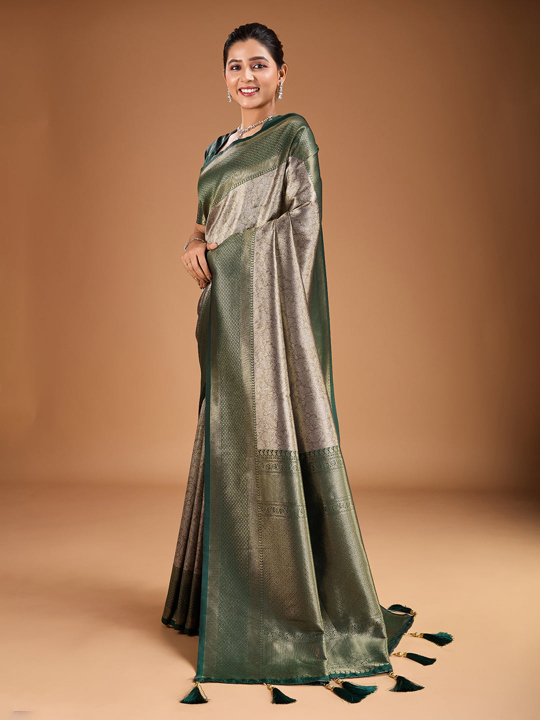 Elevate your traditional wardrobe with our Floral Zari Woven Design Tassels Saree. Featuring a beautiful brown and green color combination, this saree is adorned with intricate woven design and zari work, along with delicate floral detailing. The saree comes with an unstitched blouse piece, giving you the freedom to customize the fit to your liking. Experience elegance and grace with every wear.