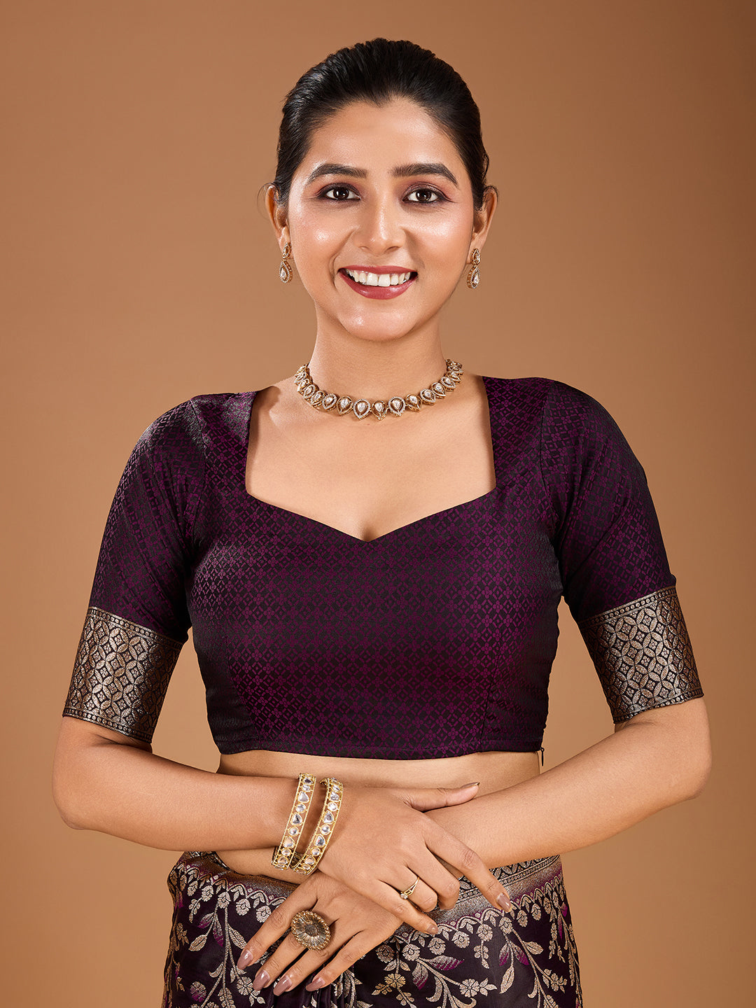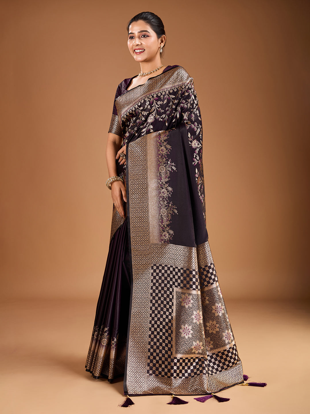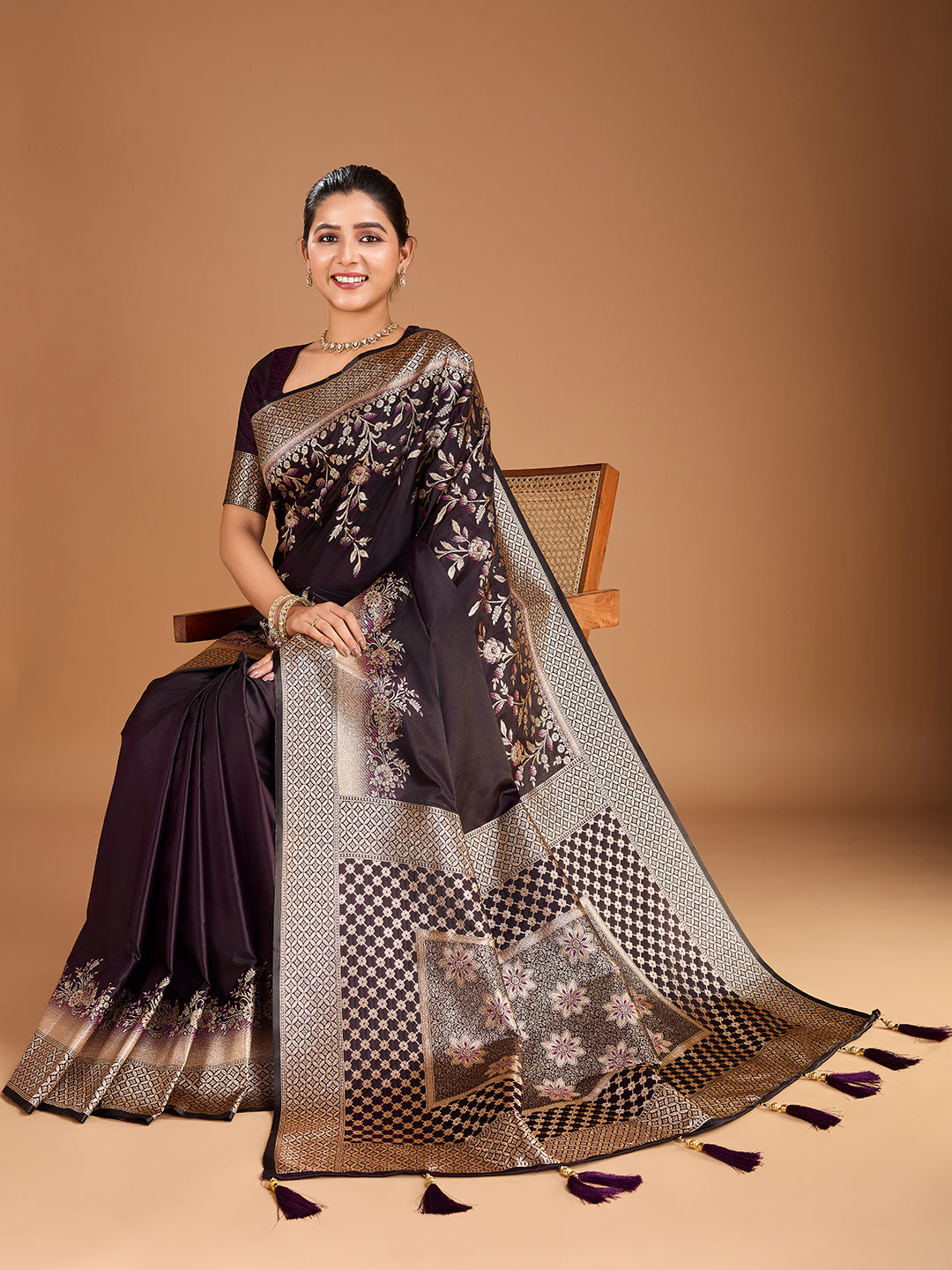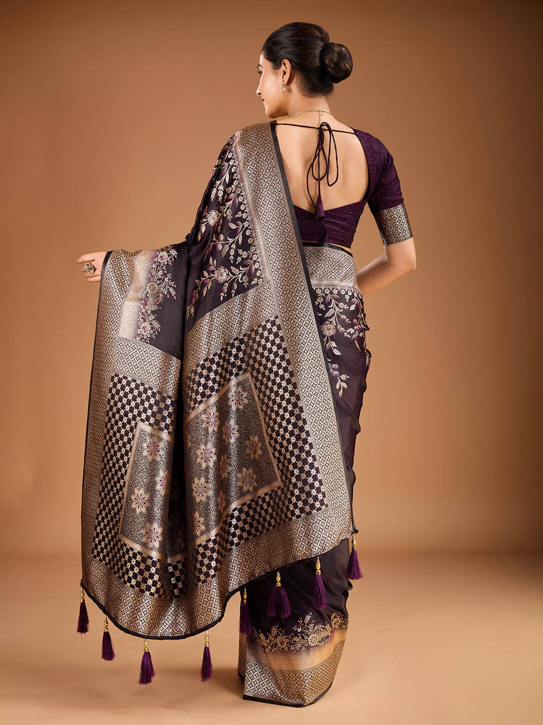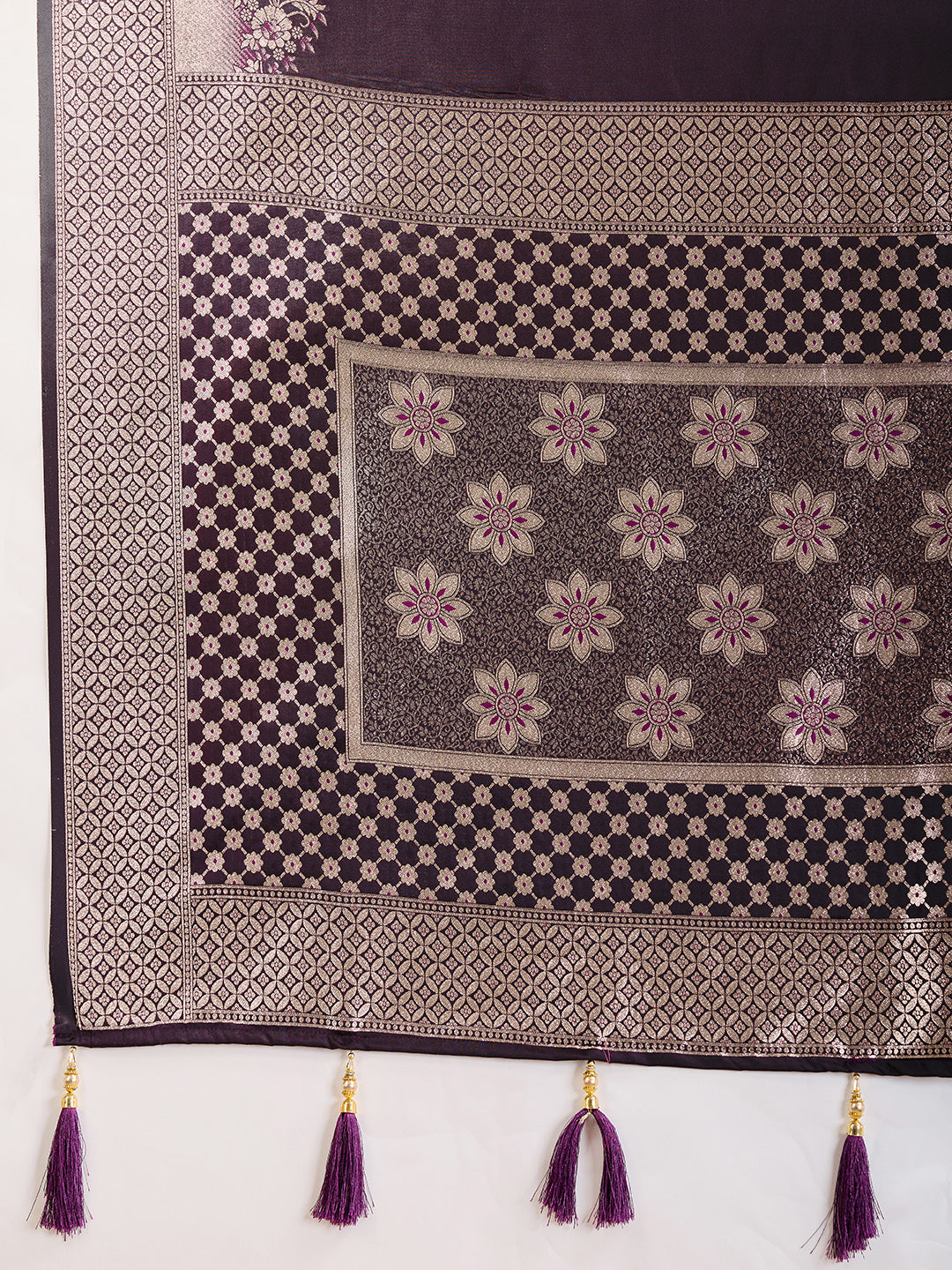 This stunning Floral Zari Woven Design Tassels Saree features a beautiful combination of purple and gold tones. The woven design adds intricate detail to the saree, making it a unique and eye-catching piece. And with the inclusion of an unstitched blouse piece, this saree offers customizable options for any occasion.