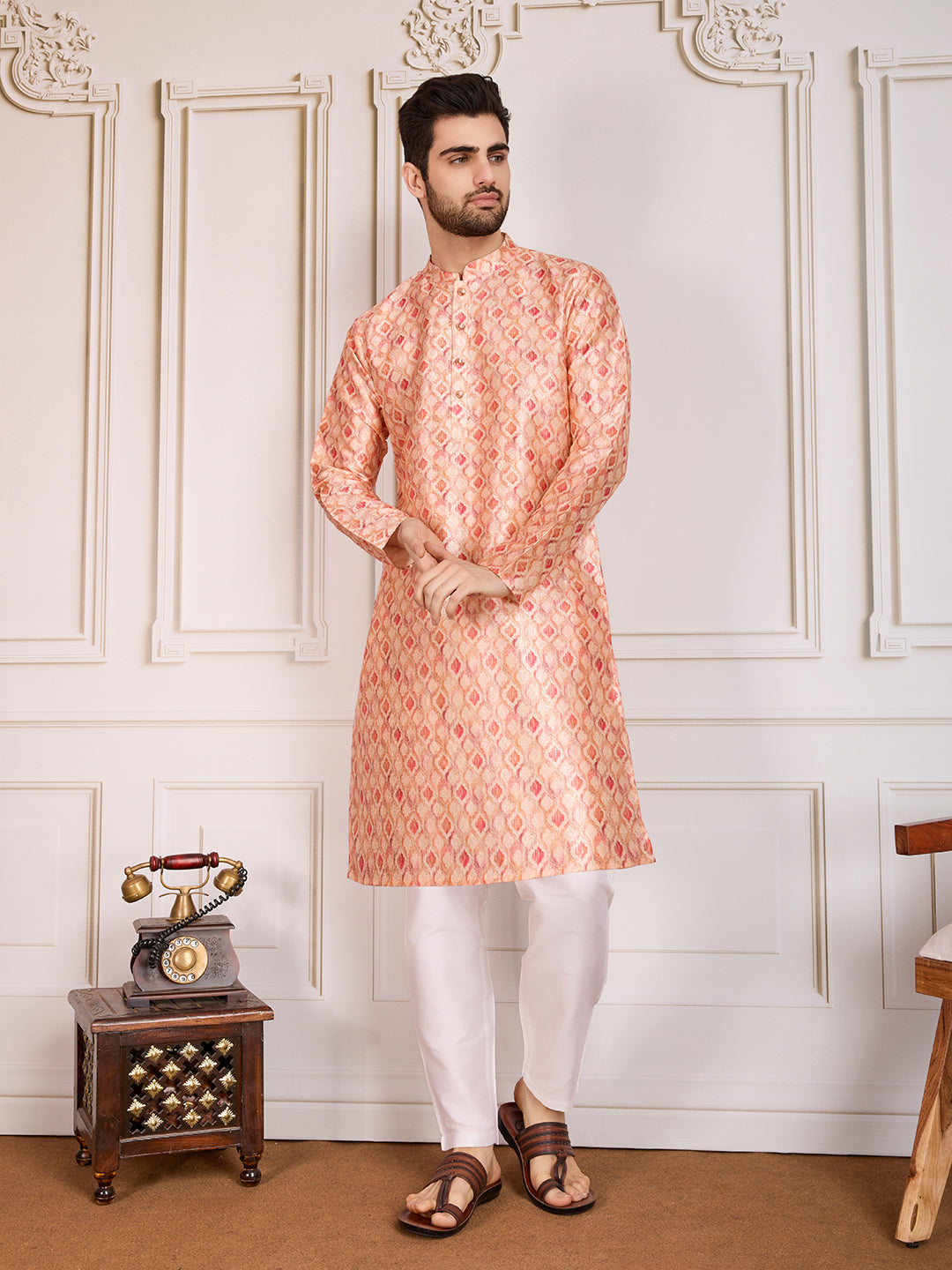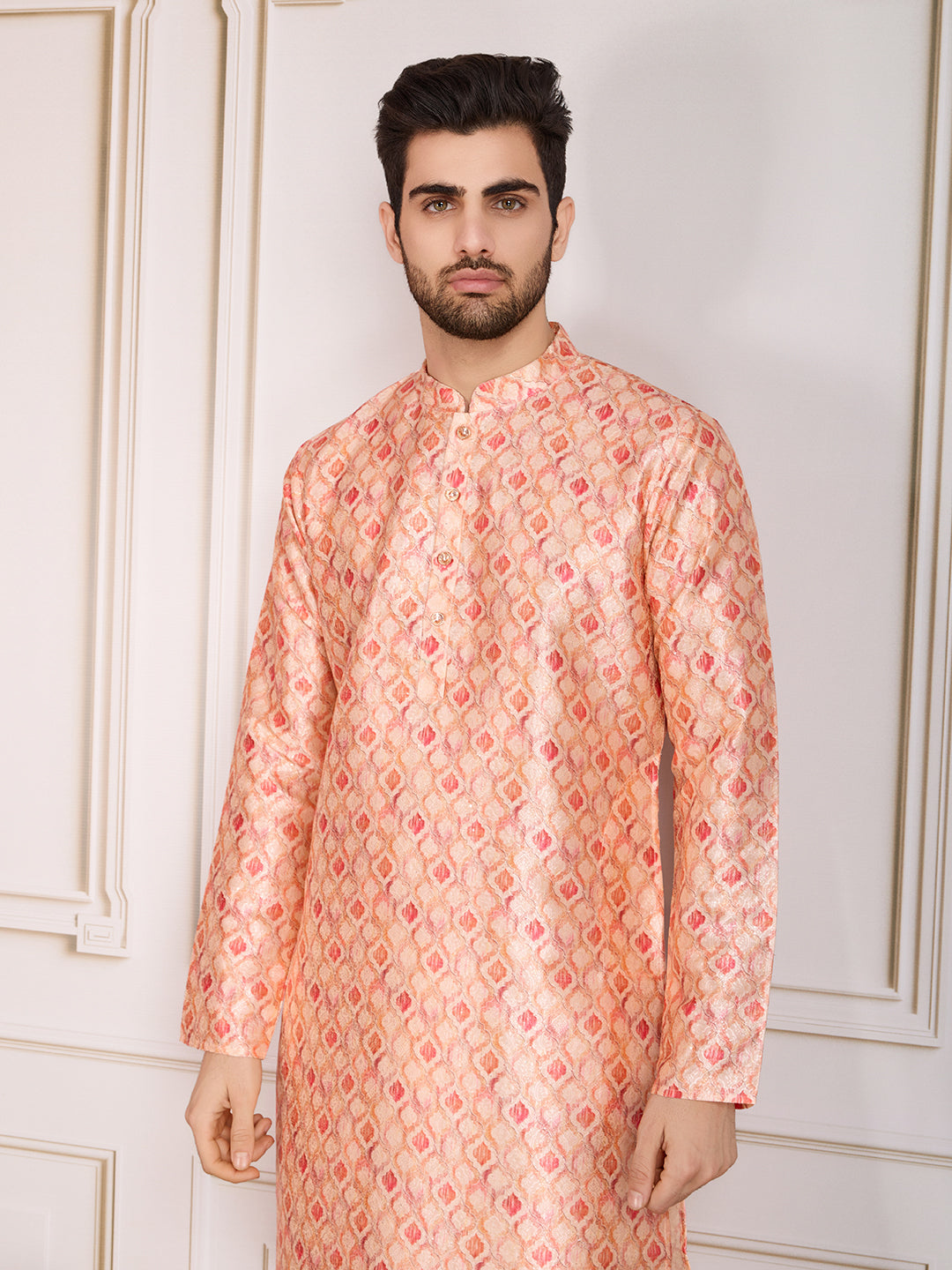 Elevate your style with our Peach-colored Geometric Kurta Set. The digital print and sequin embellishments add a touch of glamour while the mandarin collar and side slits keep it elegant. Made with regular silk blend, this set includes a knee-length kurta and comfortable trousers with a zip closure.