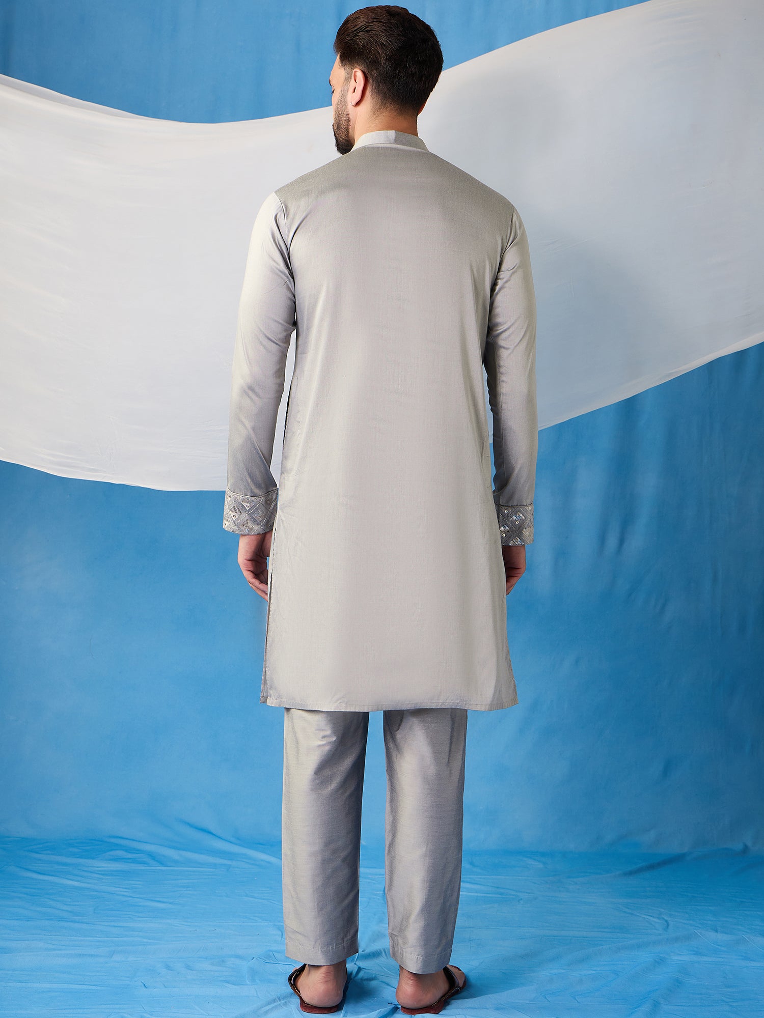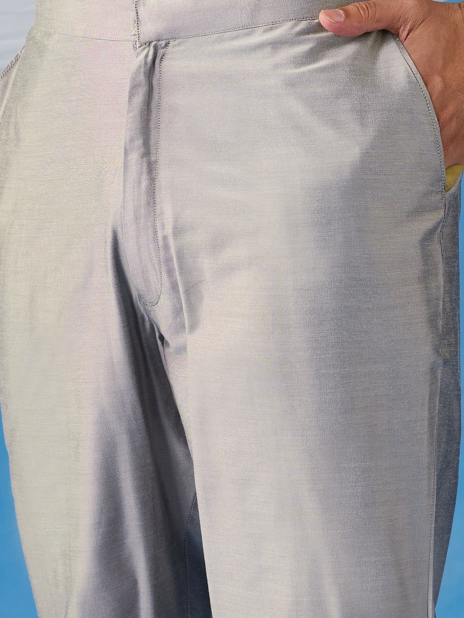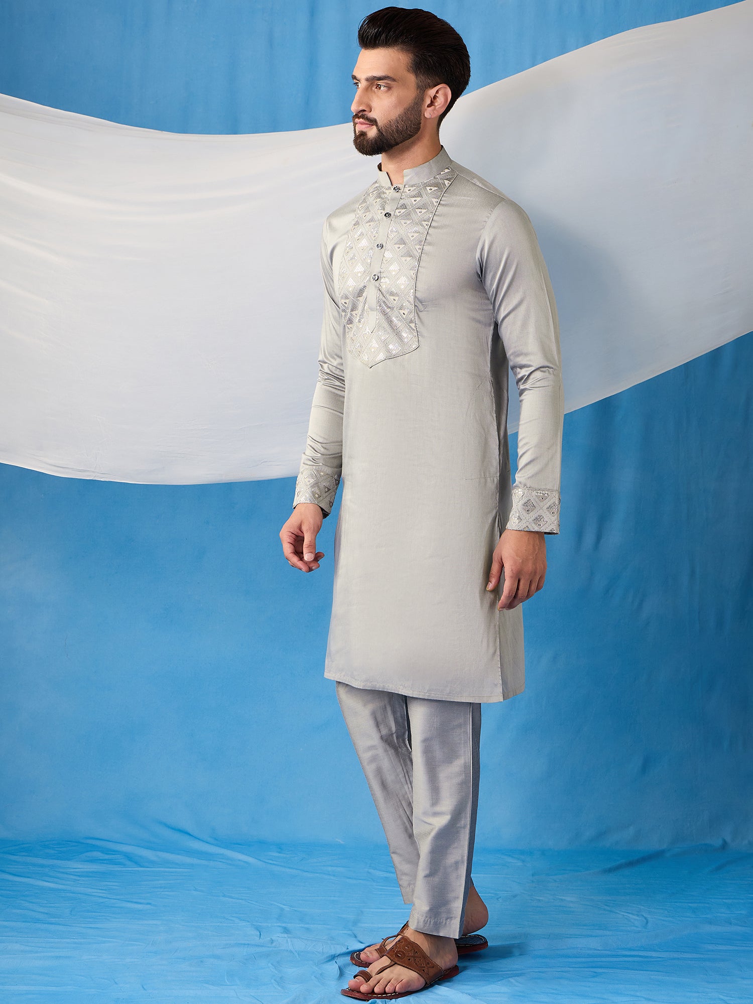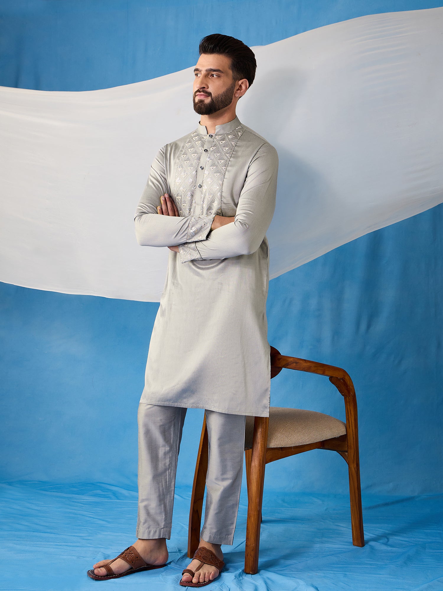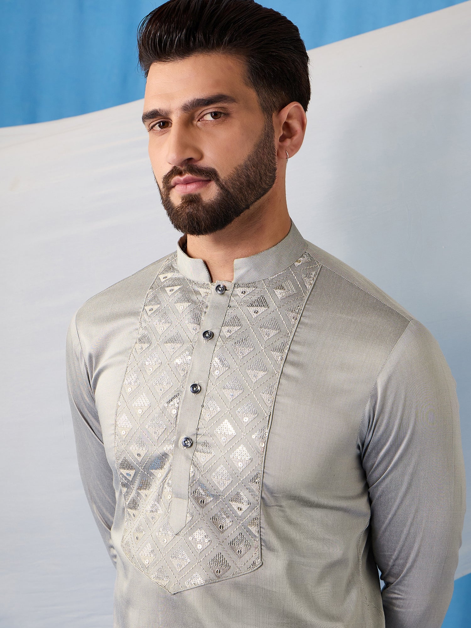 Elevate your style with our Grey & Silver-toned Kurta and Trousers set. The geometric yoke design, thread work, and sequin detailing add a touch of elegance. Made from a silk blend machine weave fabric, the kurta features a mandarin collar, long sleeves, and knee length with a straight hem. The solid trousers have a partially elasticated waistband and hook and eye/zip closure for a comfortable fit.