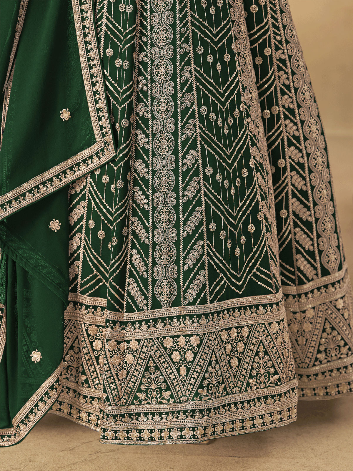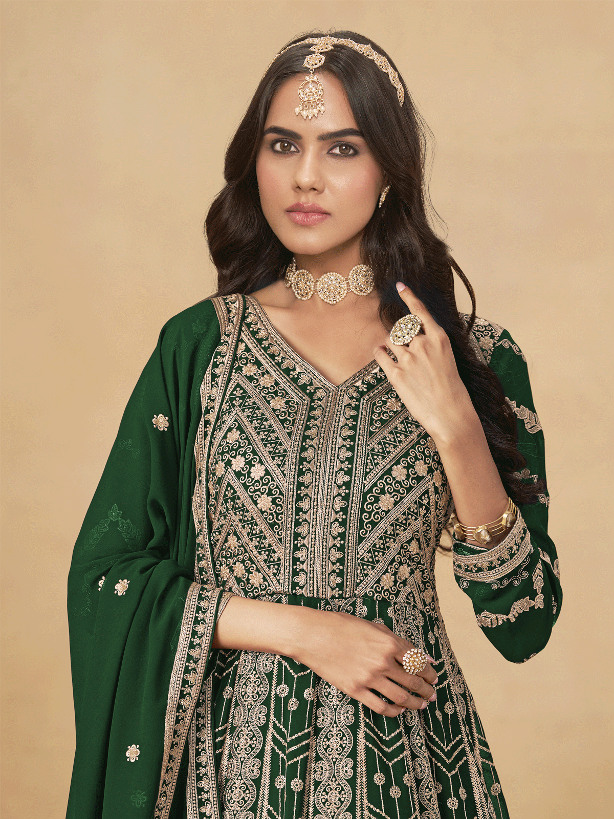 Experience timeless sophistication with this Bottle Green Faux Georgette Anarkali Suit from Inddus. Meticulously crafted from premium faux georgette, this exquisite ensemble showcases elaborate front and back embroidery adorned with sequins and intricate thread detailing. The flowing silhouette and ornate embellishments create an air of regal refinement, making it an ideal choice for weddings, festivals, and formal celebrations. Perfect for those seeking authentic ethnic wear that combines traditional craftsmanship with contemporary elegance.