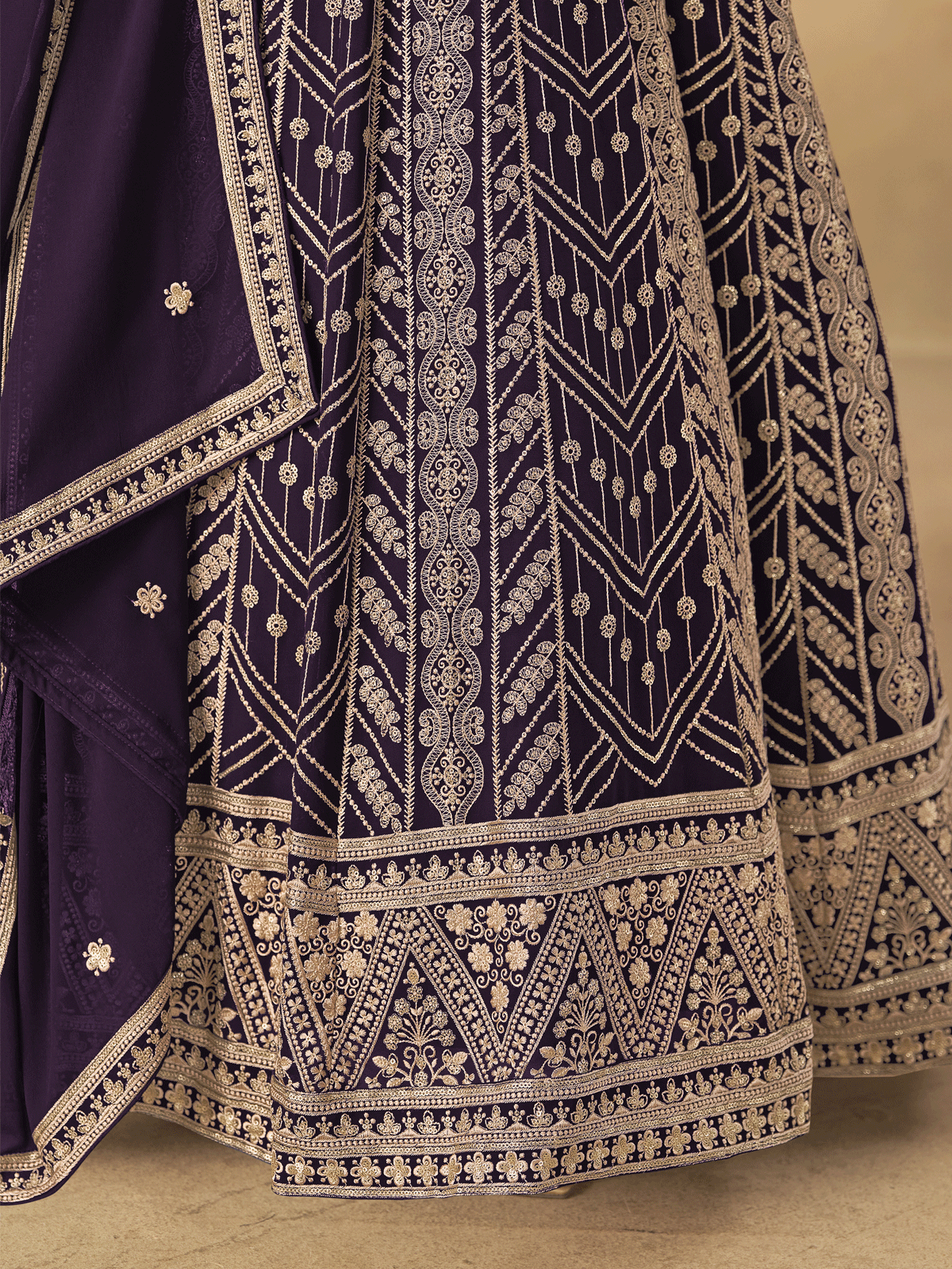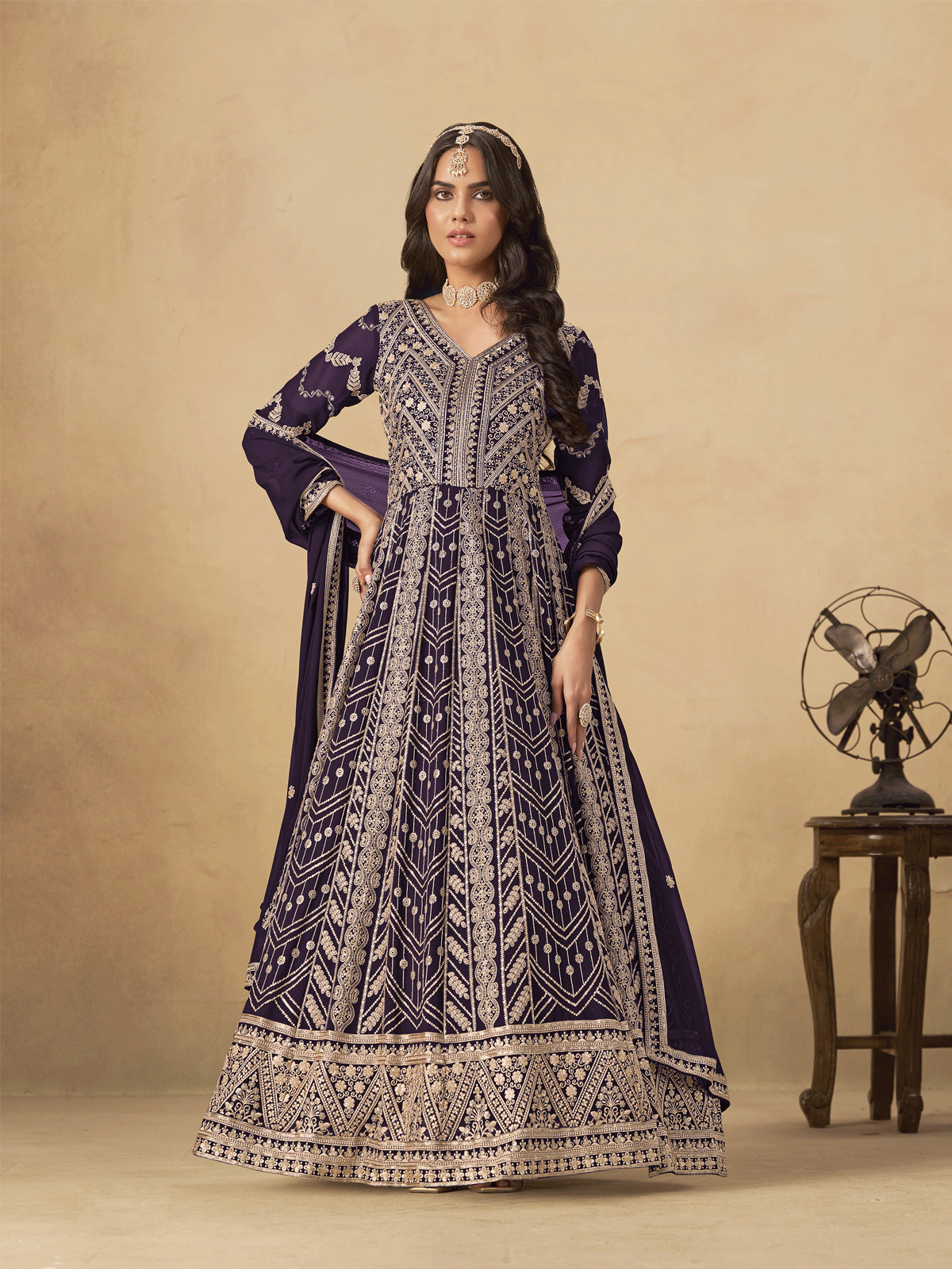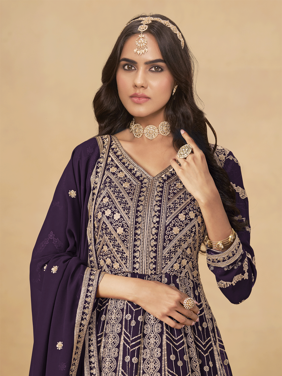Experience timeless sophistication with this Wine Purple Georgette Anarkali Suit from Inddus. Expertly tailored from premium faux georgette, this piece showcases meticulous front and back embroidery adorned with sequins and delicate thread work. The flowing silhouette and ornate detailing create an effortlessly regal aesthetic, making it an ideal choice for weddings, festivals, and formal celebrations. A versatile investment that seamlessly transitions from traditional gatherings to contemporary events.